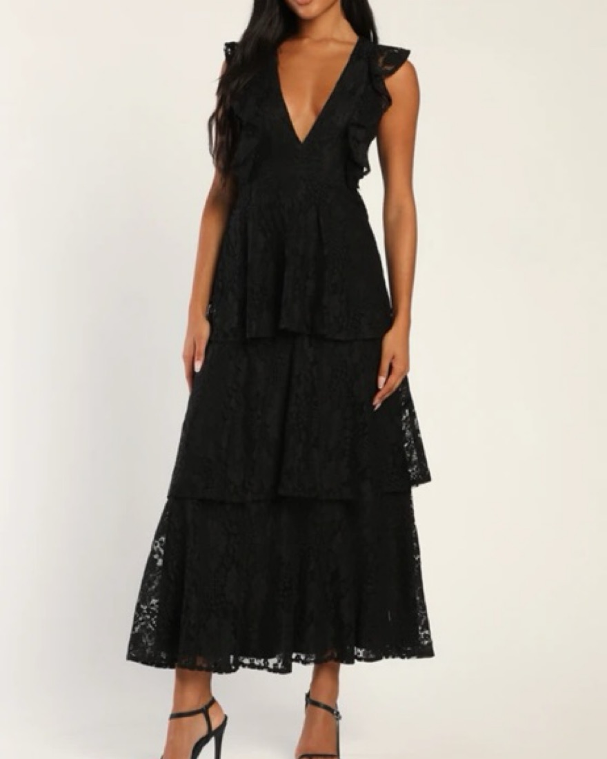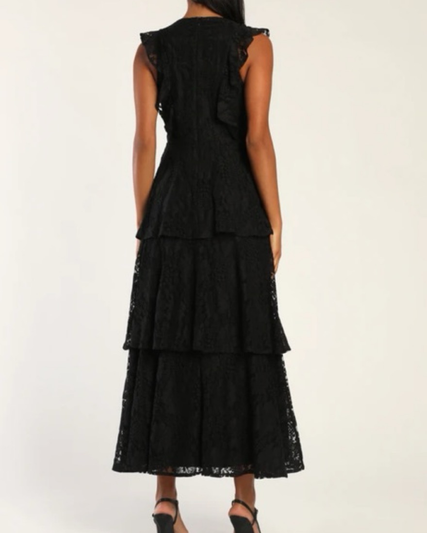Molinetto Black Lace Ruffled Tiered Sleeveless Maxi Dress. Worn once. Renting or selling for best offer.