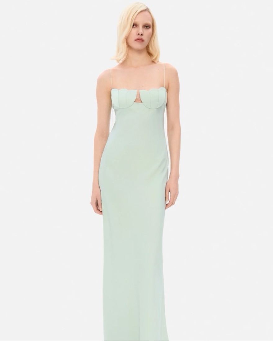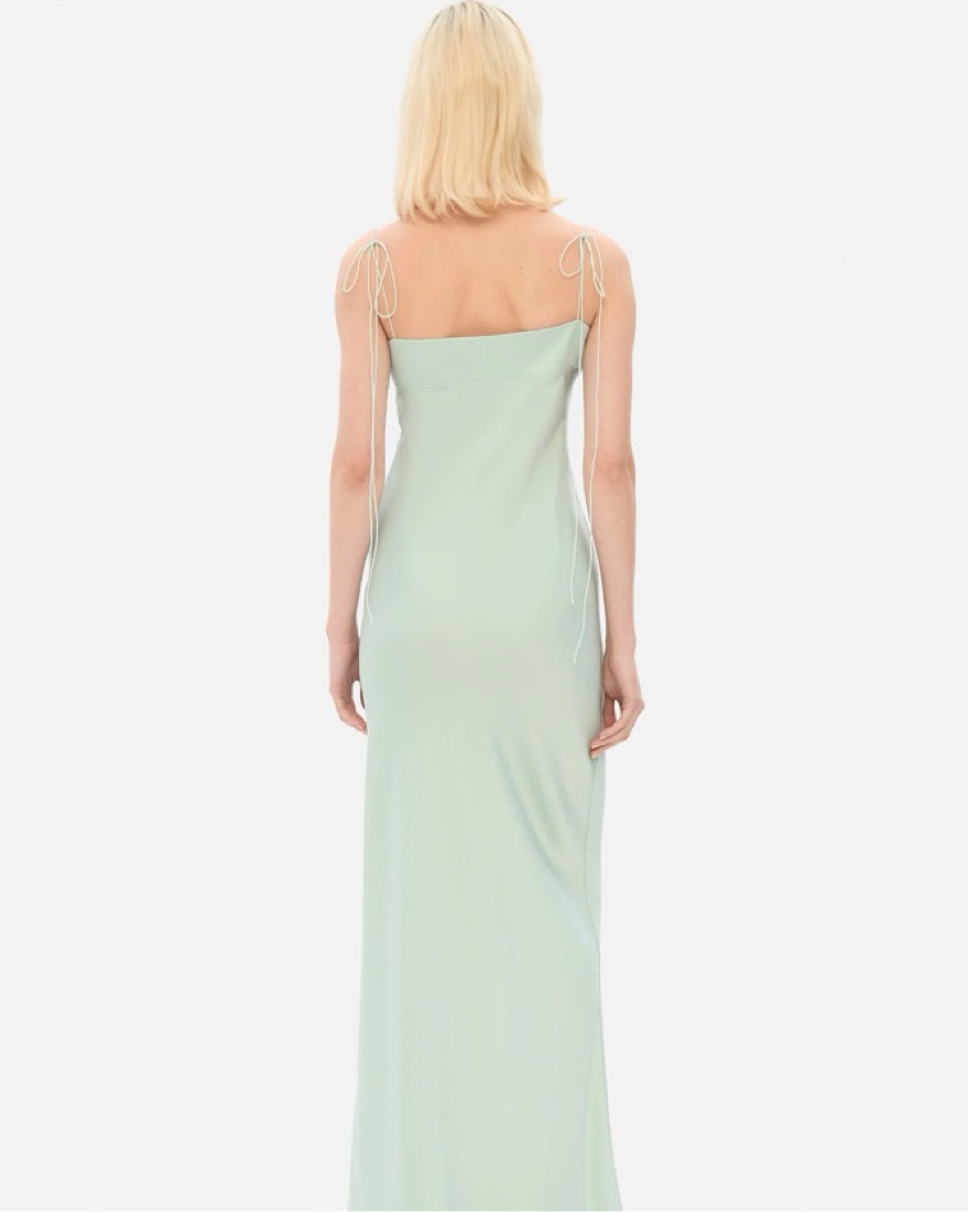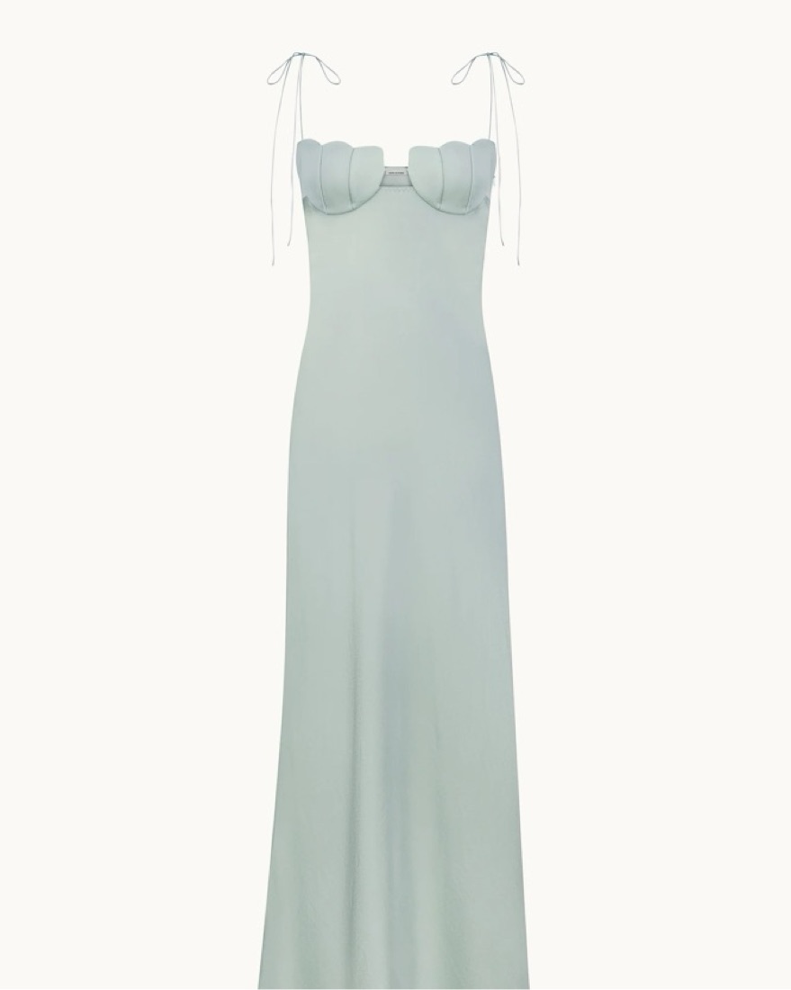 The Tulip Maxi Dress features a fluid slip silhouette with a floor-skimming skirt and a sculpted bodice inspired by tulip petals. A center cut-out offers a subtle reveal, while adjustable self-tying straps ensure a customizable fit.