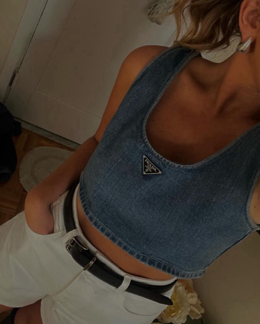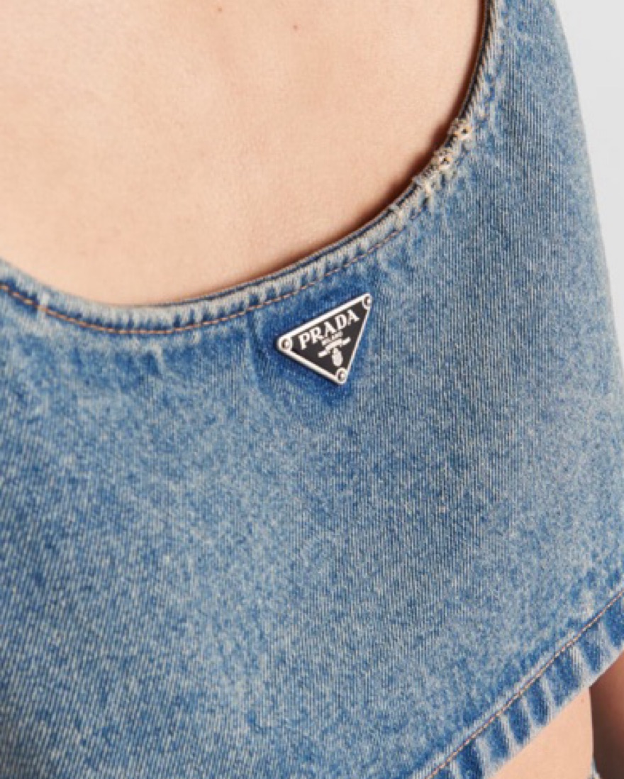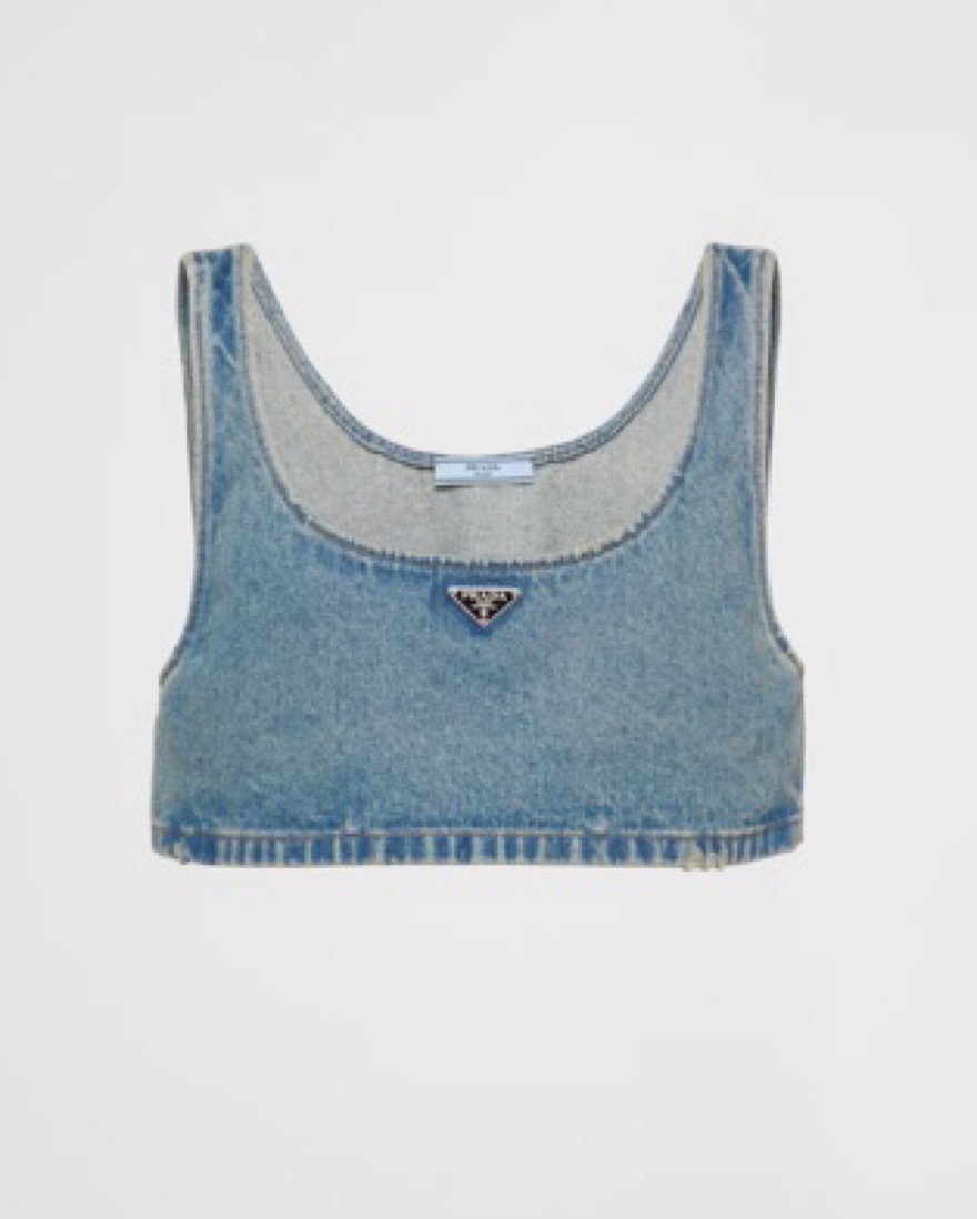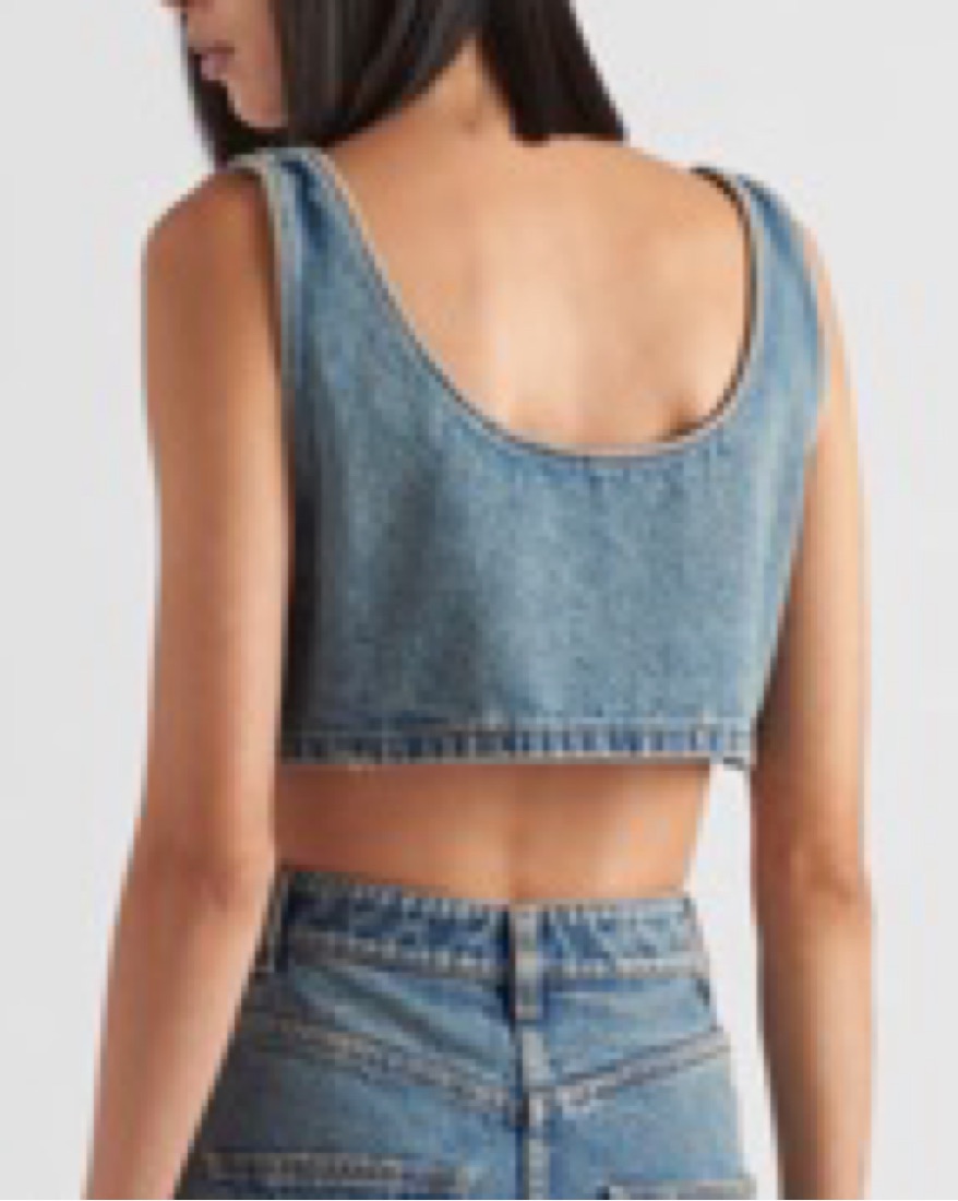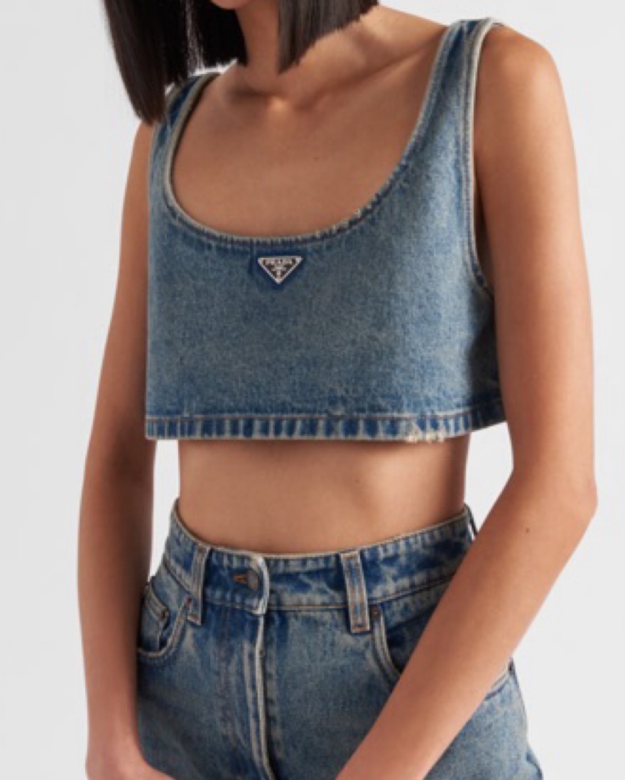 Prada denim washed crop top! The boxy silhouette of this denim top is emphasized by the washed treatment that gives the garment a worn vintage-effect finish. OVERSIZED Size S but fits like a M/L