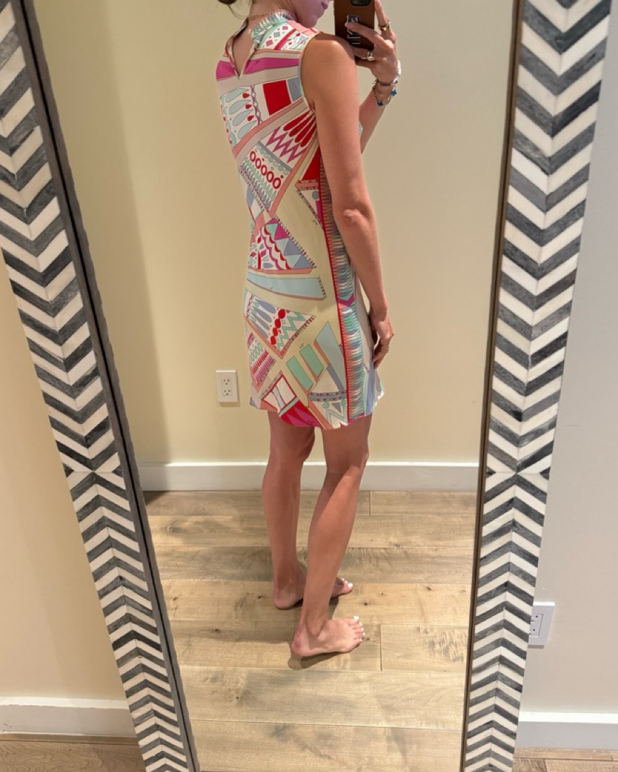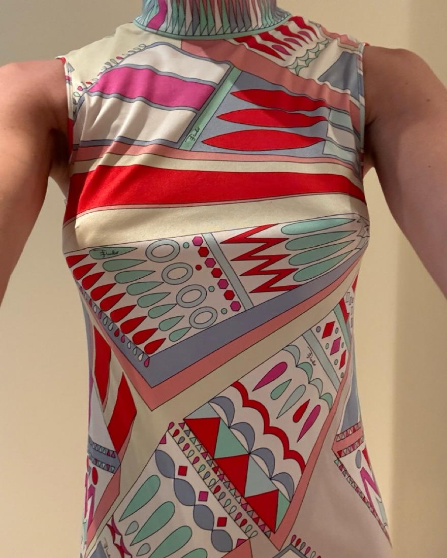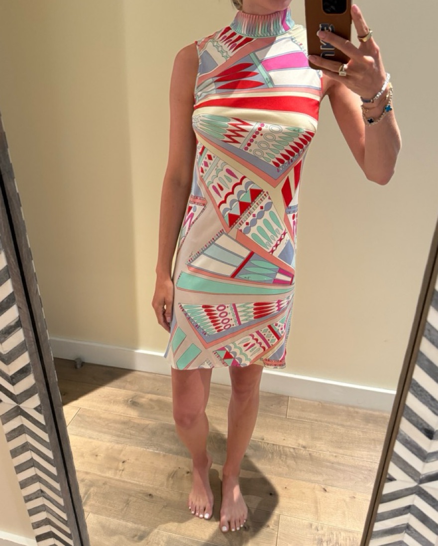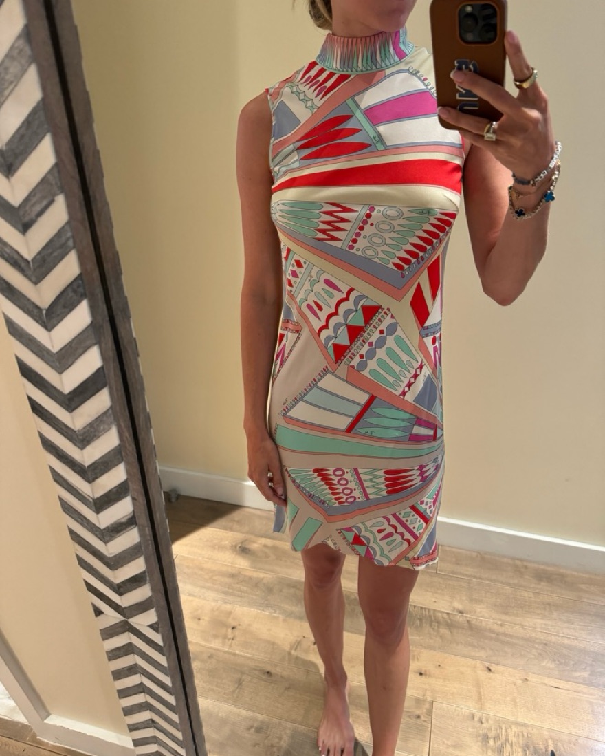Emilio pucci pastel printed mini dress with a high neck. Size US 4 (runs small). I am 5’8 for reference. Material is thin and light! Vintage dress so fun, can be dressed up or down for vacation or an event!