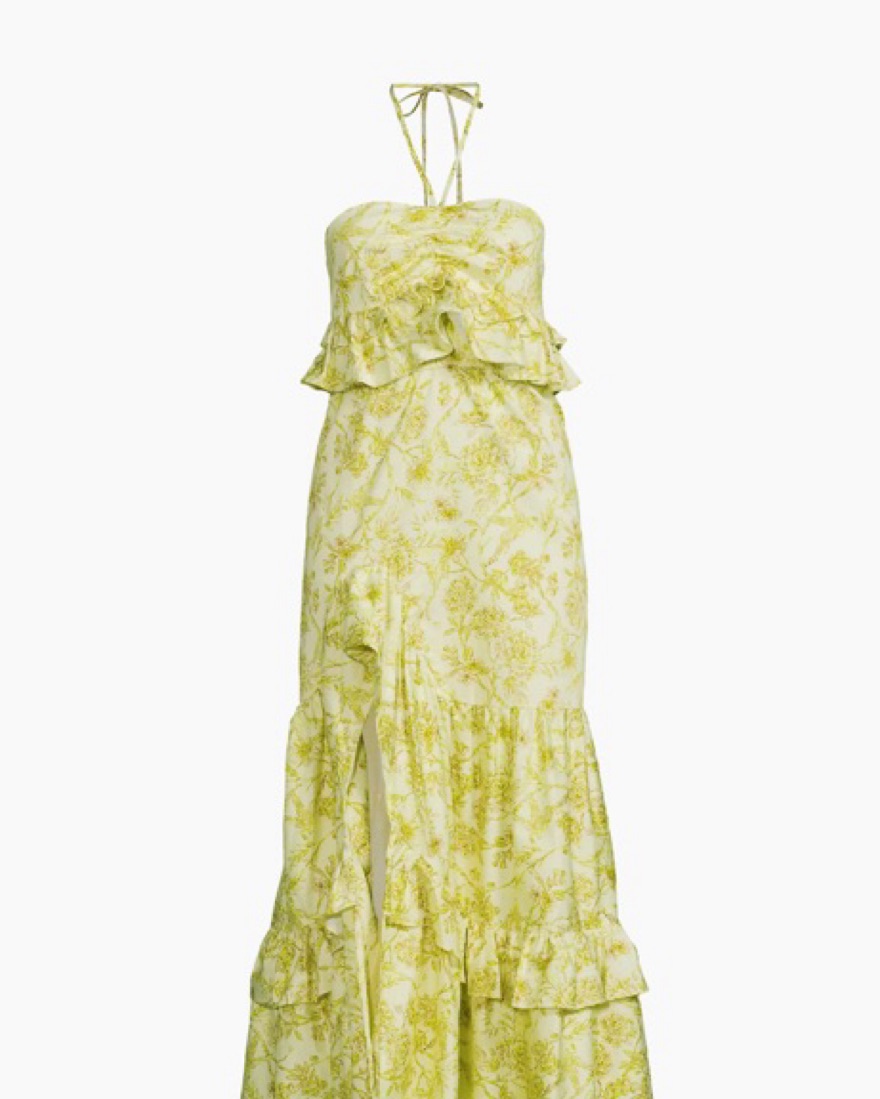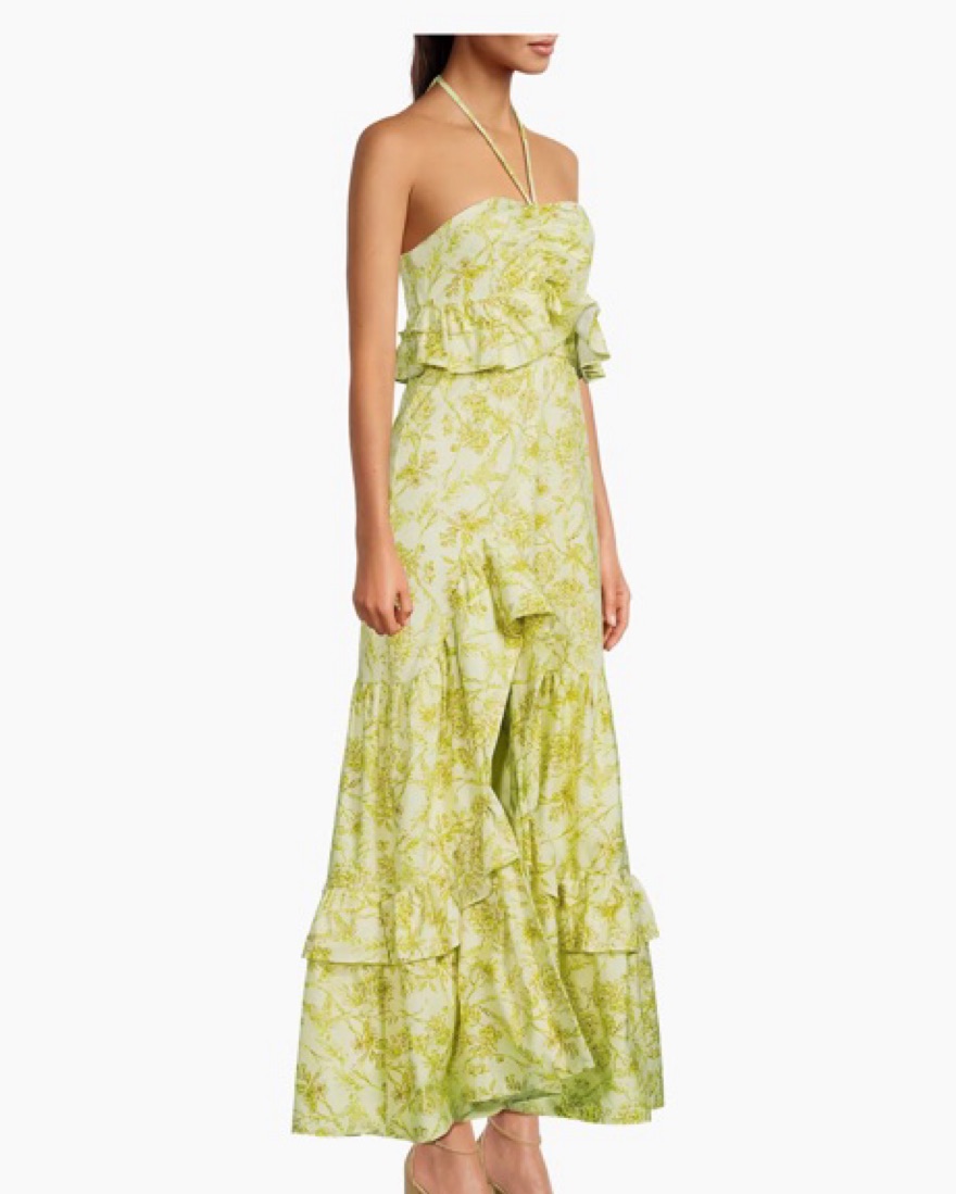 Stunning green floral print halter style dress with flattering leg slit and ruffle skirt detail. Perfect summer wedding guest dress.