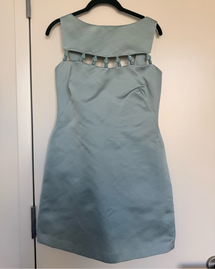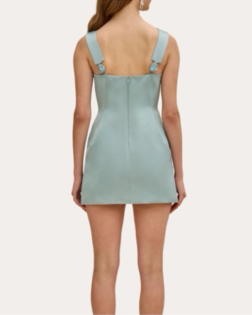 True to Cult Gaia's avant-garde aesthetic, the Ember dress decorates its lattice-cutout décolletage with tonal rock embellishments. The satin silhouette is tailored with darted seams to create a gentle A-line shape.