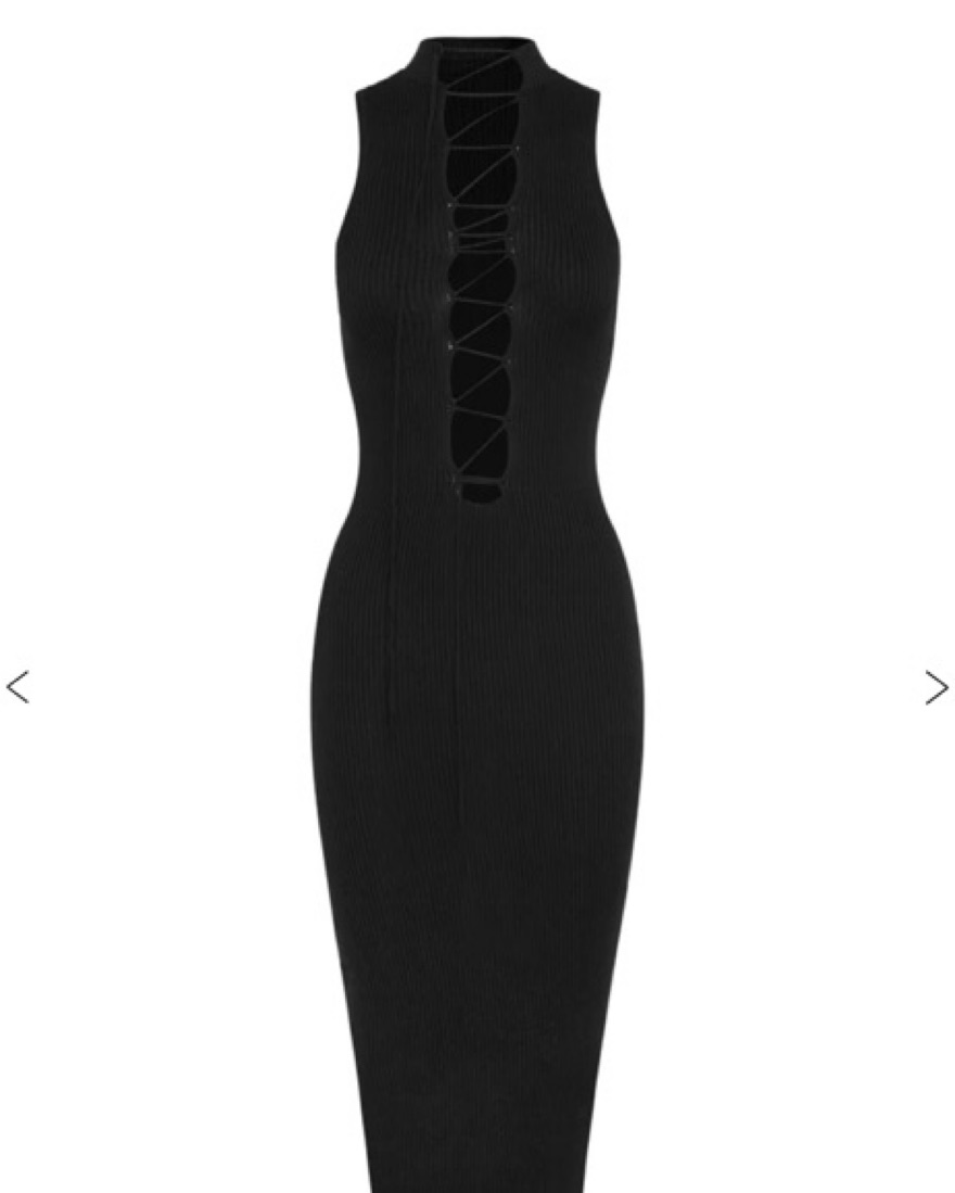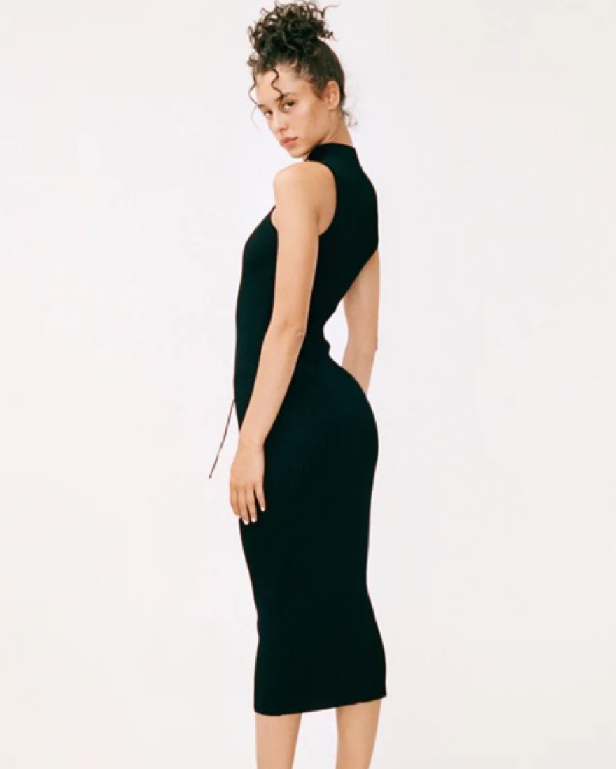midi length in a high stretch rib fabric featuring an adjustable lace up front and high back.