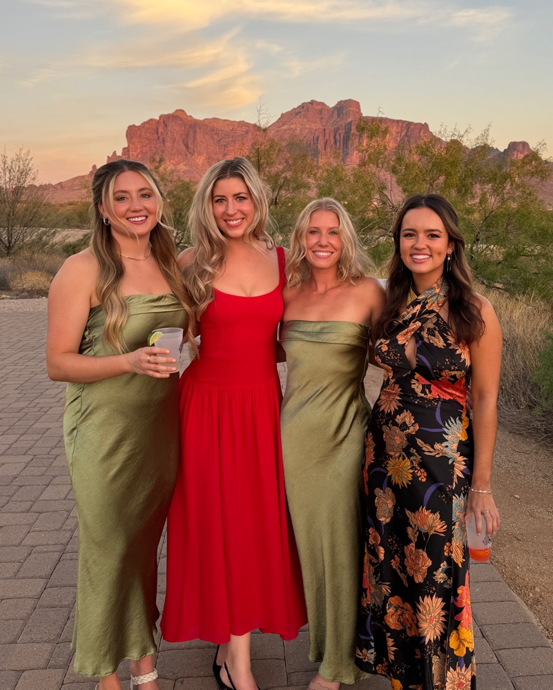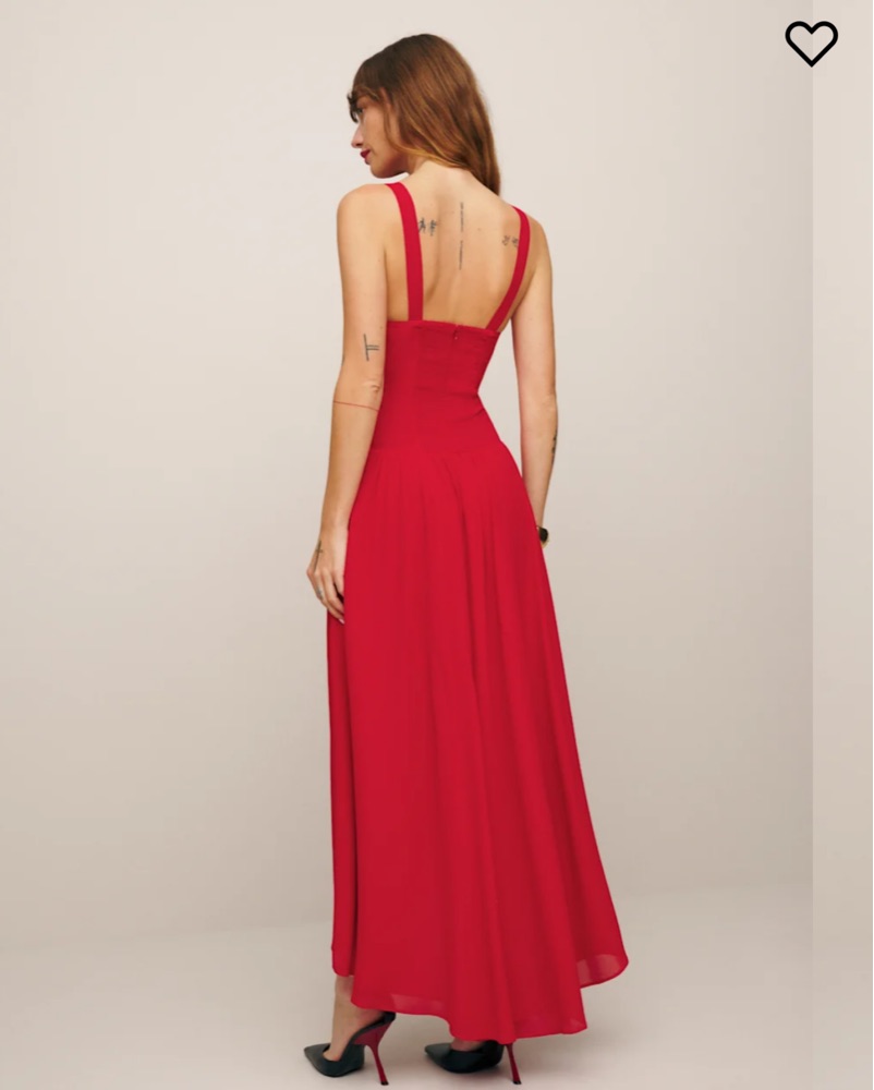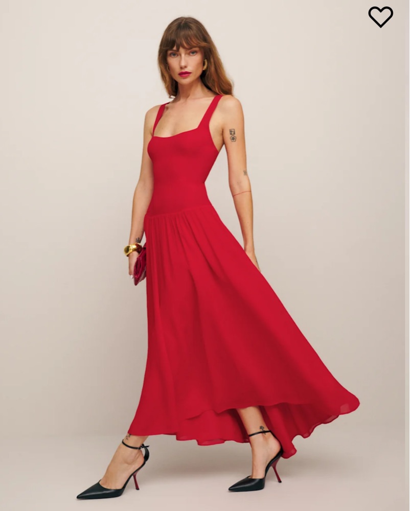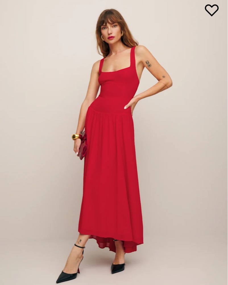 This stunning red maxi dress is perfect for a formal event like a wedding or gala. The flowing silhouette and flattering square neckline create an elegant, sophisticated look.