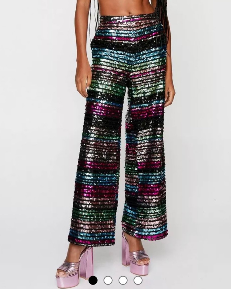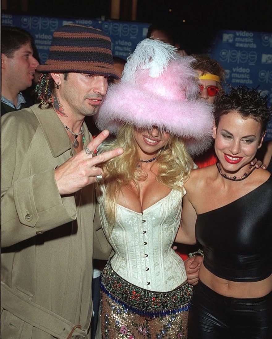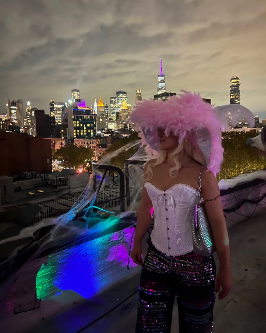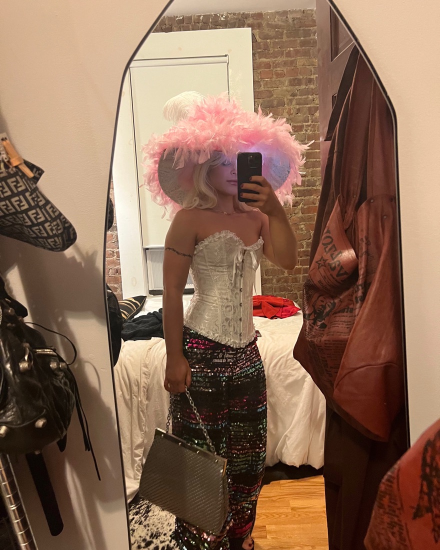 One of Pamela Anderson’s iconic outfits for Halloween costume. Comes with small corset, small wide leg sequin pants, custom made pink feather hat