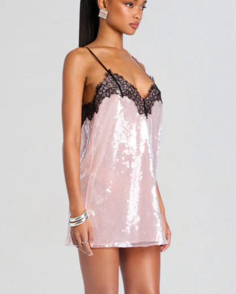 This sparkling slip dress is perfect for a night out on the town. The lace detailing adds a touch of elegance, while the sequins catch the light and create a glamorous look.