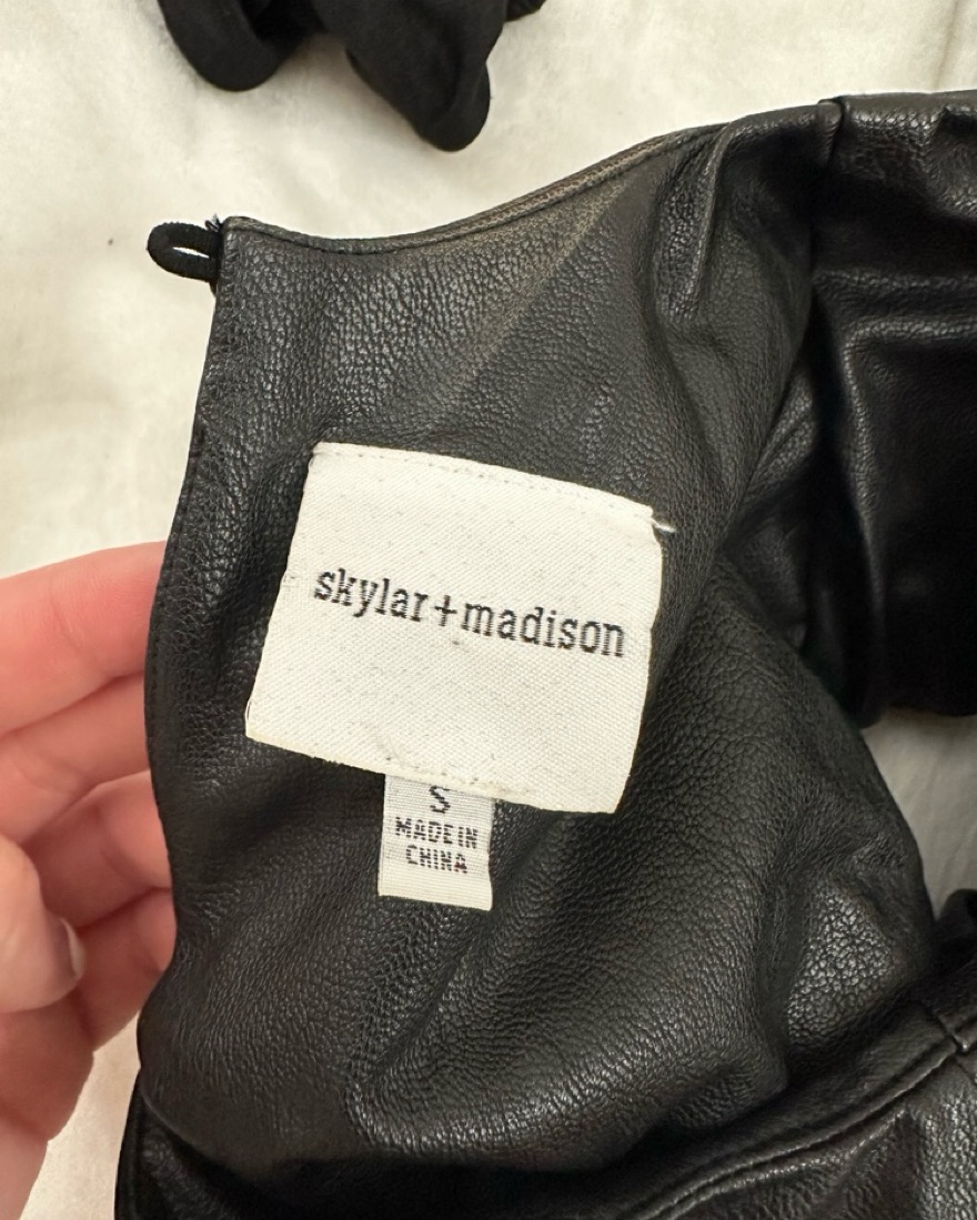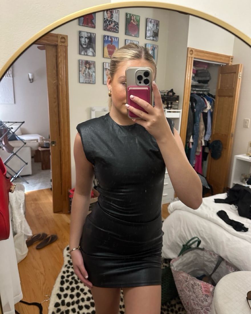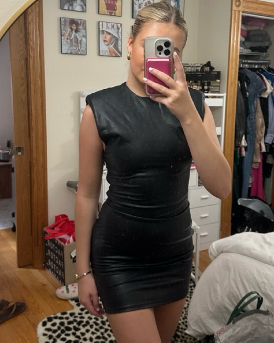 the most perfect fitting leather dress, cinches you in while being super comfortable and stretchy! Shoulder pads give you the perfect hourglass shape! Button works I was just home alone🤦🏼♀️🤦🏼♀️
