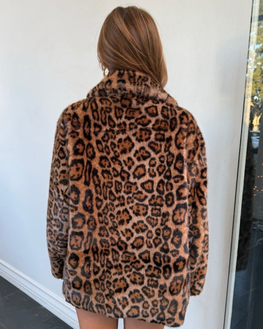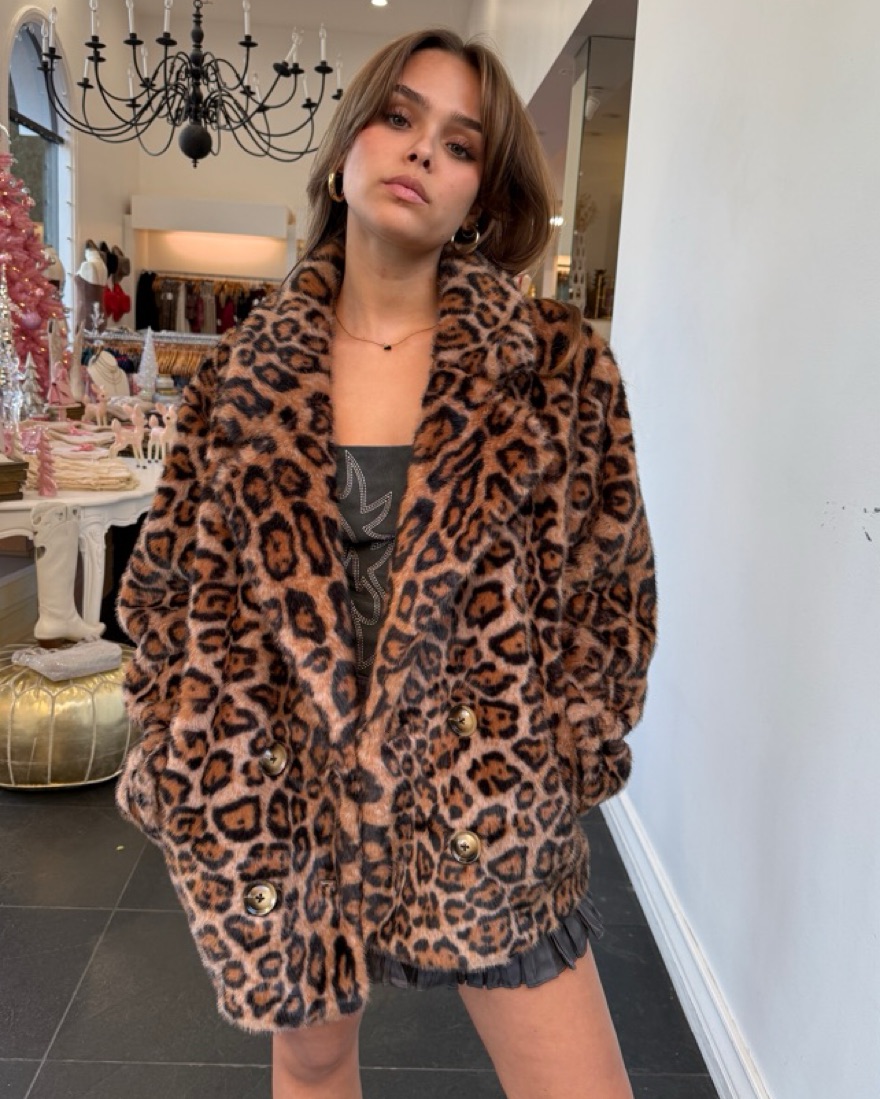 Double breasted super soft leopard faux fur coat with front pockets and lapel collar.