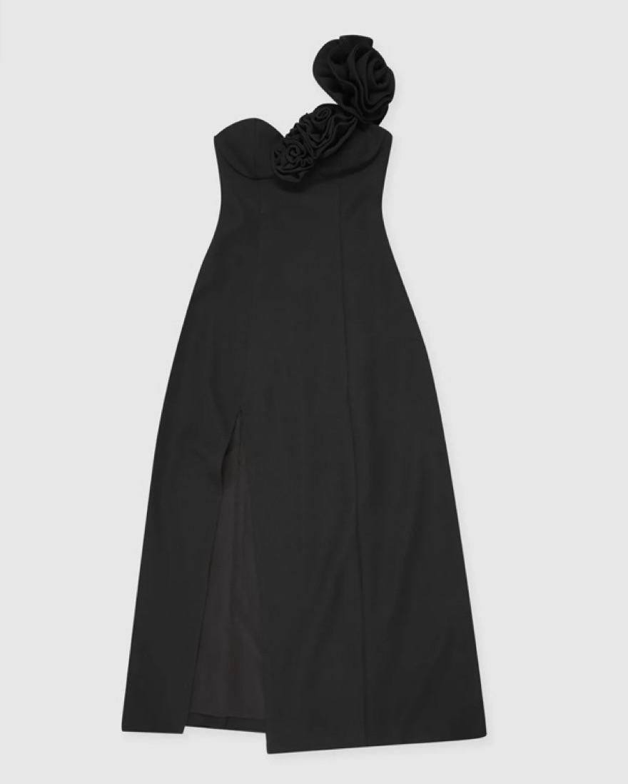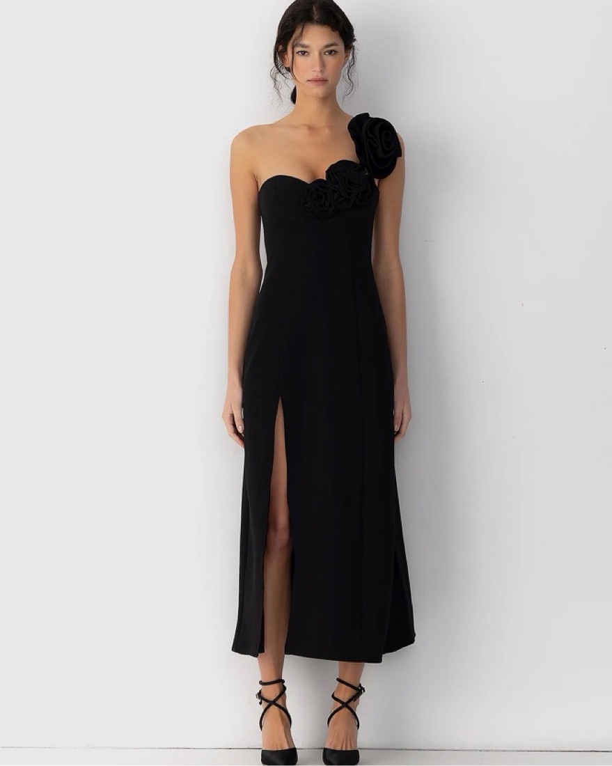 From the site, “With feminine rosette detailing sprawling from bust to shoulder and a thigh high split designed to show just the right amount of skin, the Flores Rose Midi is sure to turn heads.” Slight pilling but in great shape overall! Nice thick material. Wore to a black tie event once.