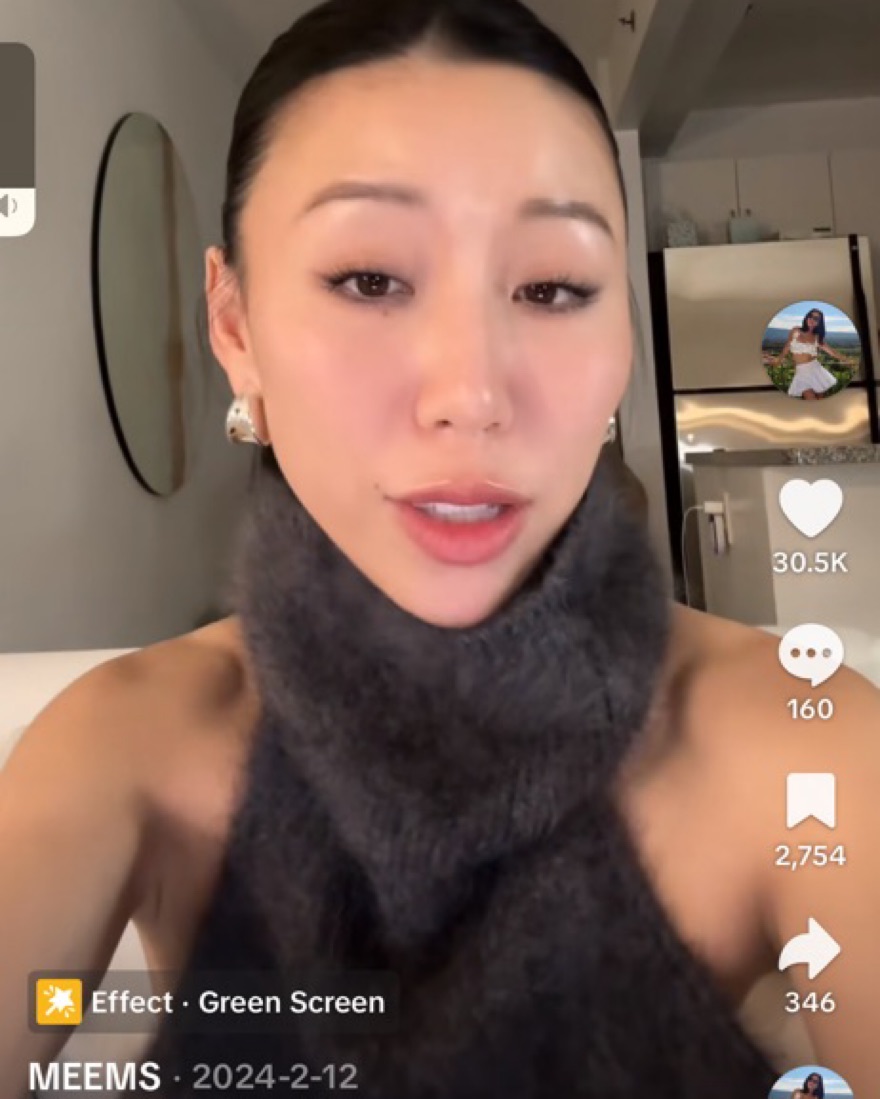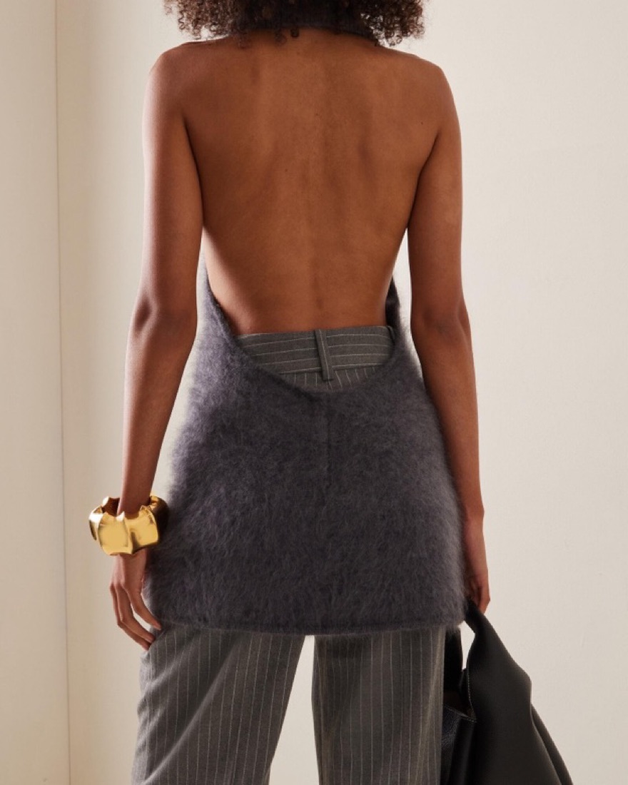 Cashmere halter tank with stretch. The model wears a size 0. The top is a size 1 which is a Small - medium.