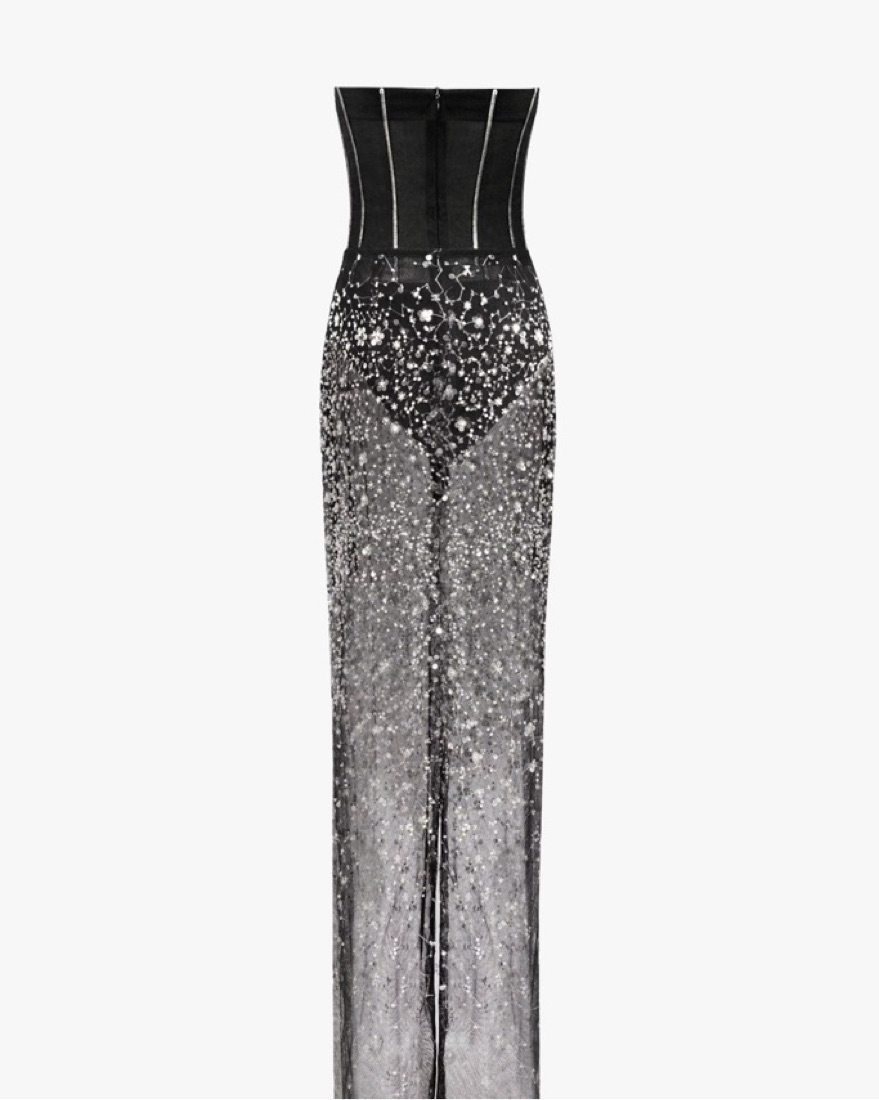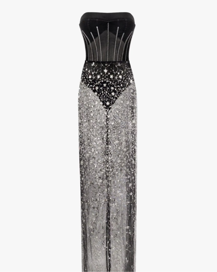 Semi-sheer black tulle dress embellished with twinkling crystals from the top to the skirt. Features a heart-shaped corset bodice and fit-to-body maxi silhouette.