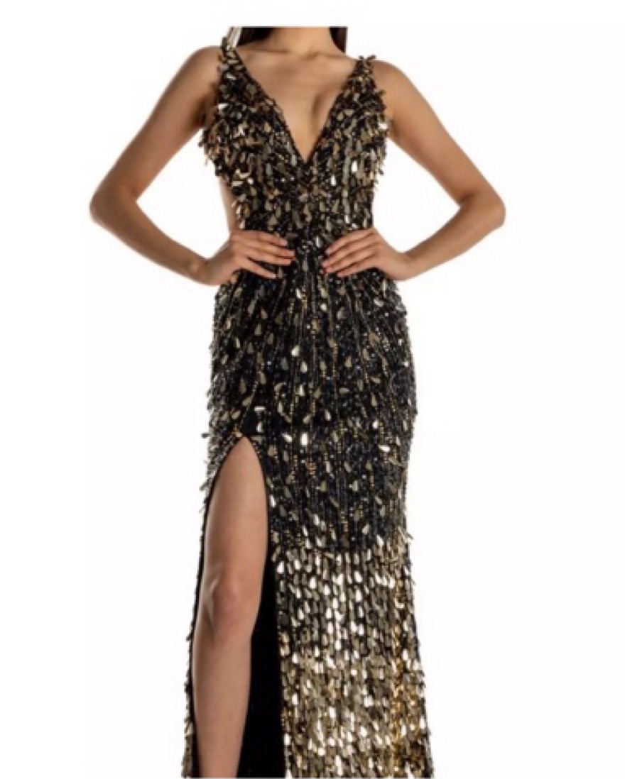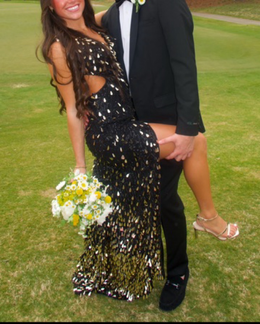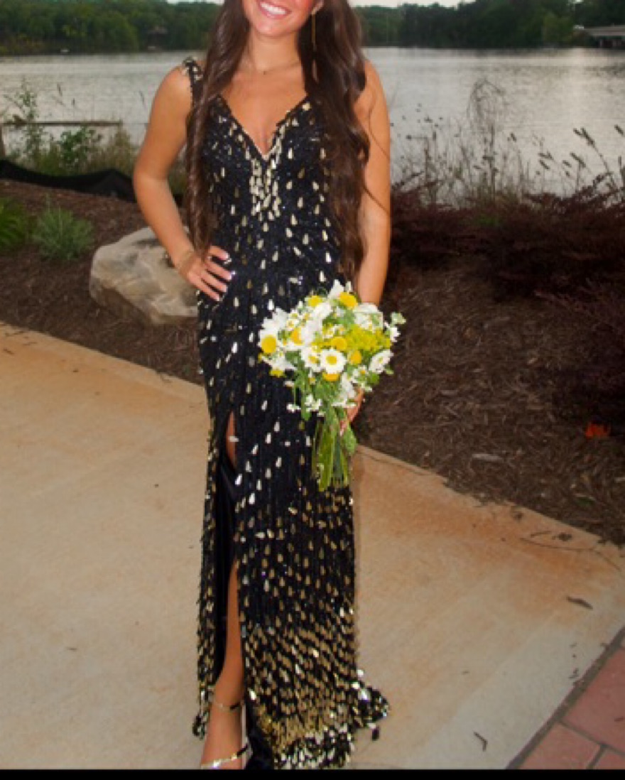 -gorgeous black and gold prom dress. Worn once. It is a size 4, but can fit a 2