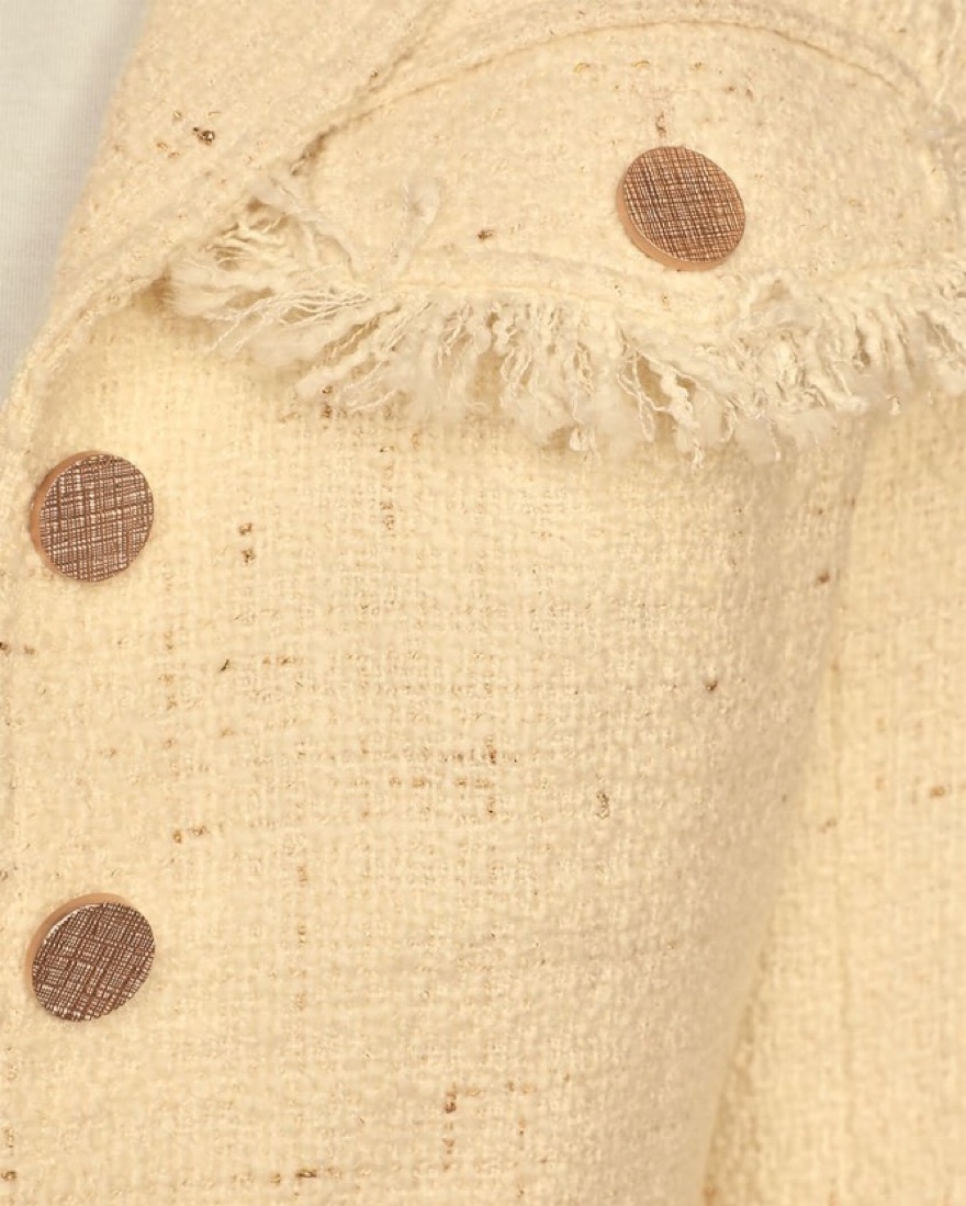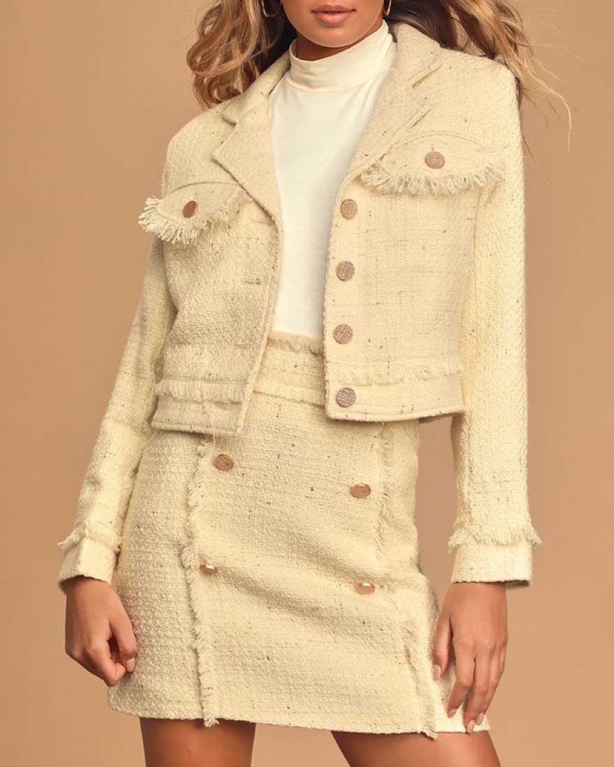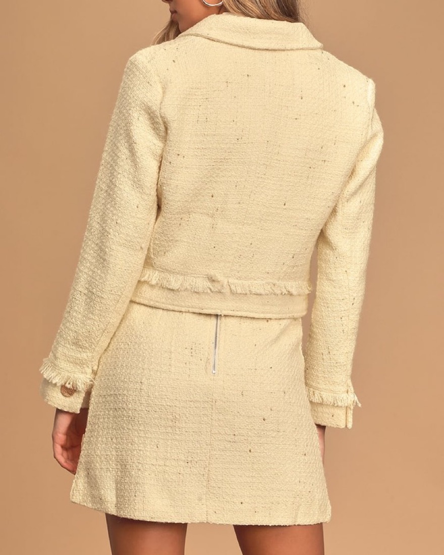 Pretty cream set. Lulus description: Dress to impress in the Lulus Prim and Proper Cream Tweed Jacket! Woven tweed, with shiny gold flecks throughout, shapes this chic jacket that features a collared neckline, notched lapels, and long sleeves with button cuffs. Twin flap pockets frame a button-up bo