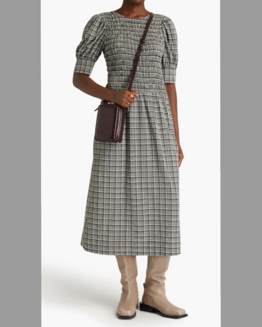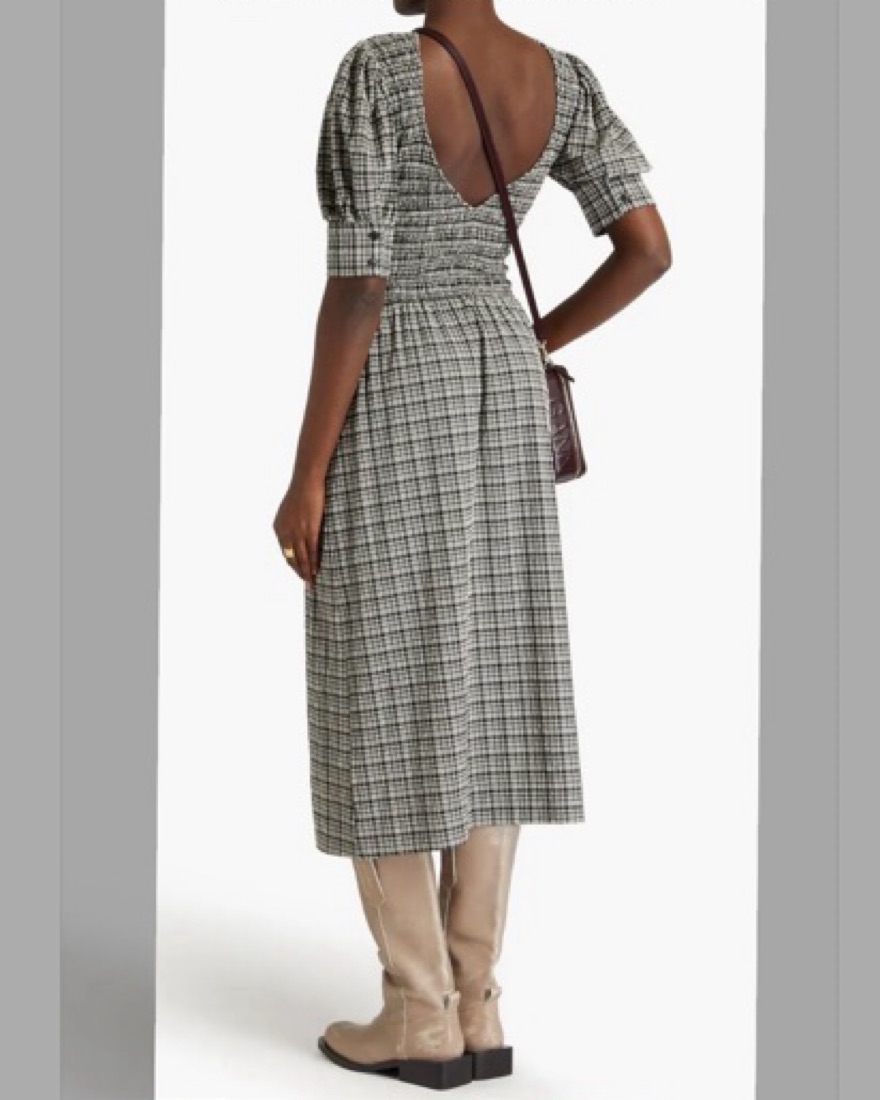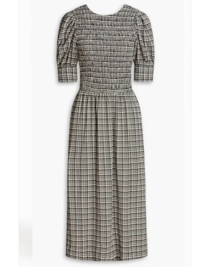 Ganni Shirred Checked Seersucker Midi Dress In Black - Ganni Size 36 / US6