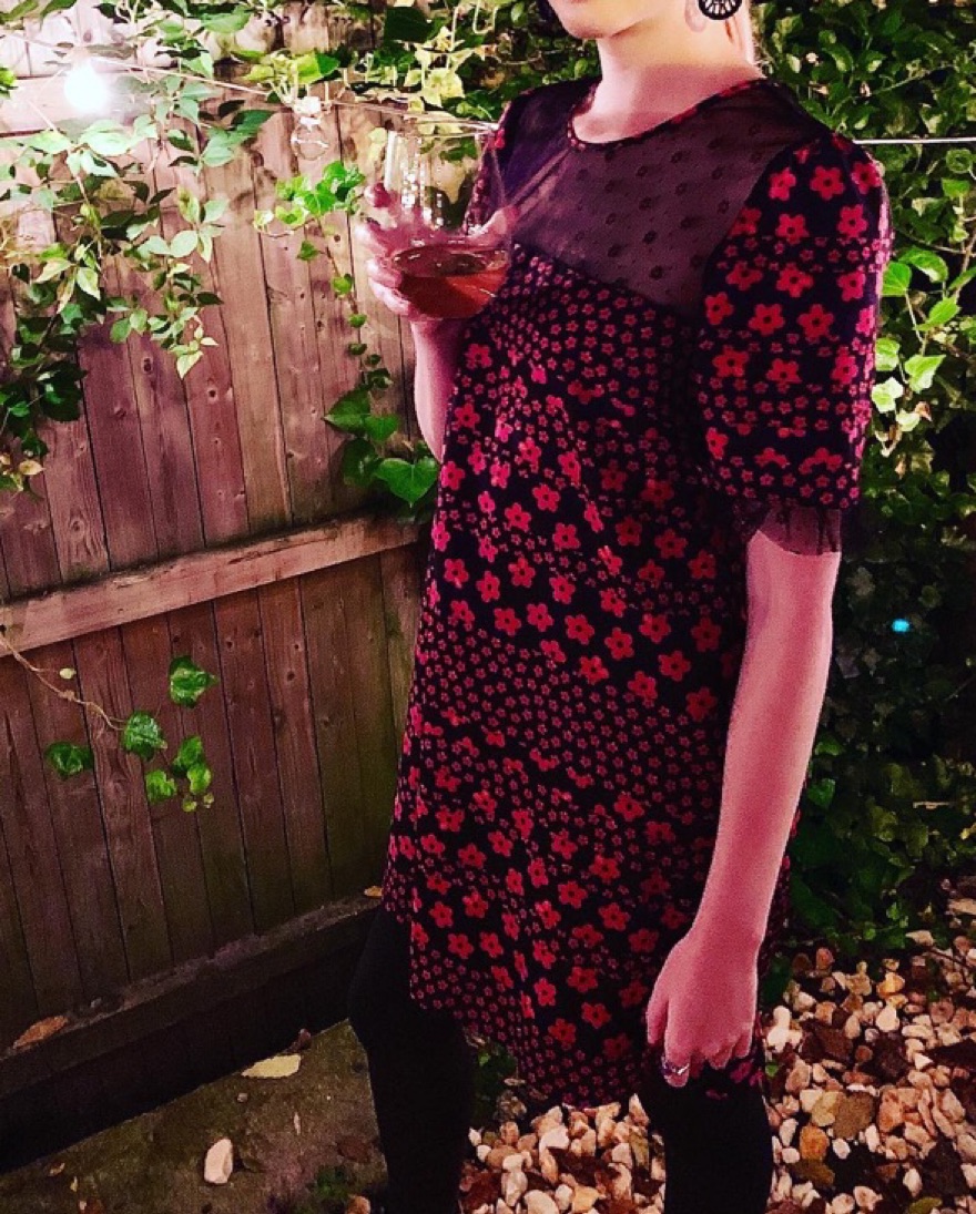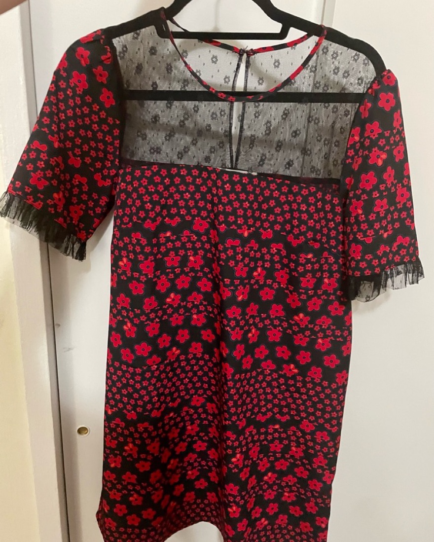 BCBG red ans black printed mini dress with mesh panel at top. Great condition, no signs of wear.