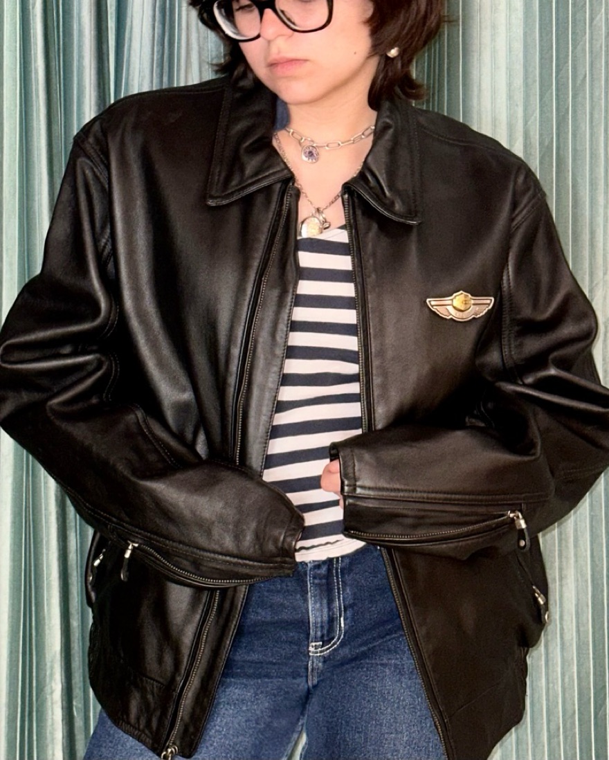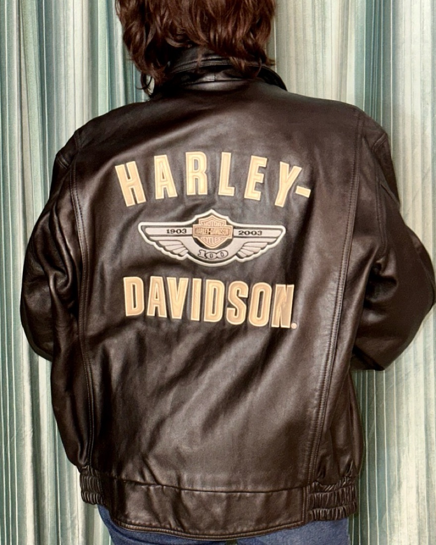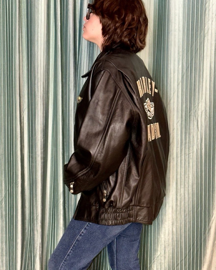 Description: Brand: Harley Davidson Fit: Model wears a medium ; fits oversized Condition: Excellent Color: Black Material: Leather Measurements: Sleeve: 27 inches Length: 26 inches