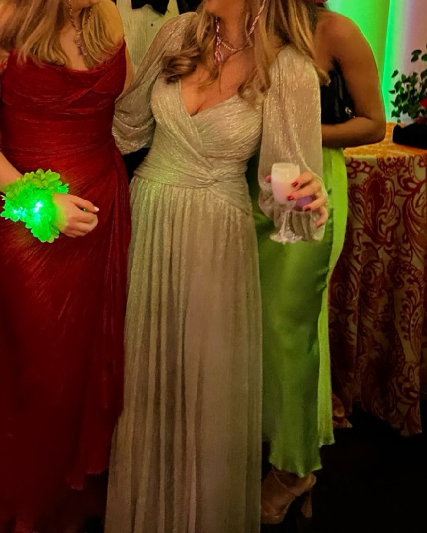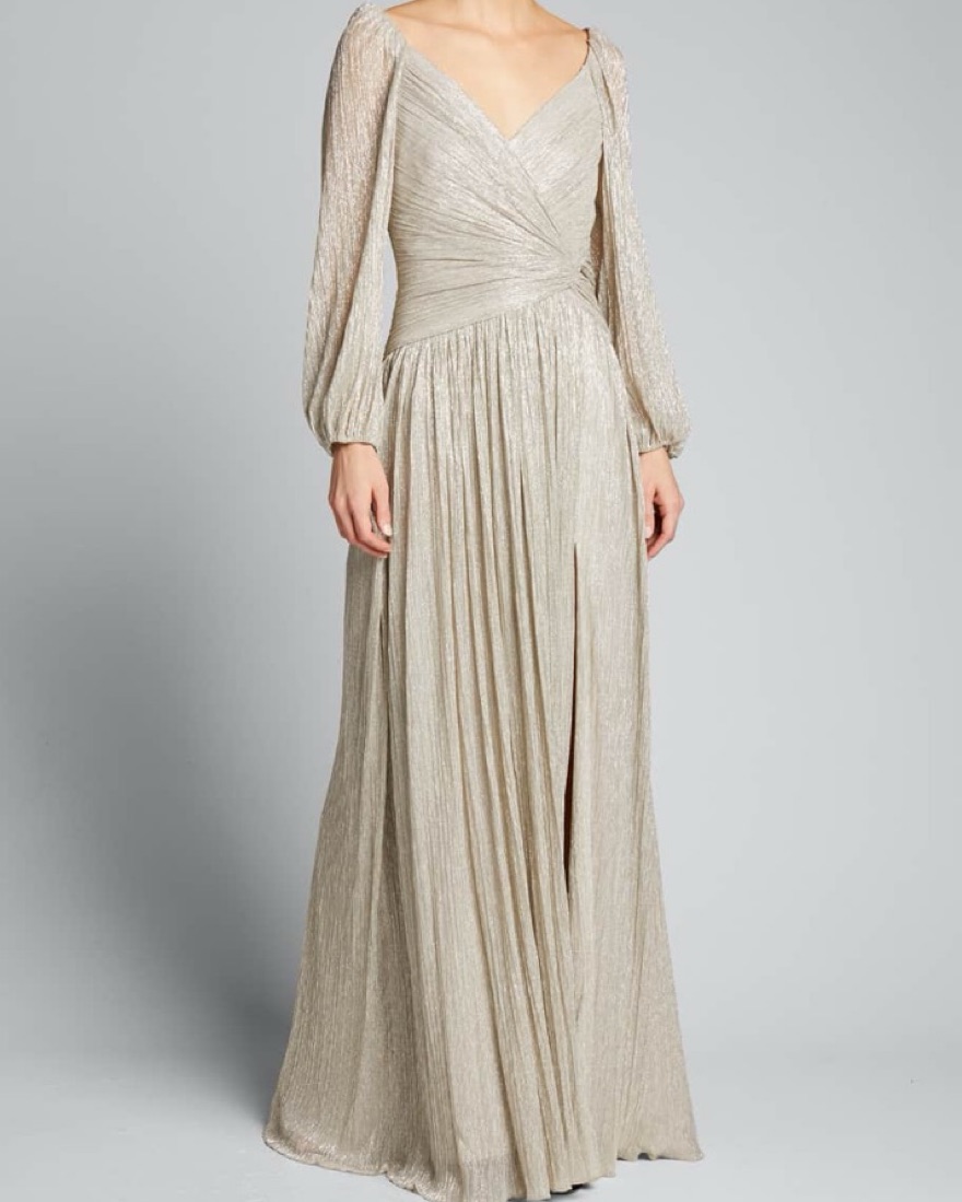 Complete this sensational look with a clutch and drop earrings for a special black or white tie event Gown Gathered Elasticated cuffs Concealed hook and zip fastening at back Partially lined Front split Slightly stretchy fabric Mid-weight fabric Dry clean Imported 55% Polyester 45% Meta