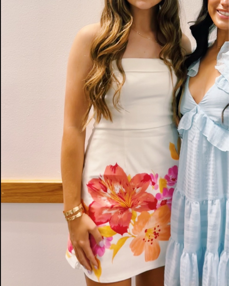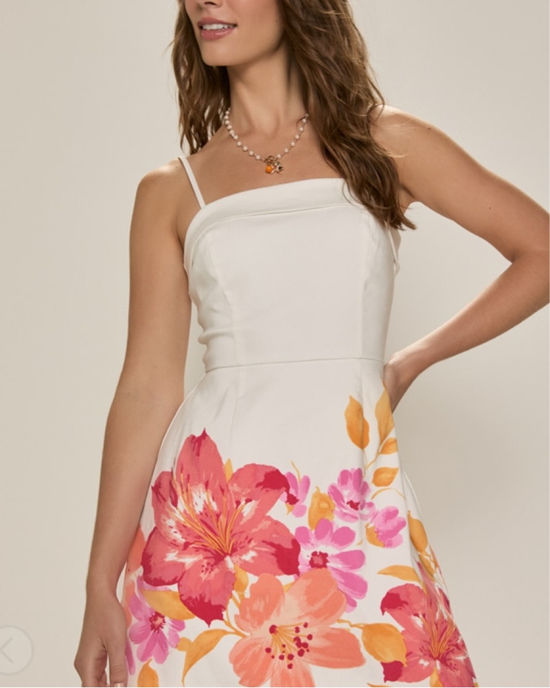 This stylish mini dress is perfect for a summer wedding or garden party. The white base is complemented by vibrant floral embroidery, making it a feminine and eye-catching choice.