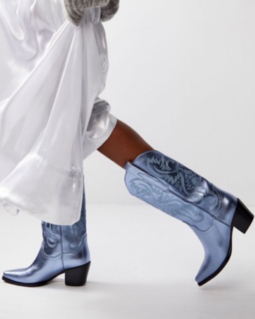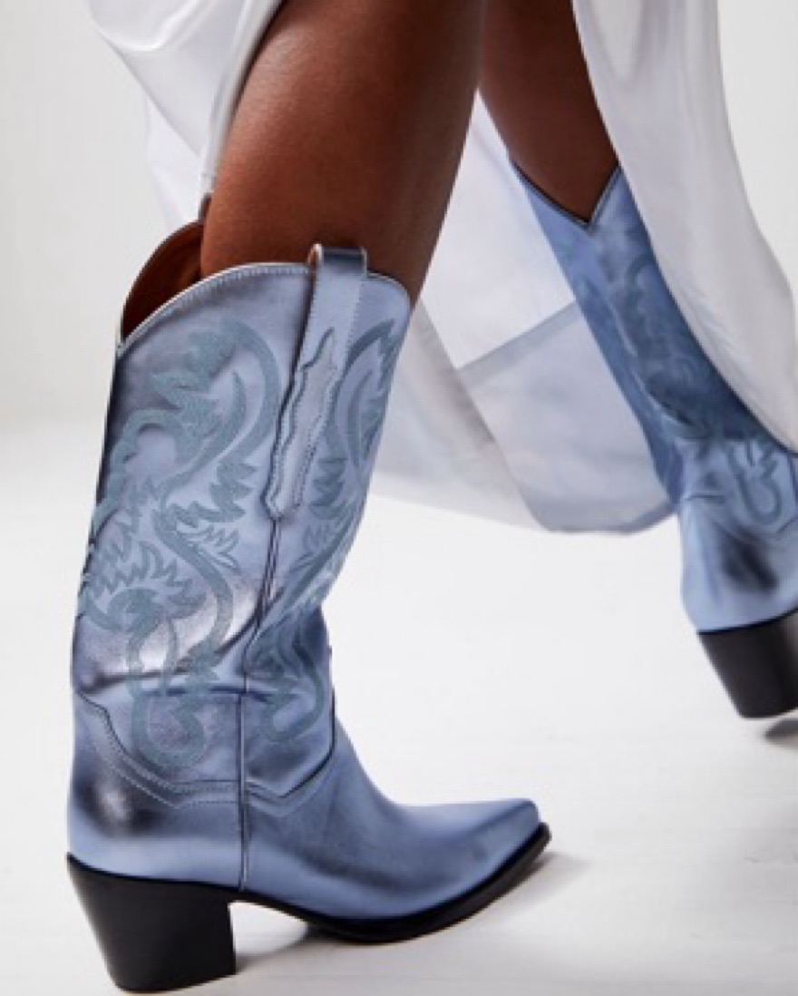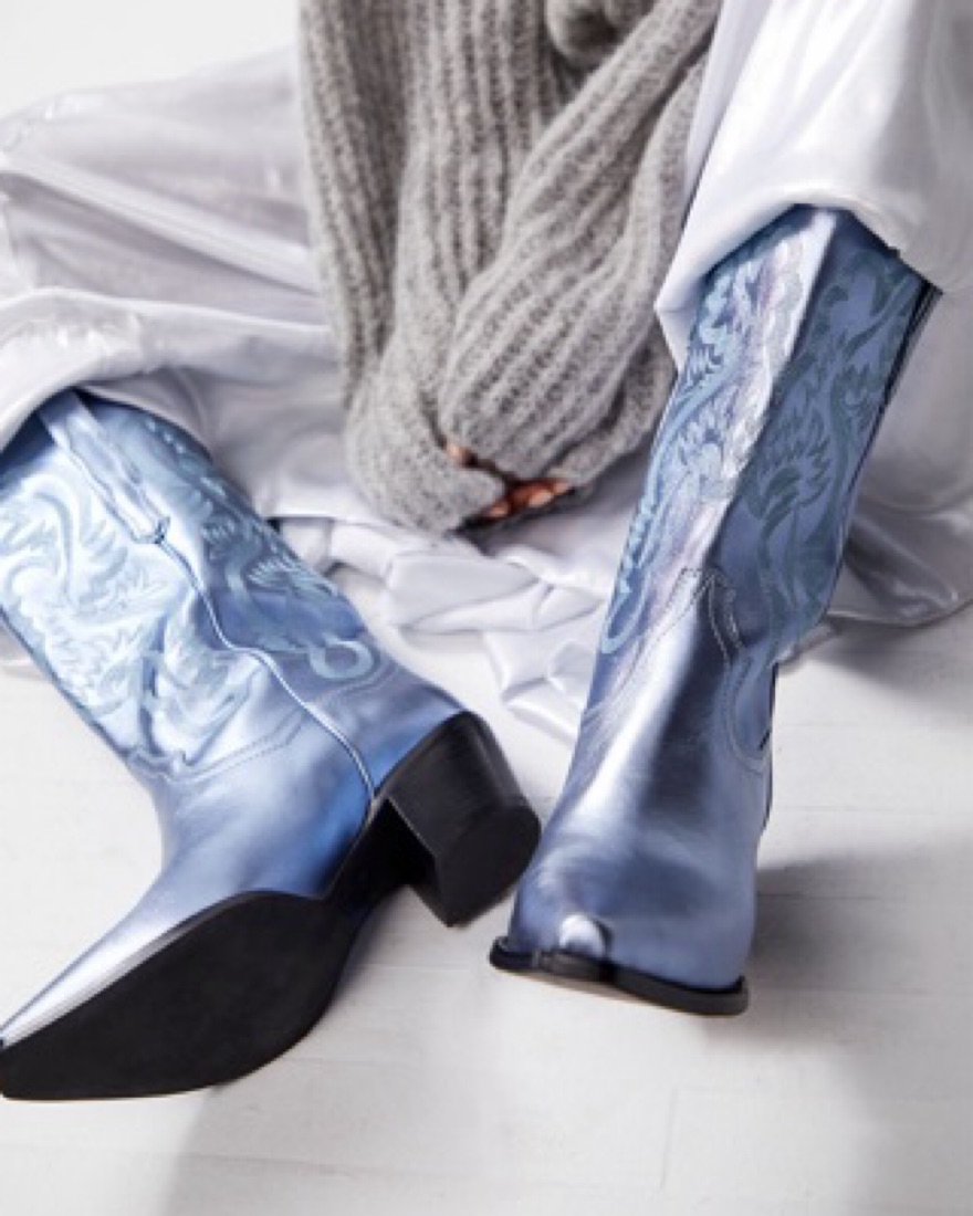 Jeffrey Campbell Dagget Western boots in blue metallic, classic embroidered details in a luxe leather design with a pointed toe and block heel, handle with care pls 🪩