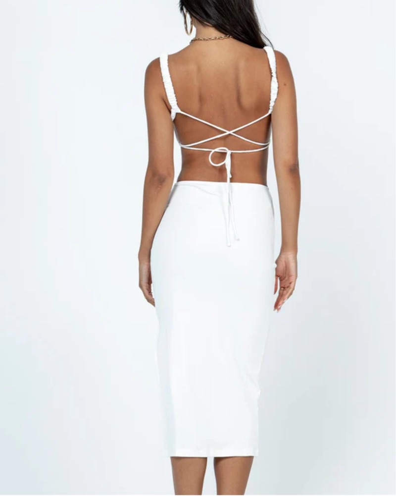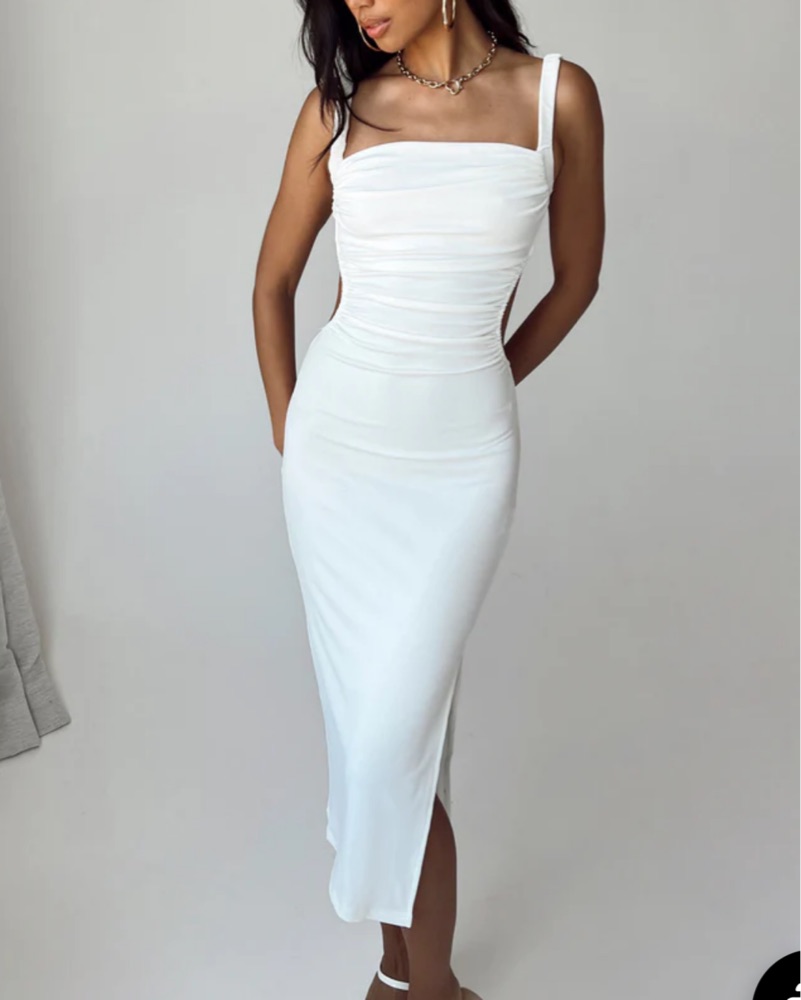 Stunning white bodycon midi dress with a chic cutout back. Perfect for a night out or special occasion.