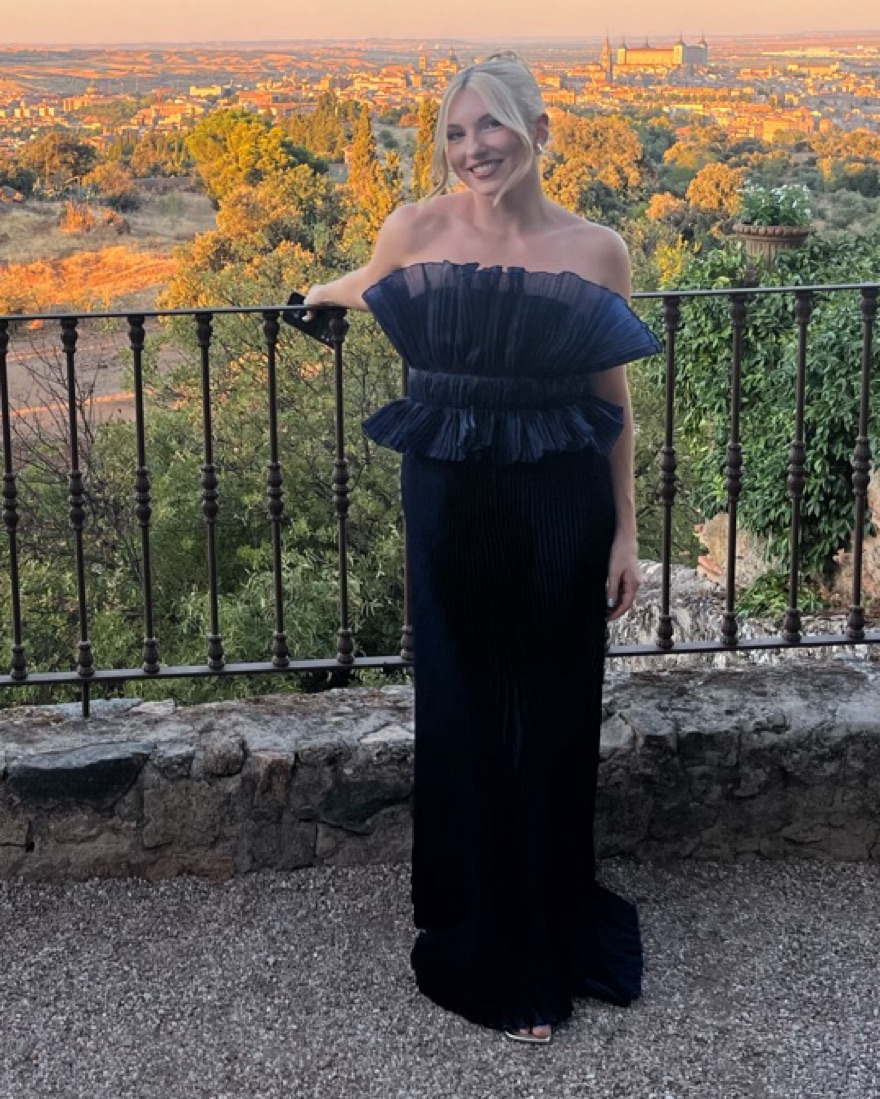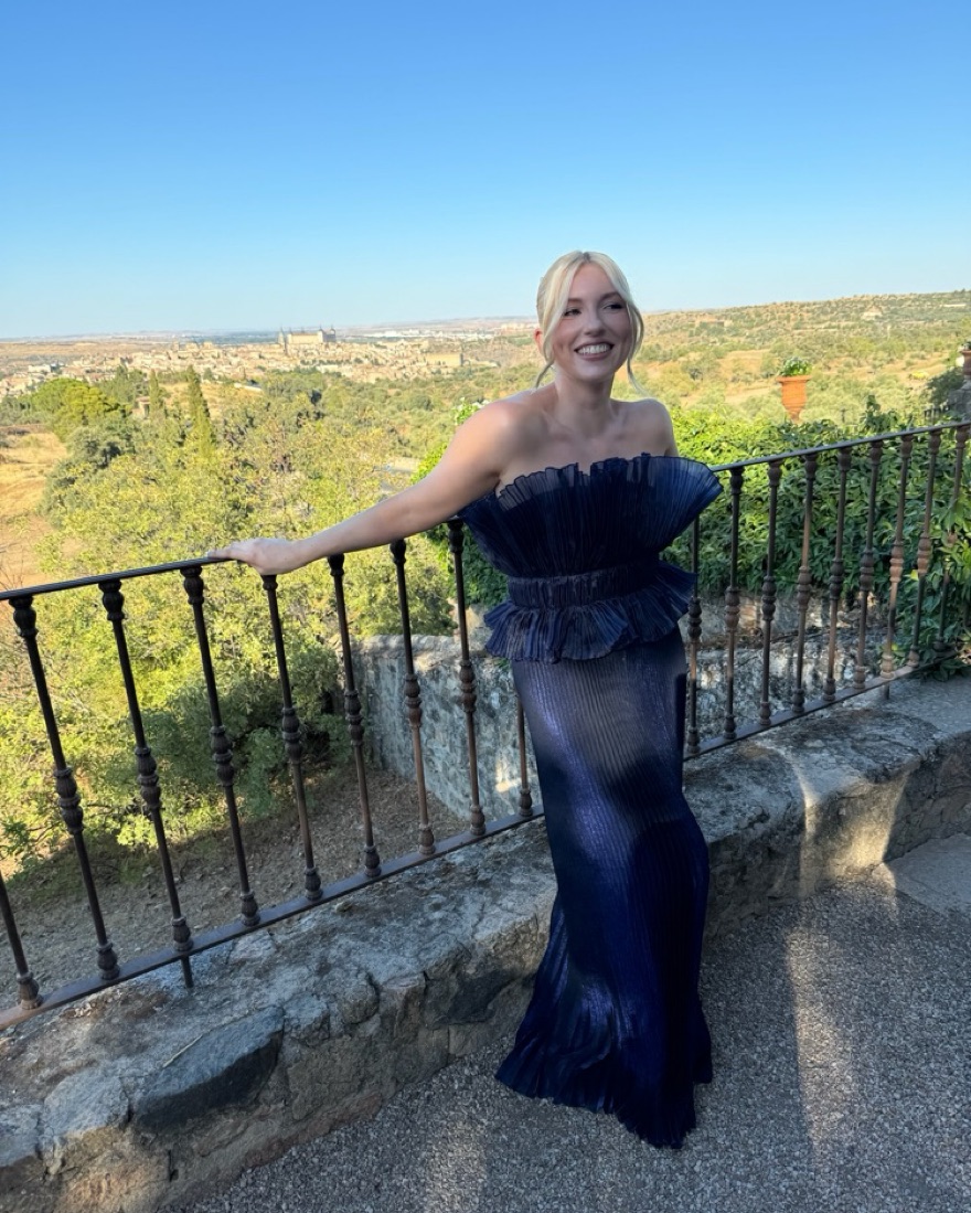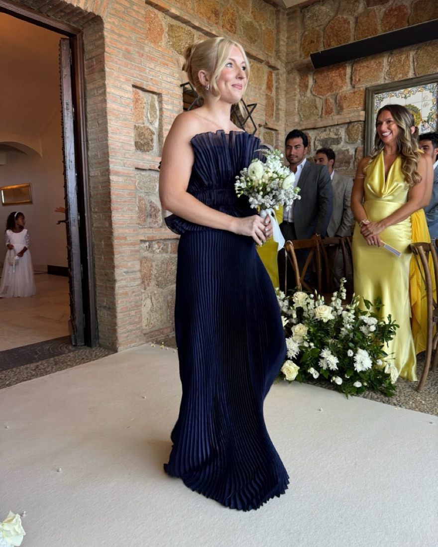 Pleated navy gown from L’Idee with a straight skirt and peplum like top. Makes the perfect wedding guest dress. Super comfortable and in perfect condition.