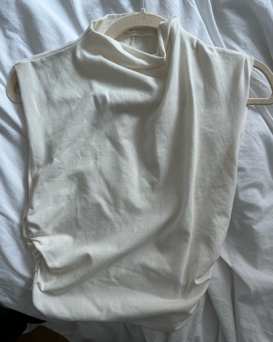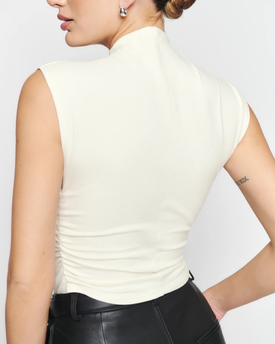 Easy little number. The Lindy is a fitted, cropped top with cap sleeves. It has light ruching on the sides and a high, mock neckline. It gives you a little shape in the areas where you might want it. Size M. Only worn twice.