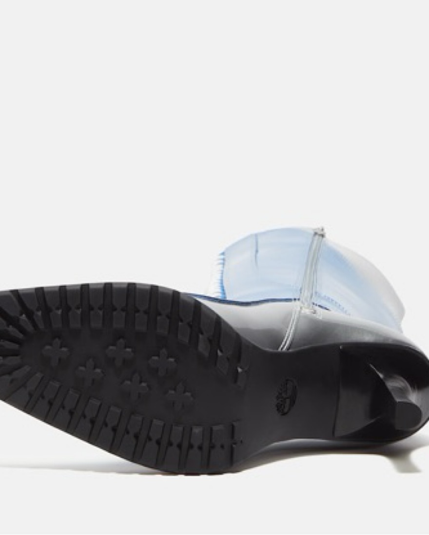 Blue and silver patent leather lace up stiletto boot by Timberland in collaboration with Veneda Carter. This boot features pointed toes, side zip closures and a branded dog tag. Brand new but one boot does feature some creasing on inside by zipper/heel but not noticeable.