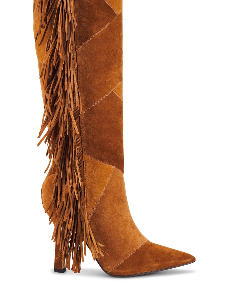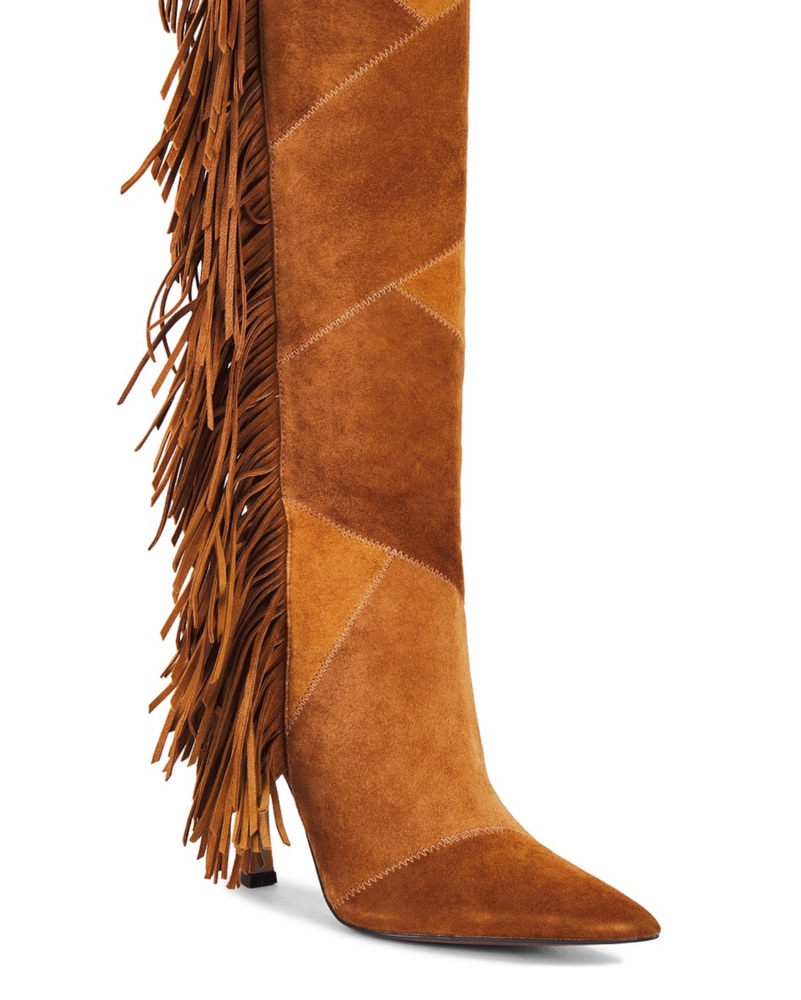These stylish suede cowgirl boots with a chic fringe accent are perfect for adding a touch of western flair to any outfit. Wear them with your favorite jeans, dresses, or skirts for a fashionable and versatile look.