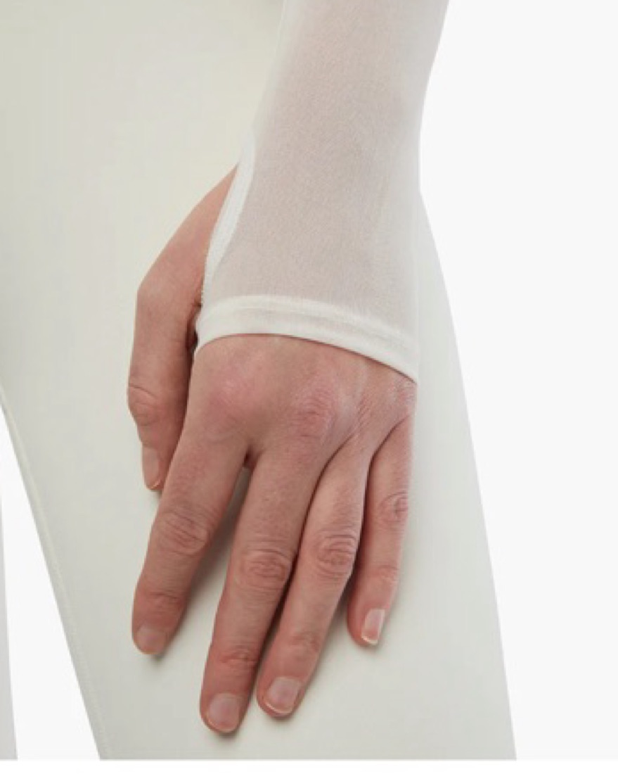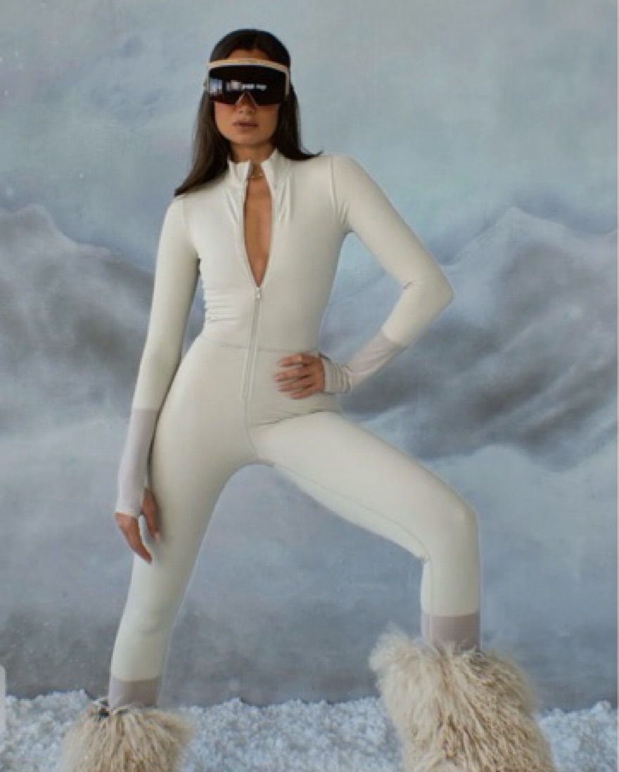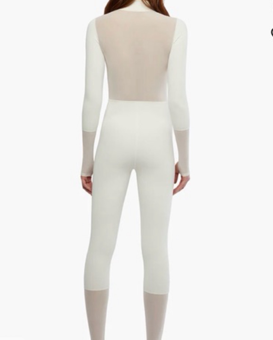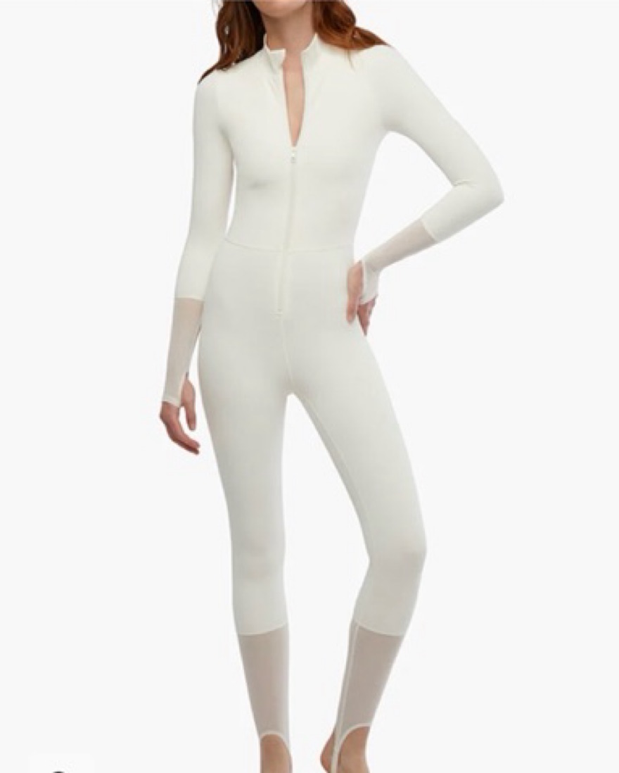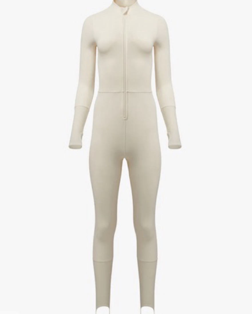 Perfect Ski under layer. Color is Off White. This mock neck jumpsuit is made from brushed nylon with warm fleece lining and power mesh panels at the back, sleeves, and legs for breathability. Stirrup foot straps and thumbholes help keep the legs and sleeves in place.