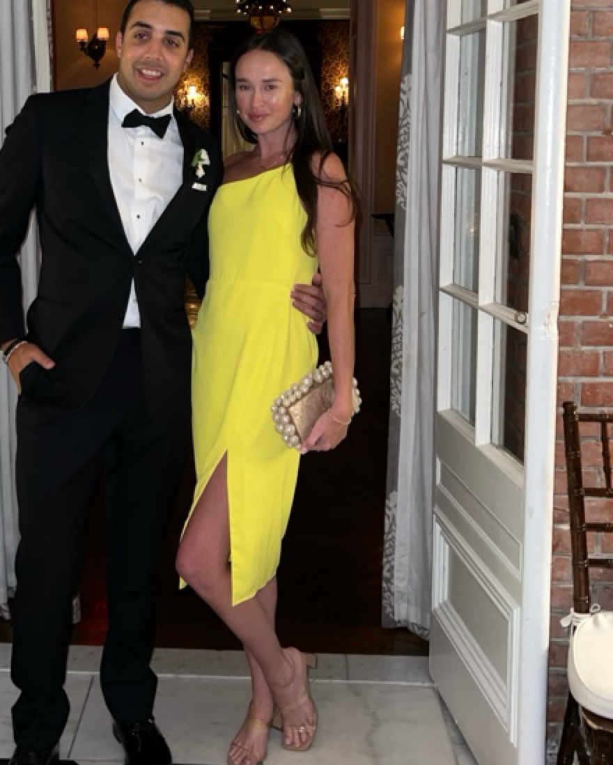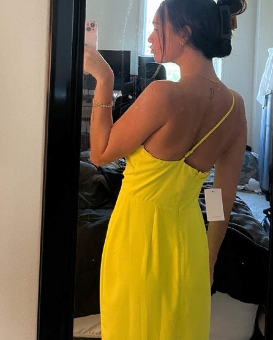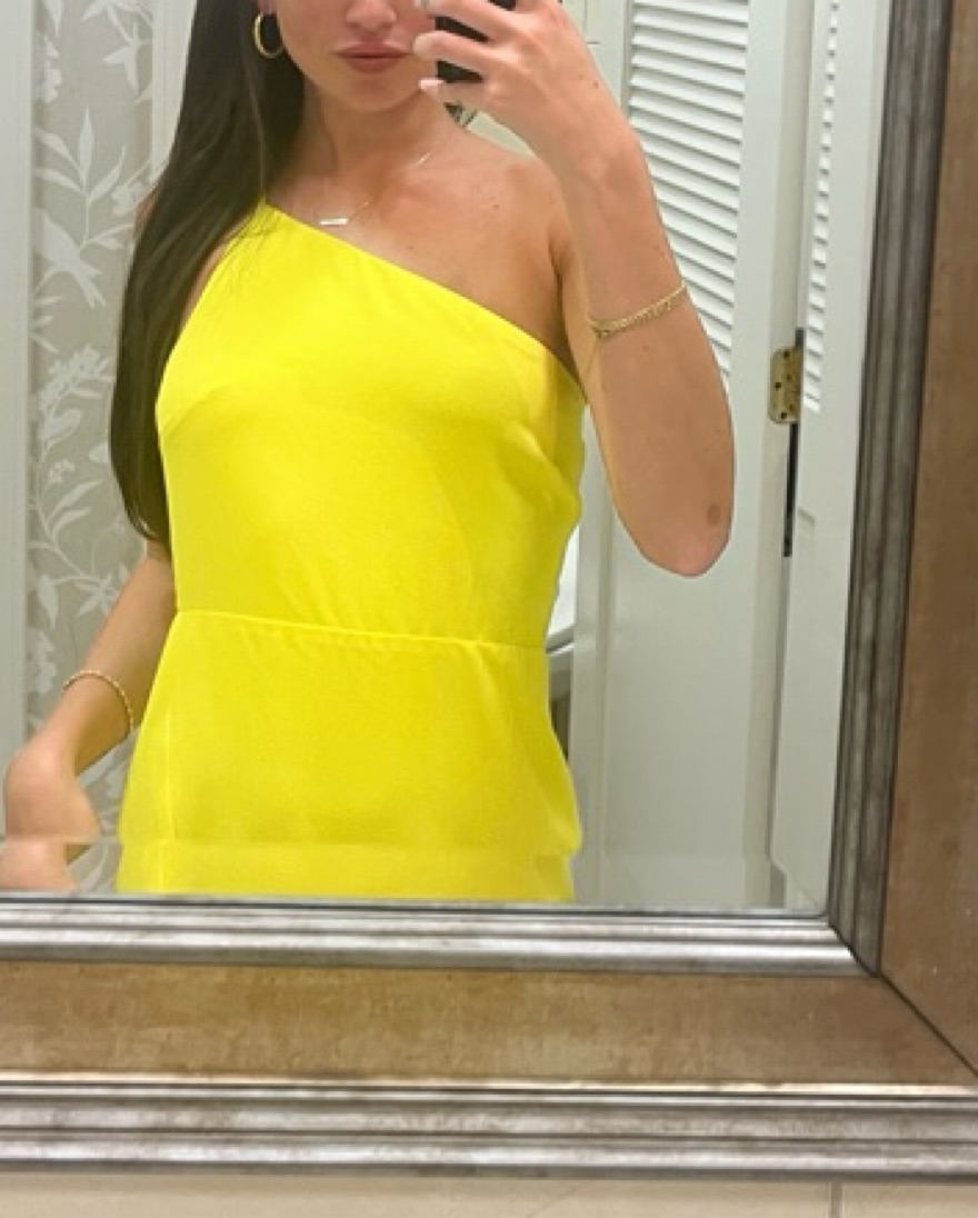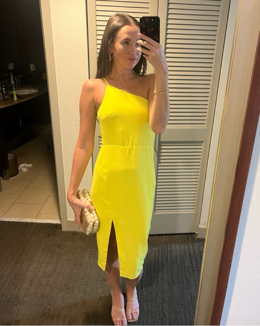 one-shoulder dress in a bold, vibrant yellow with a side slit make
