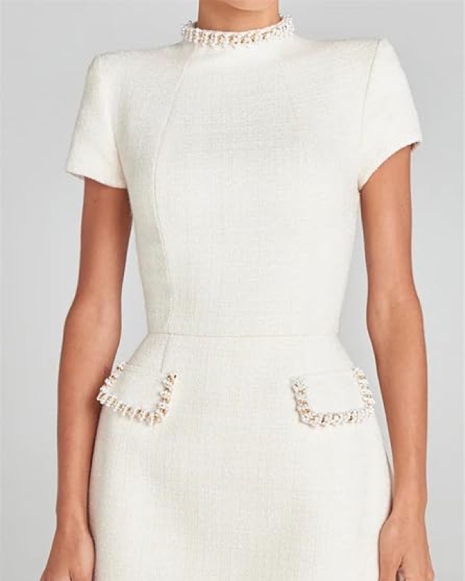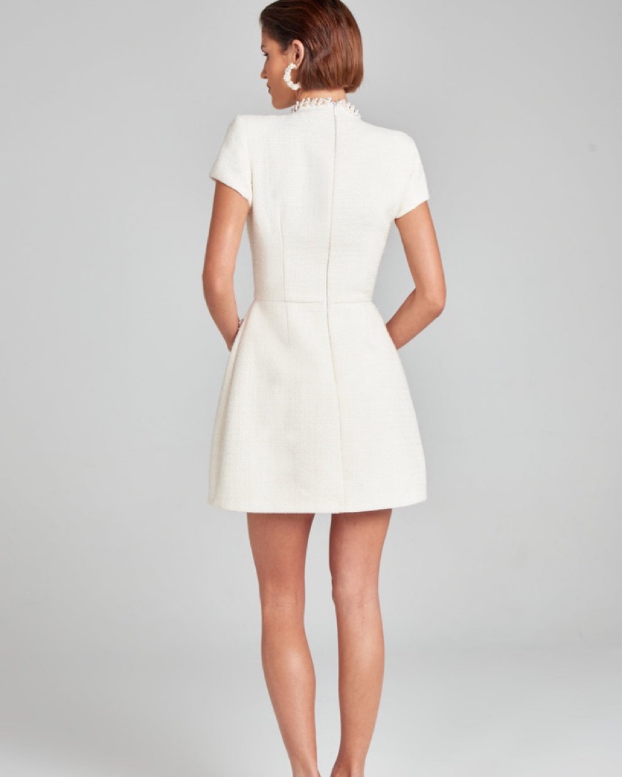 This chic white mini dress features a high neck and decorative pearl trim, perfect for an elegant evening event or a special occasion.