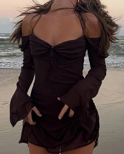 Long sleeve/halter neck ties with cutouts at the hips. Super cute one of my favorite dresses.