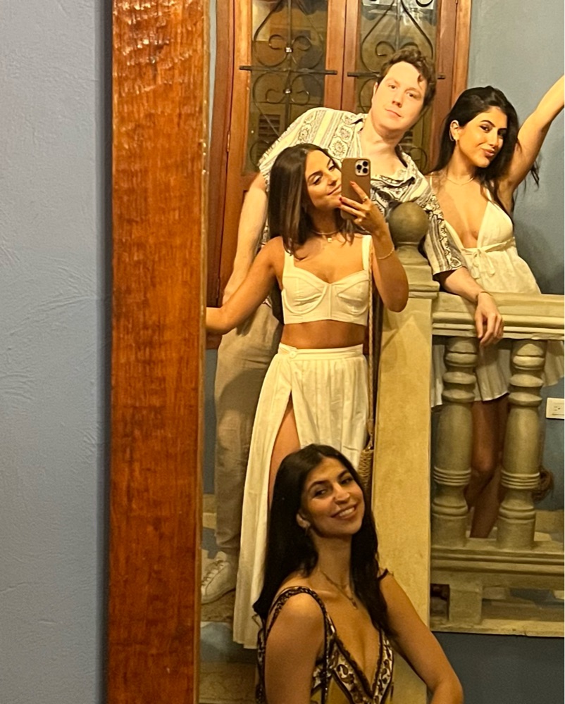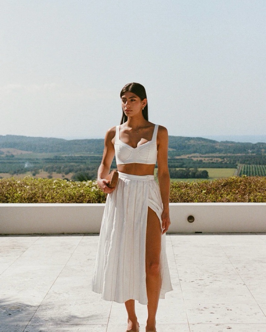 Flowy white wrap skirt with a slit and matching crop top. Great for warm weather!