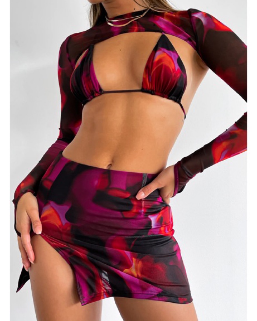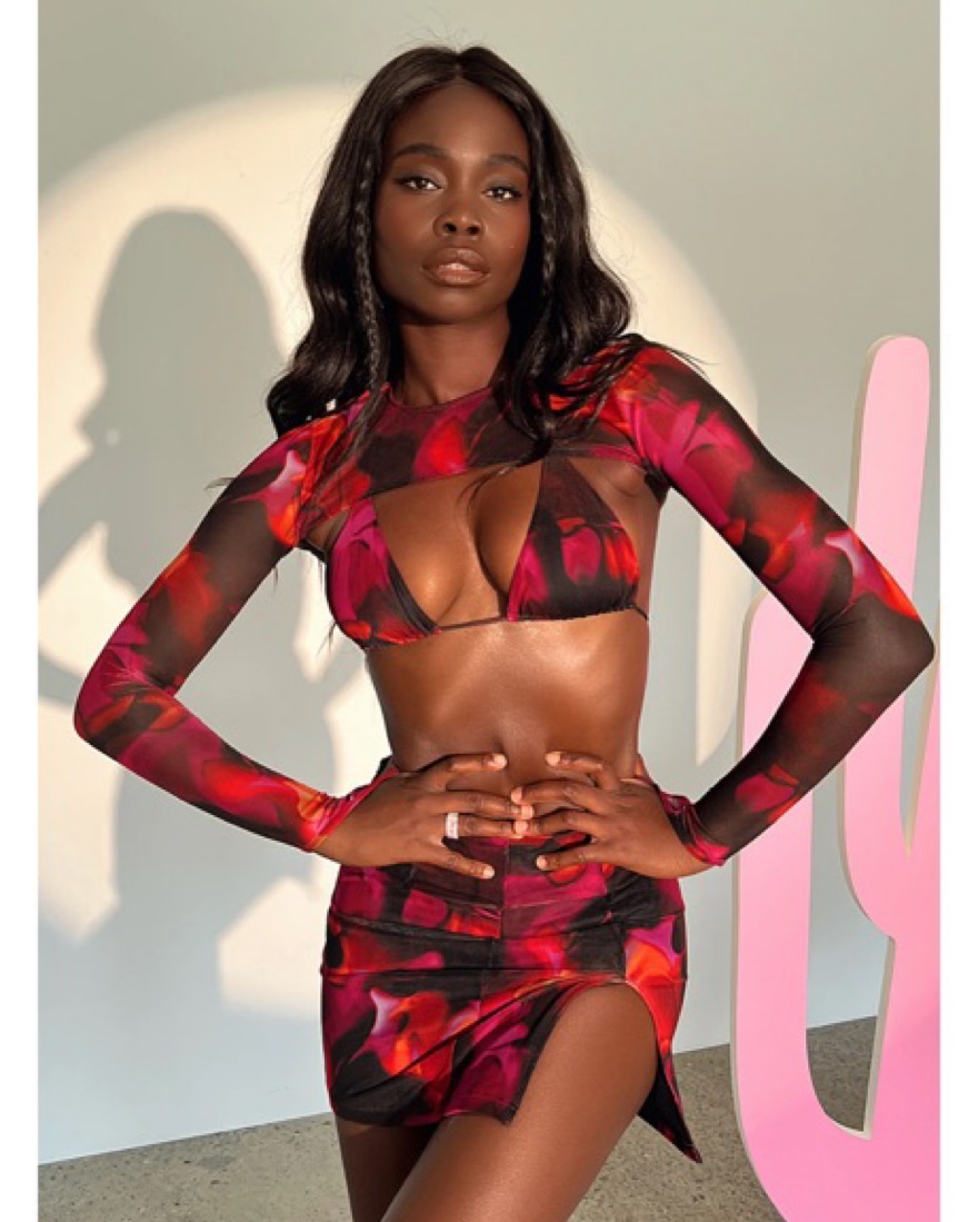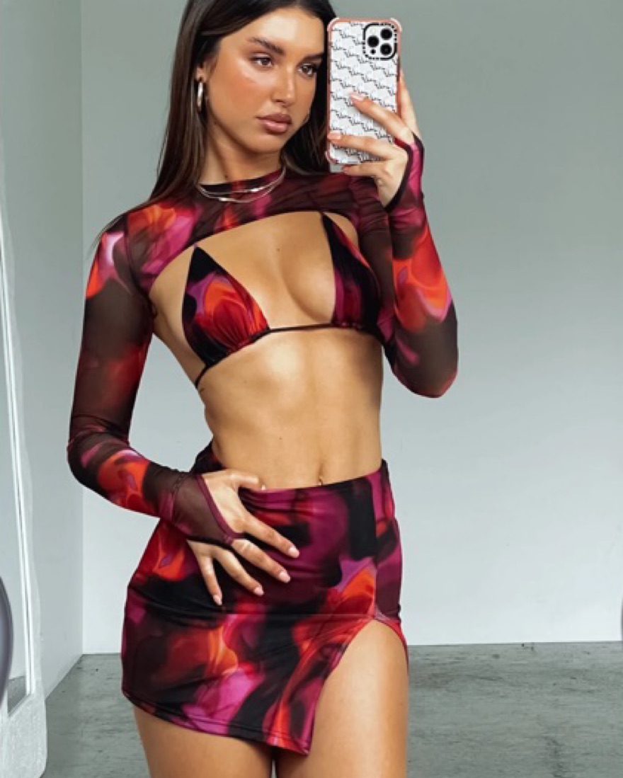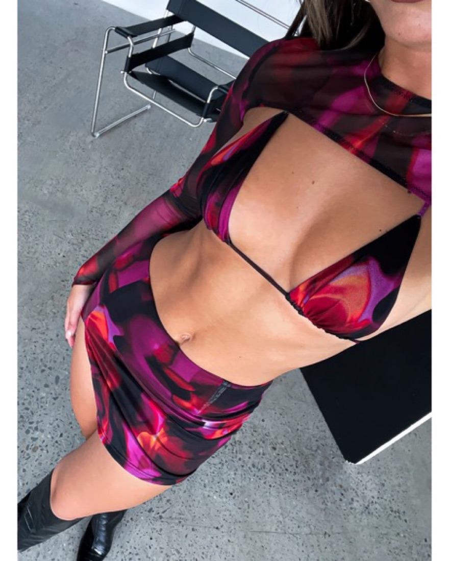 Features a mini skirt and a long sleeve/bra top combo. Both the top and the bottom are a size small. I will clean on my end upon return :) no longer sold rare find. Pilling throughout due to a careless renter.