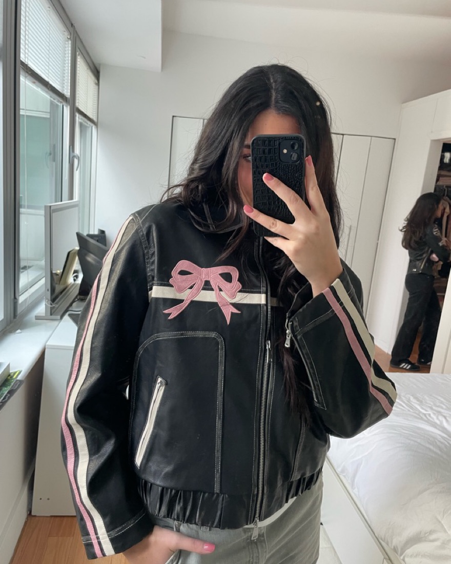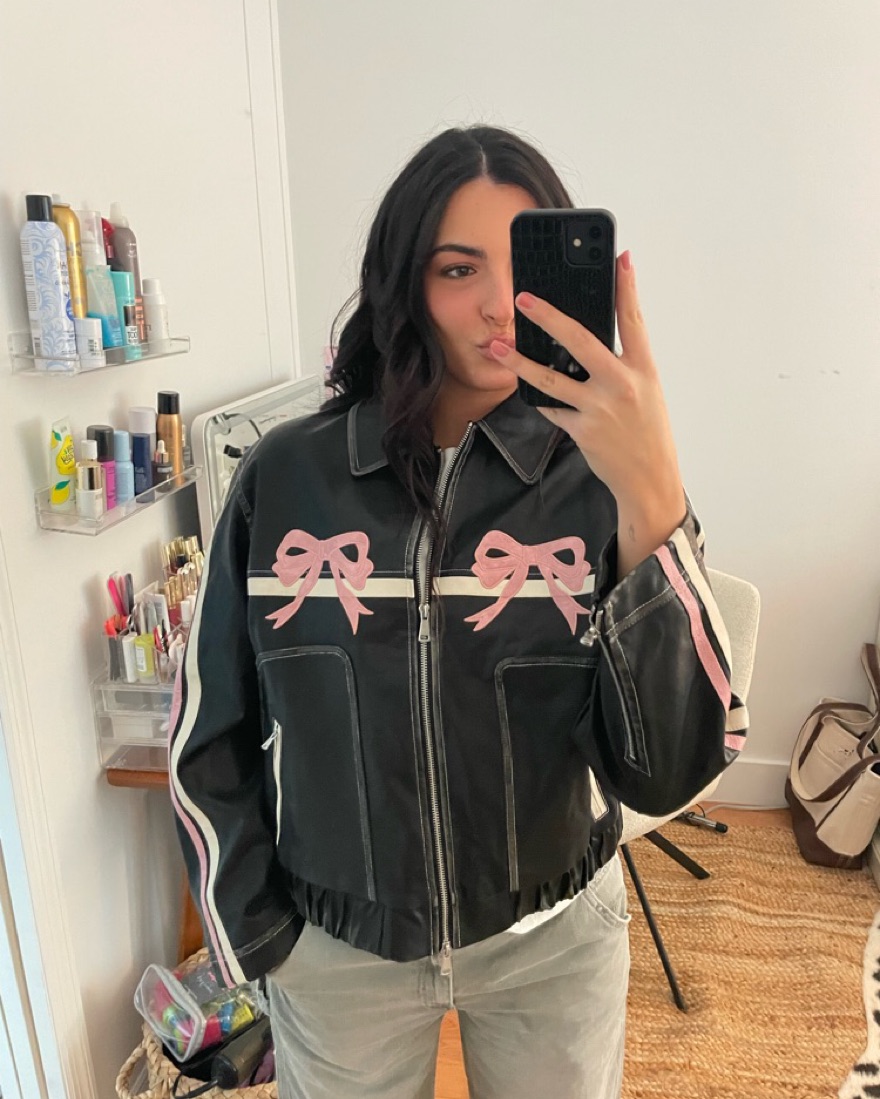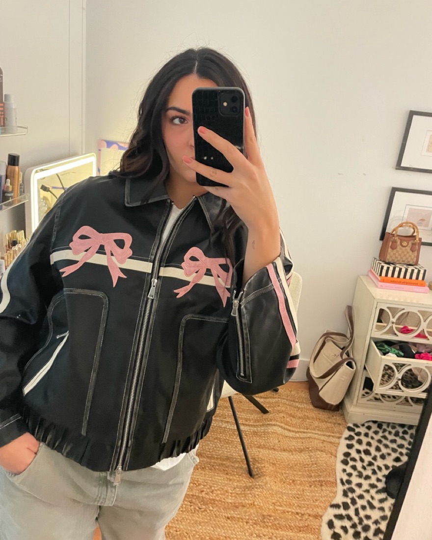 Super fun bow faux leather bomber jacket I’ve been seeing all over Instagram. I got a size Large and this fits perfectly oversized.