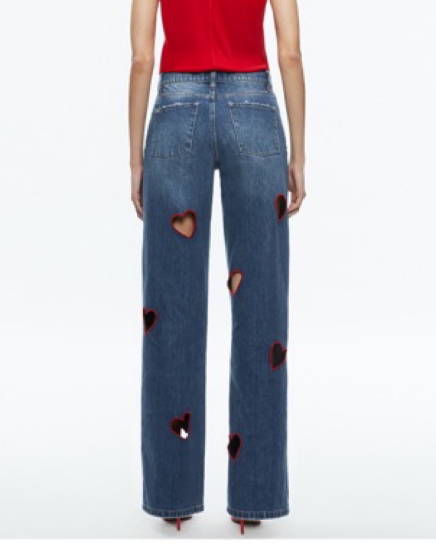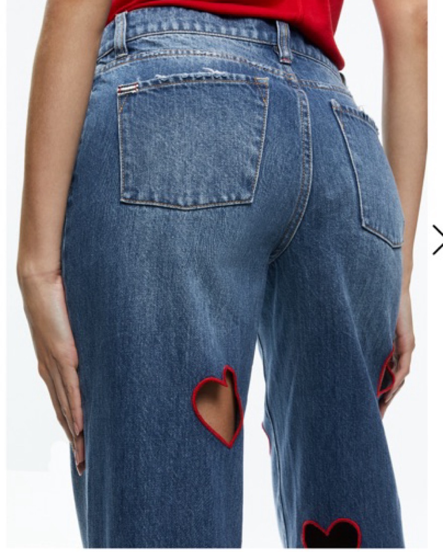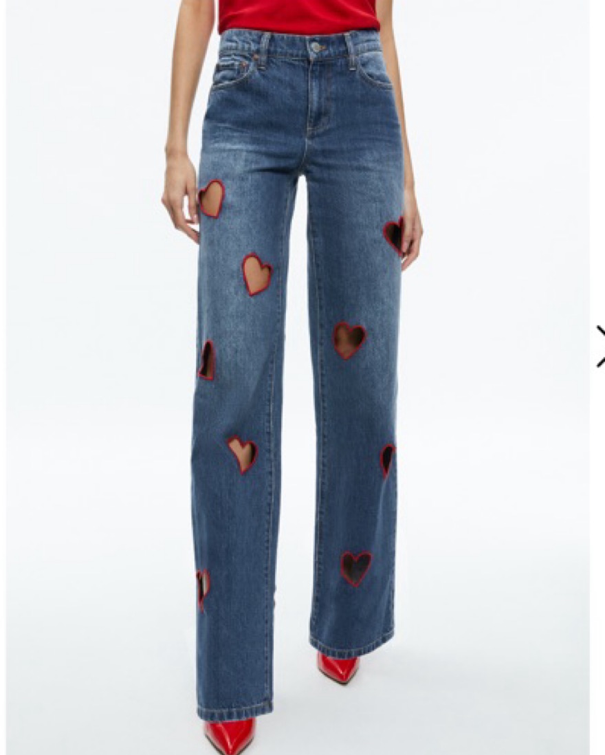 KARRIE EMBROIDERED HEART CUTOUT JEAN Straight leg jean Mid rise Embroidered heart cutouts Full length Belt loops Front button and zipper closure 100% cotton