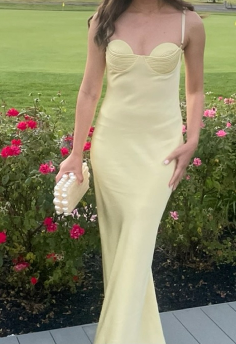 It was a gorgeous dress and fit like a glove! I’m 5’4” and typically an XS or 0 in dresses so it for perfectly. I was nervous before about the length but it was the perfect length and just lightly grazed the floor whole wearing heels. The color is the perfect pale butter yellow and was perfect for a black tie wedding this summer in Montecito.