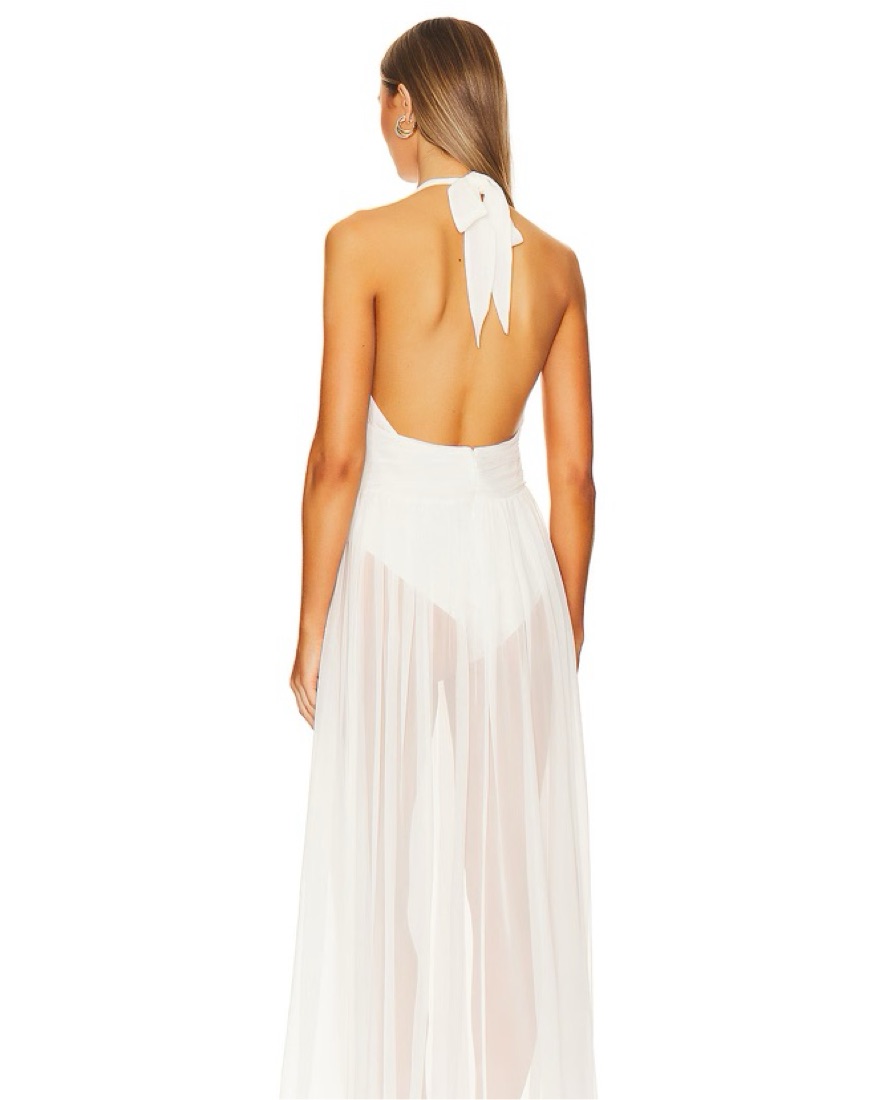 Gorgeous sheer gown with built in bodysuit for cocerage. Tie neck and low scoop back.