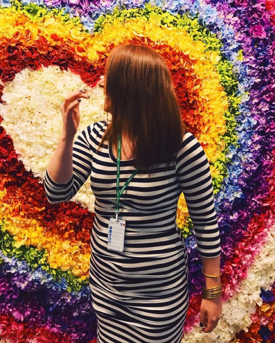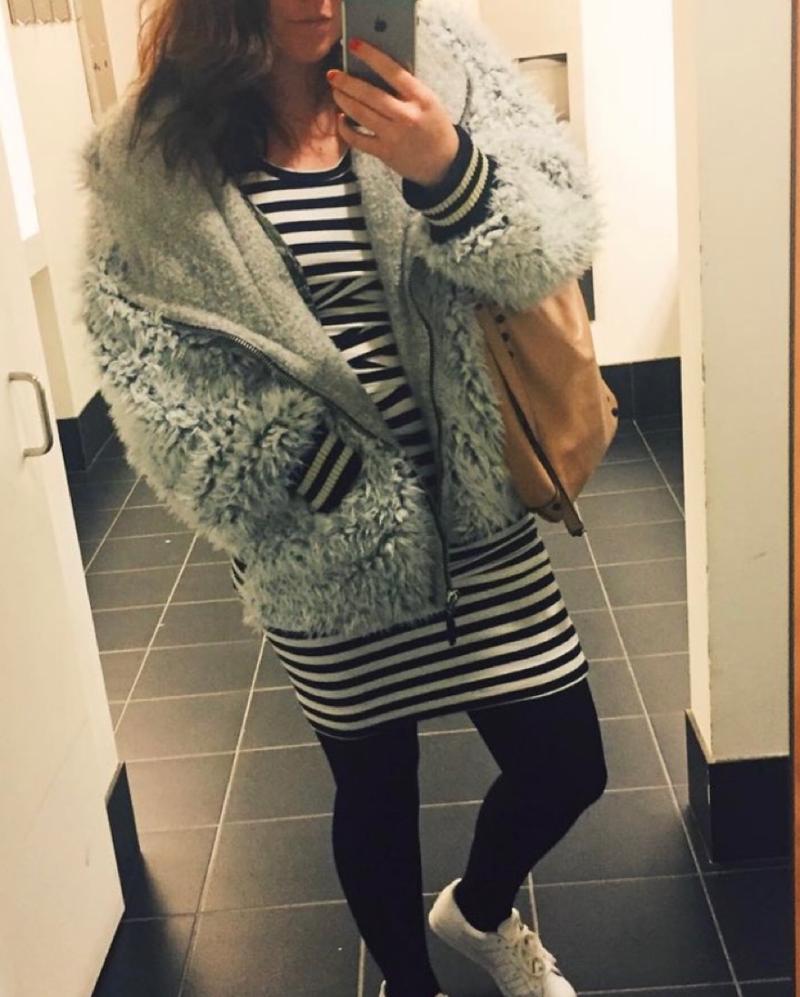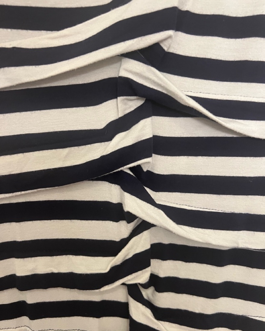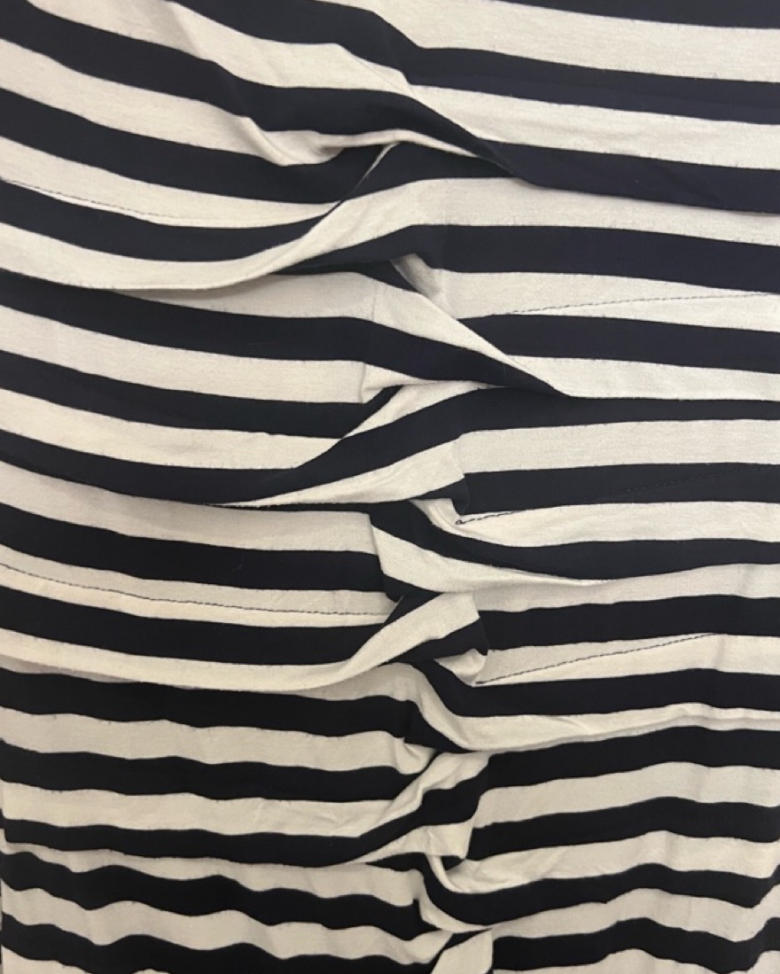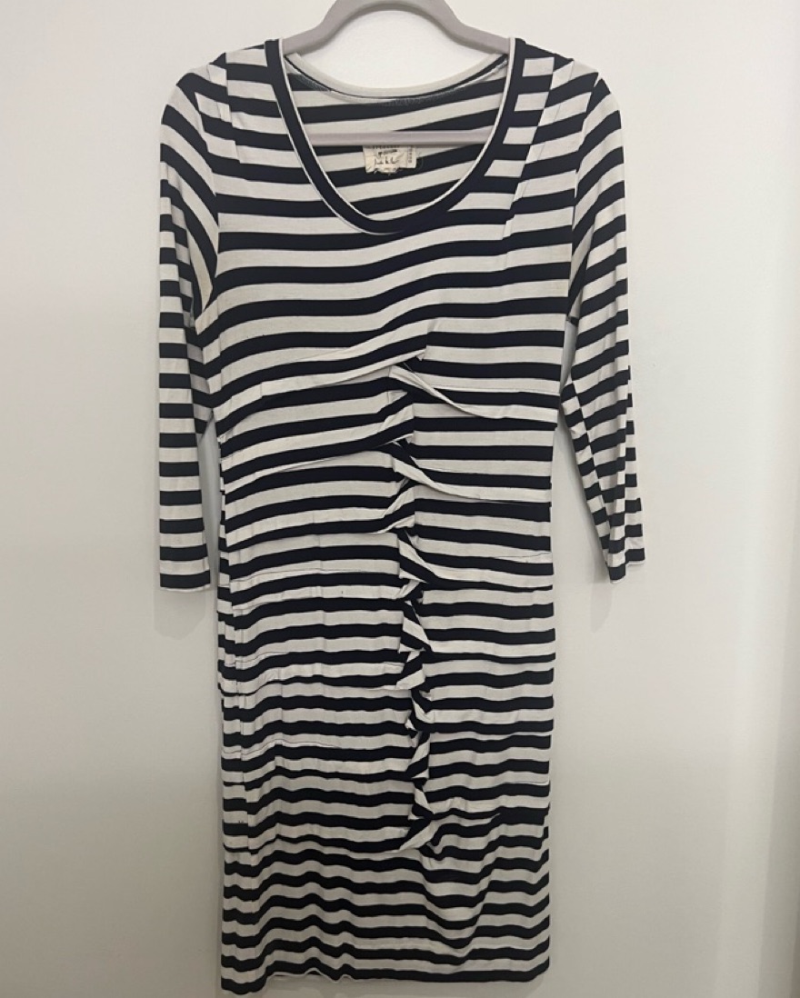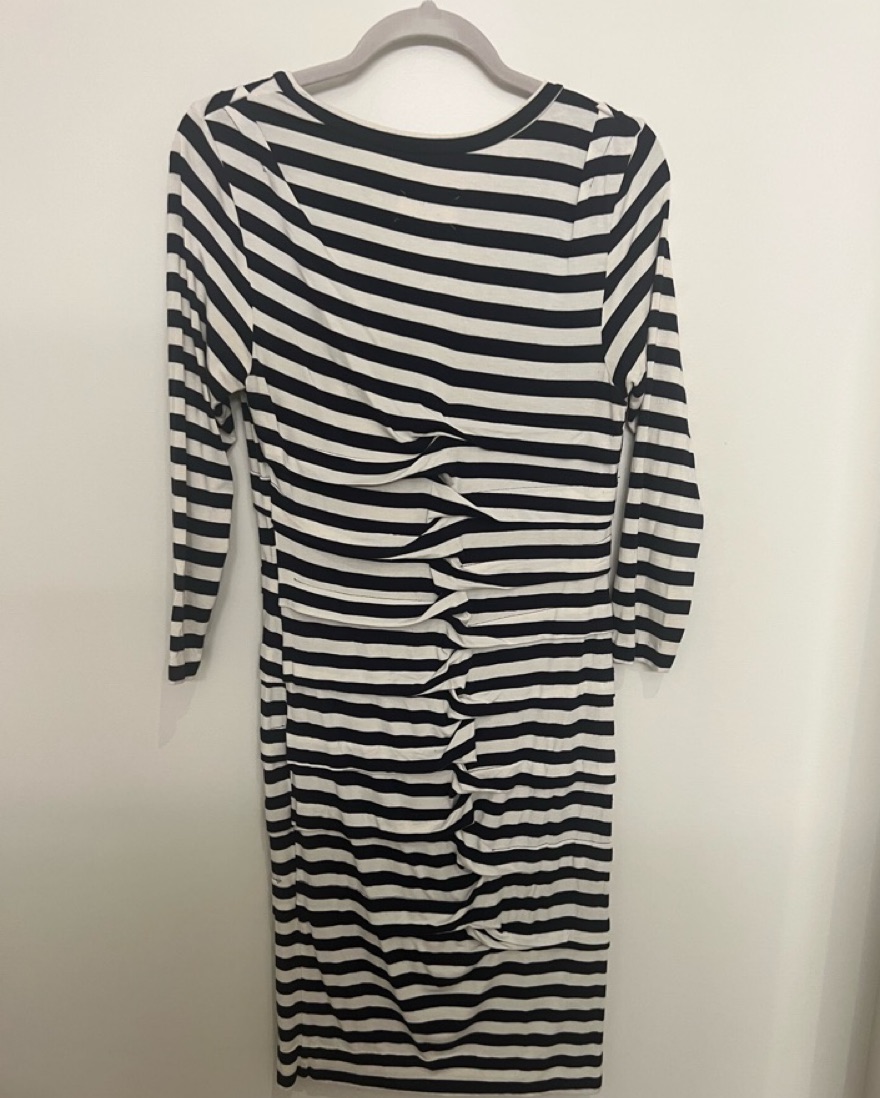 White and navy horizontal striped dress with pleated folds down the front and bottom middle. Scoop neck and 3/4 length sleeves. Stretchy/hugs your curves. Great for work, events, out to dinner or out to drinks. Artelier by Nicole Miller purchased at Anthropologie.