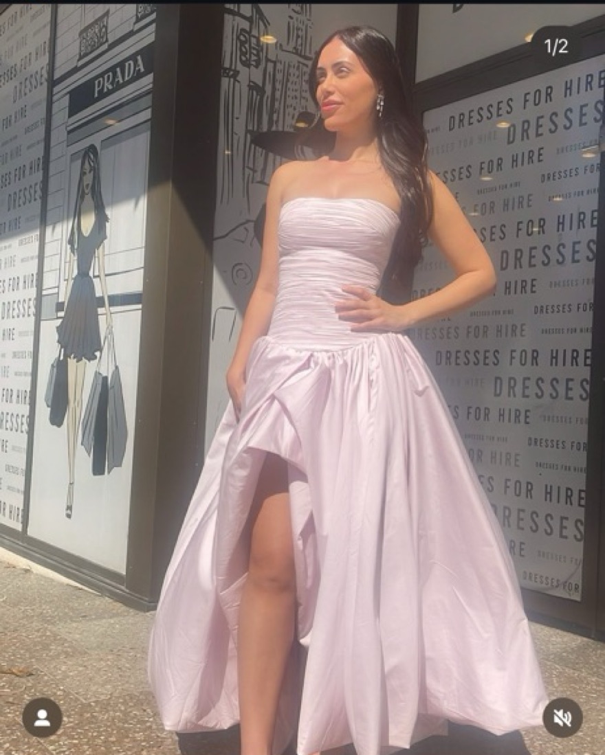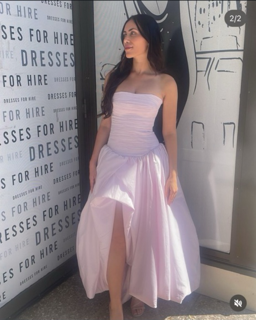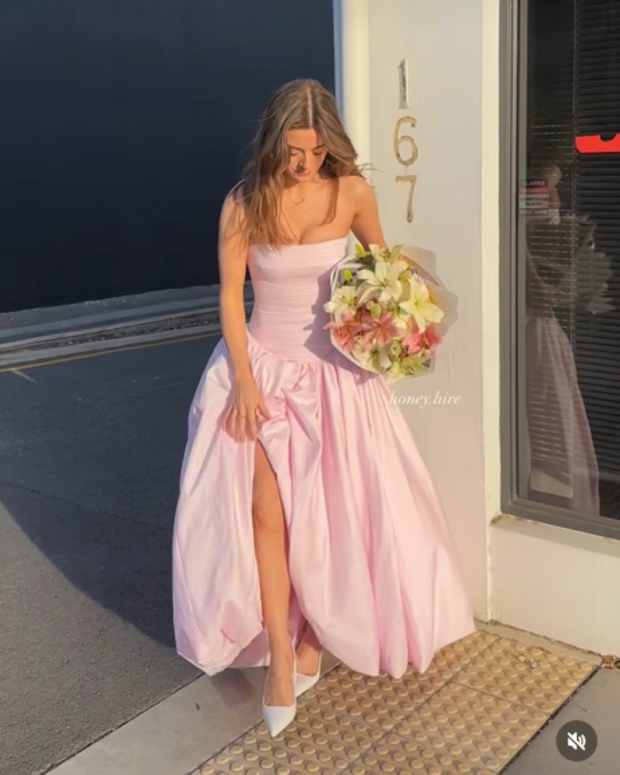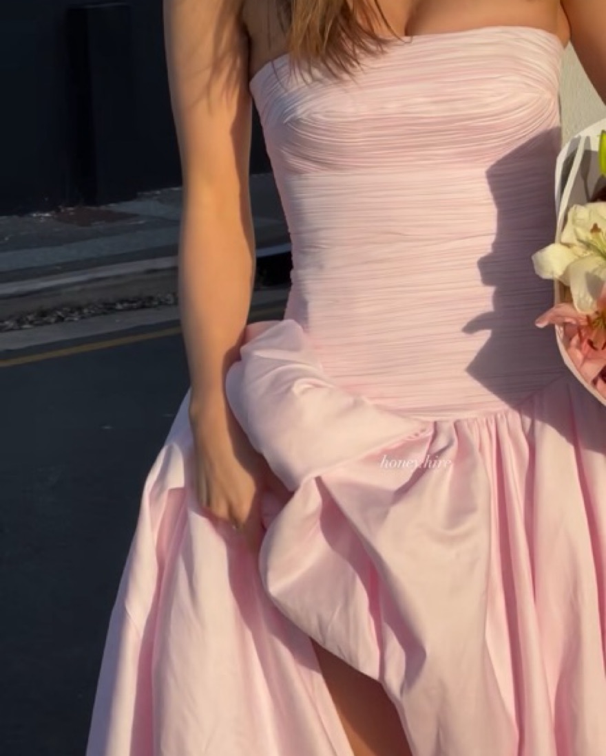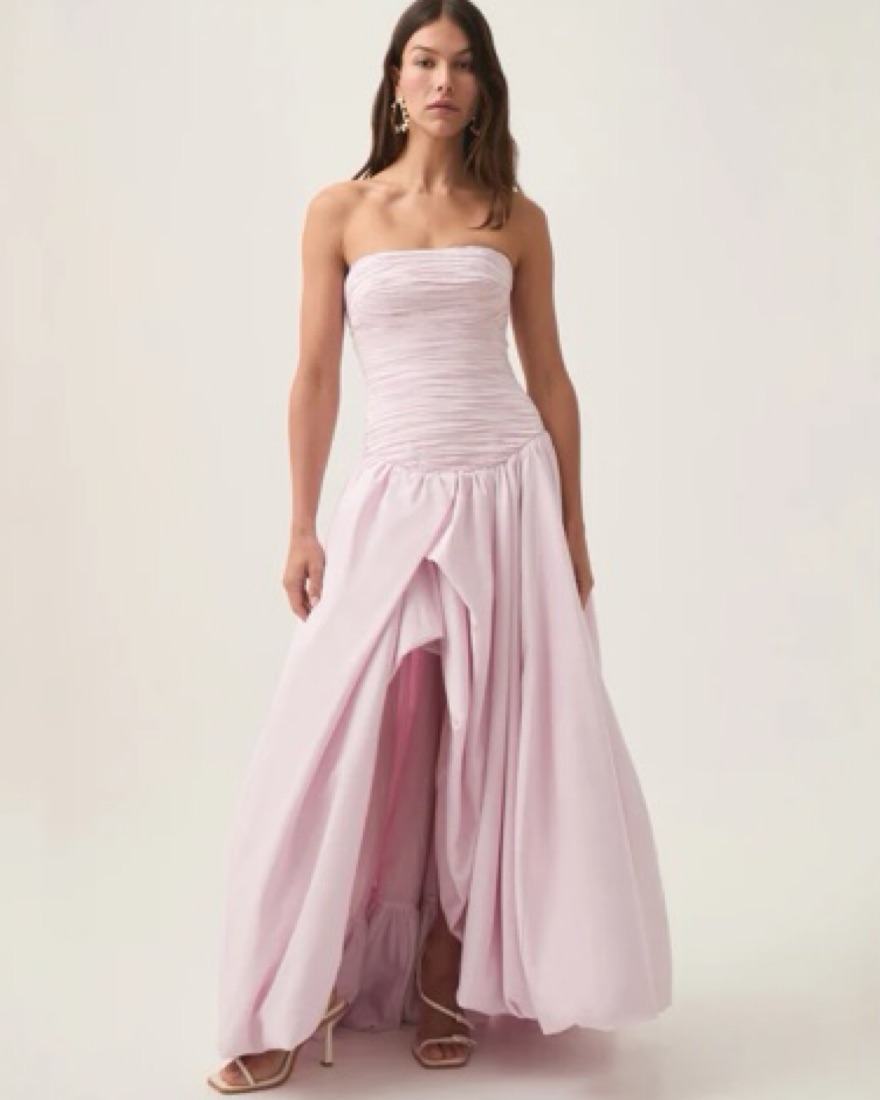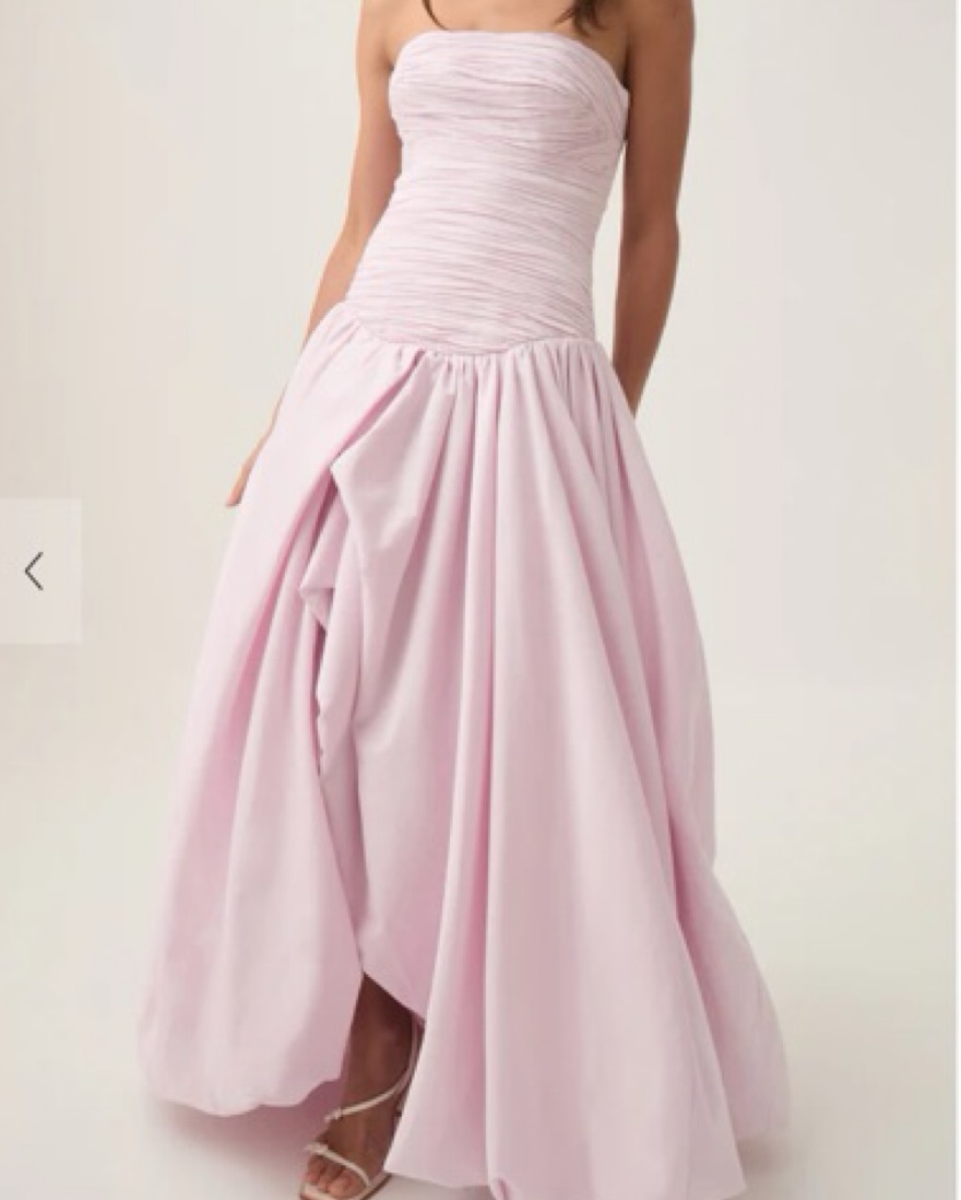 Straight neckline Fitted, ruched bodice Gathered skirt seam Draped full skirt Asymmetrical bubble hem Zip, hook and eye closure Lined
