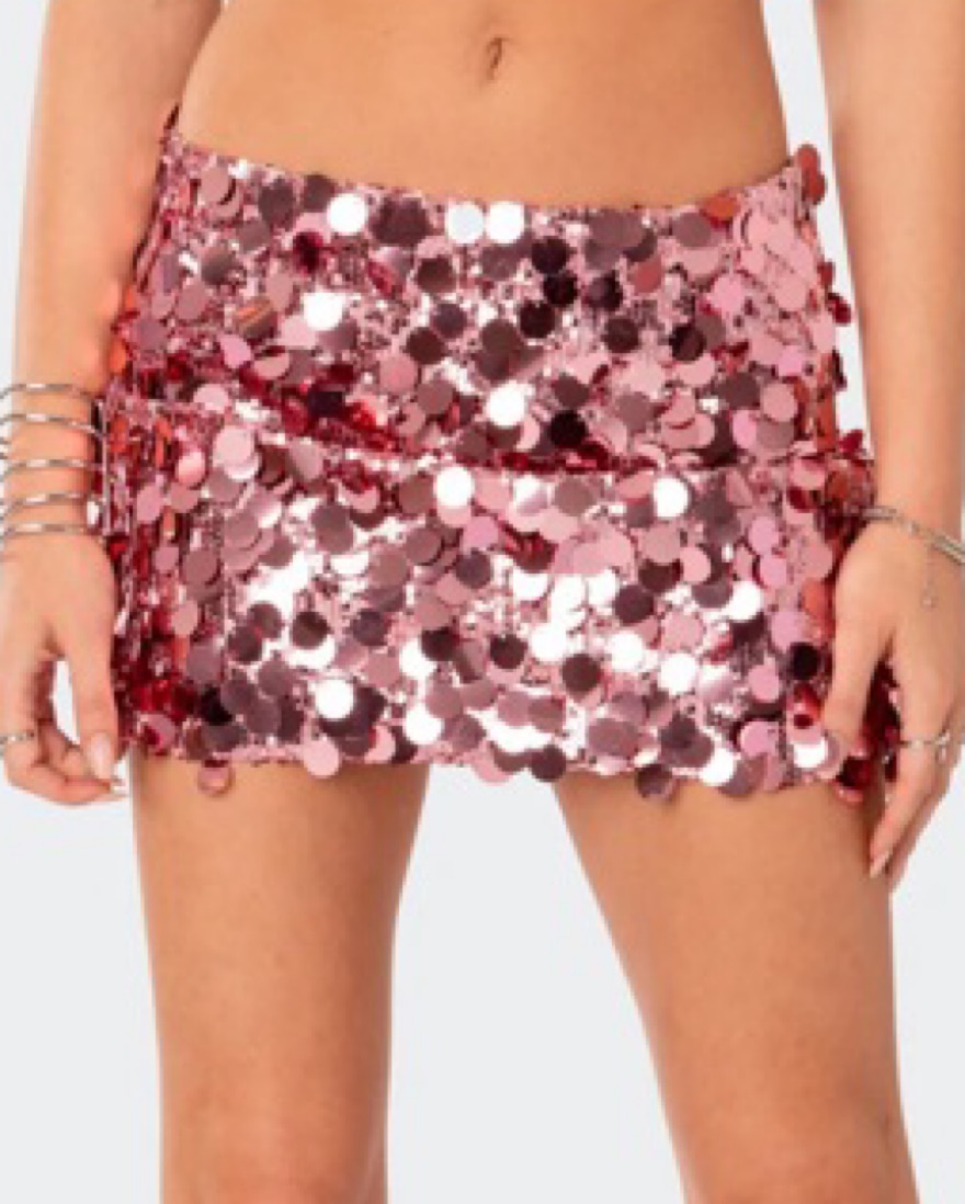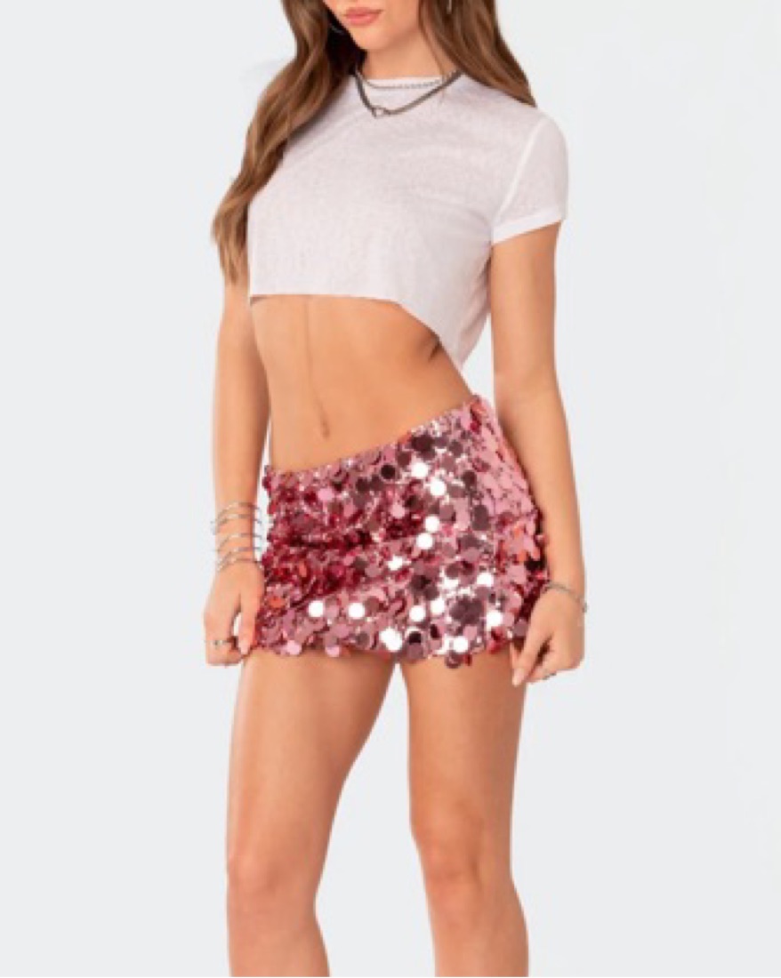 Pink sequin skirt from edikted (its like the dupe for the danielle guizo sequin skirt)! Perfect for costumes or even just going out 💖