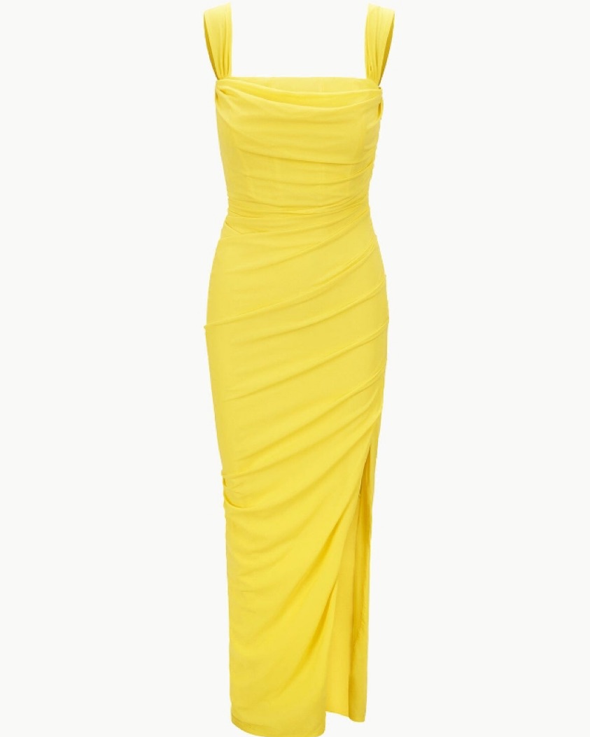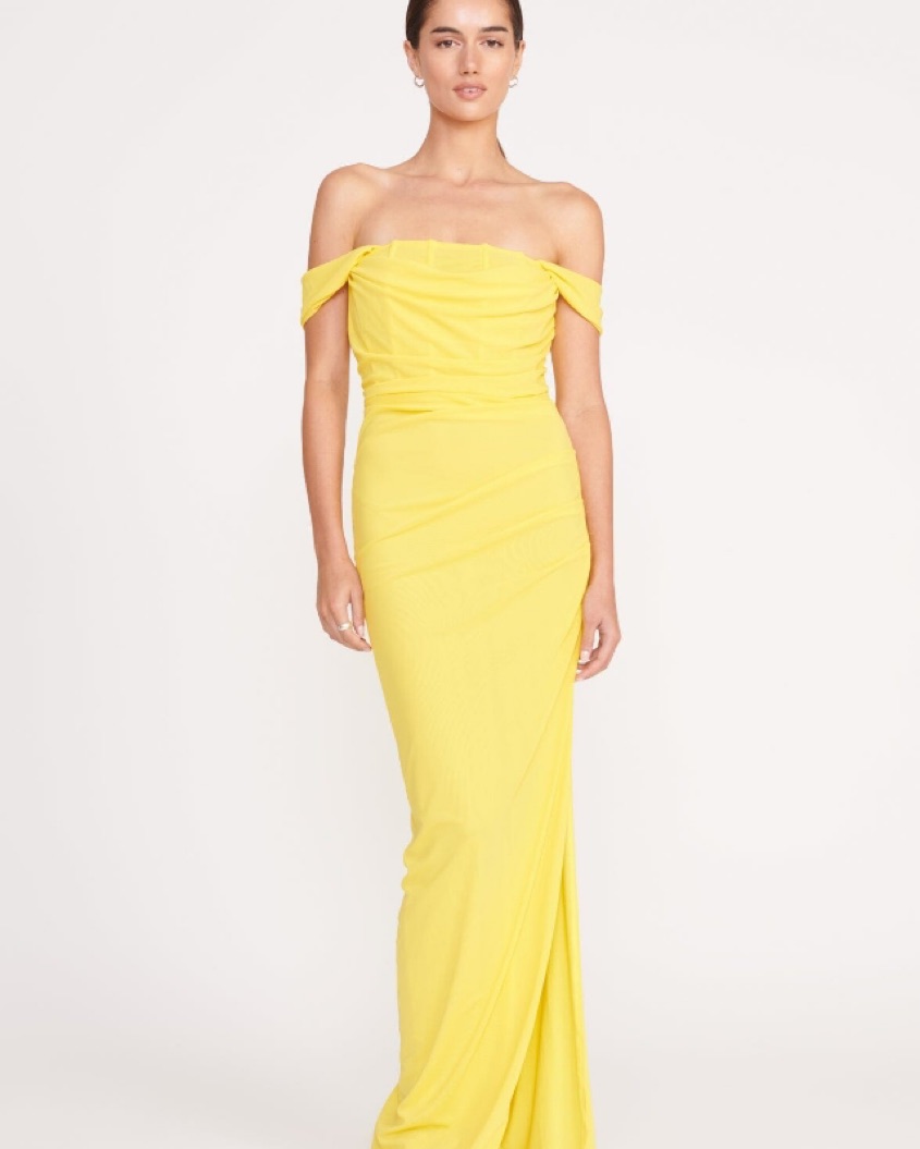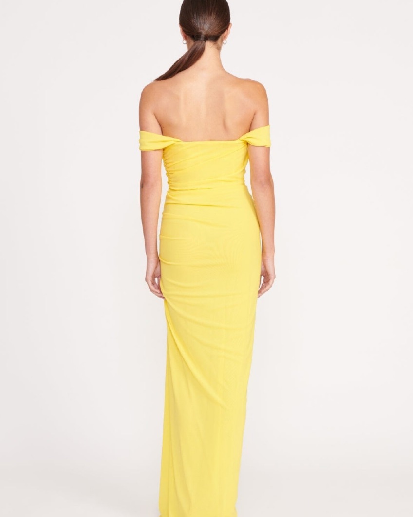 A fitted maxi gown constructed from a stretchy power mesh fabric. The Maxi Stormi dress features a draped silhouette, constructed corset top, draped sleeves and a side slit. This dress can be worn with sleeves off or over the shoulder.