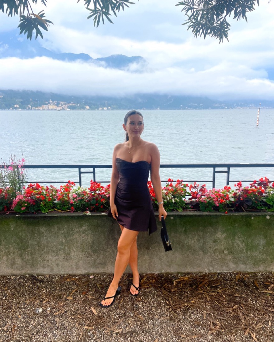 Chocolate brown strapless satin cocktain dress with ruching detail.