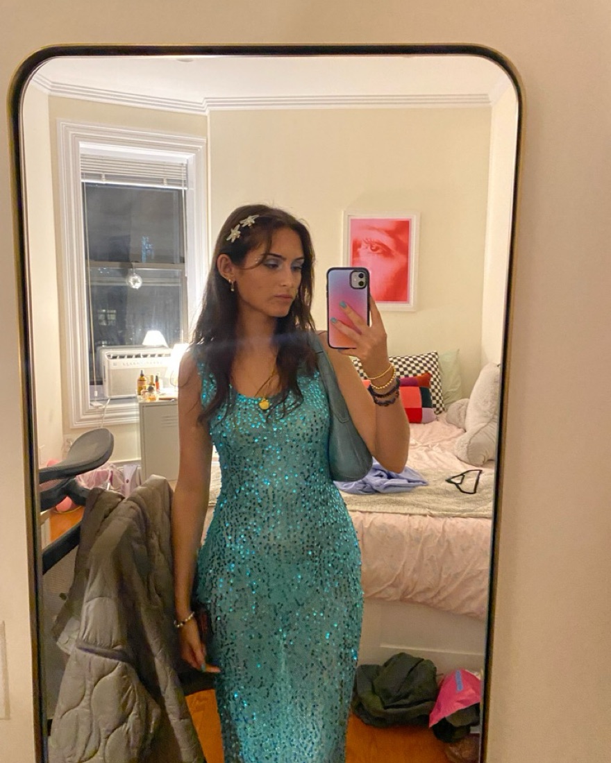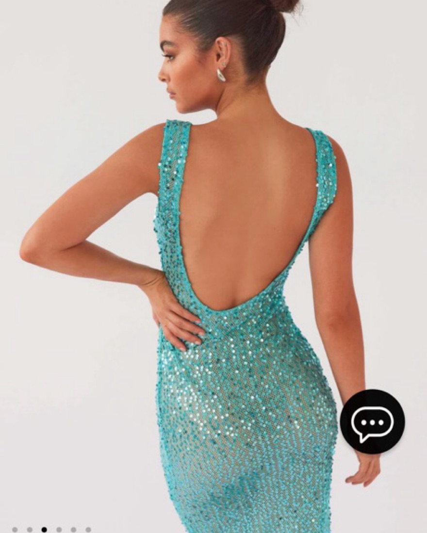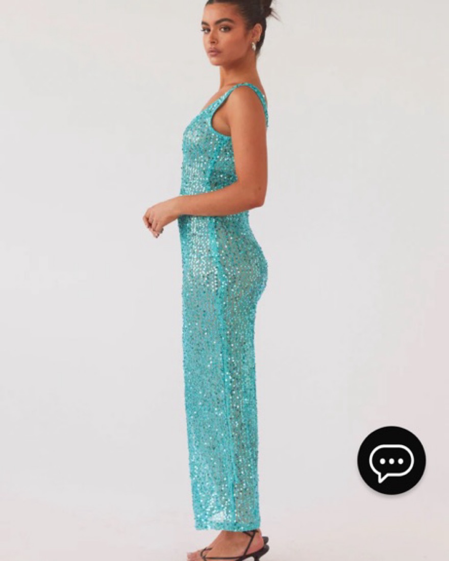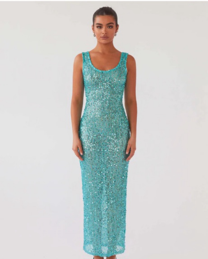 Peppermayo Sweet Essence Maxi Dress - Crystal. Wore this for halloween last year as a mermaid/siren! Also a great bathing suit coverup or going out look. Super cute blue sequin dress, just the right amount of sheer, and cute low back detail.
