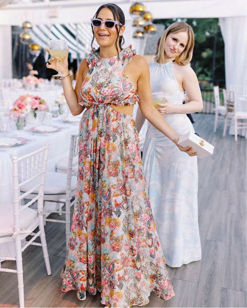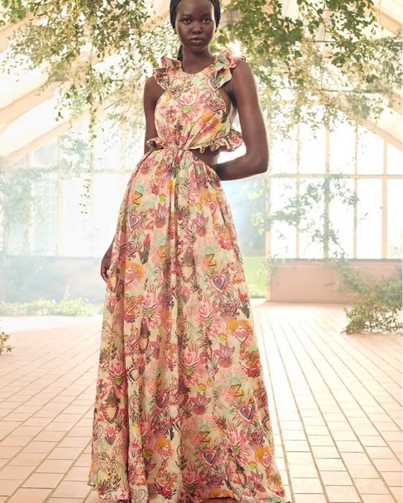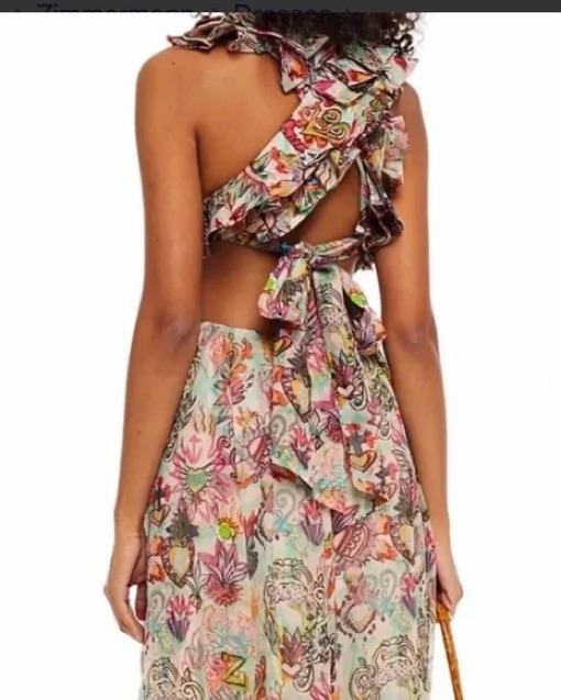 Zimmermann Floral Gown perfect for any summer wedding or black tie event! Back can be tied both as a cross or behind, floral pattern mostly pinks, blues, oranges on a white base. Zimmermann Size 2 (US M / 6-8)
