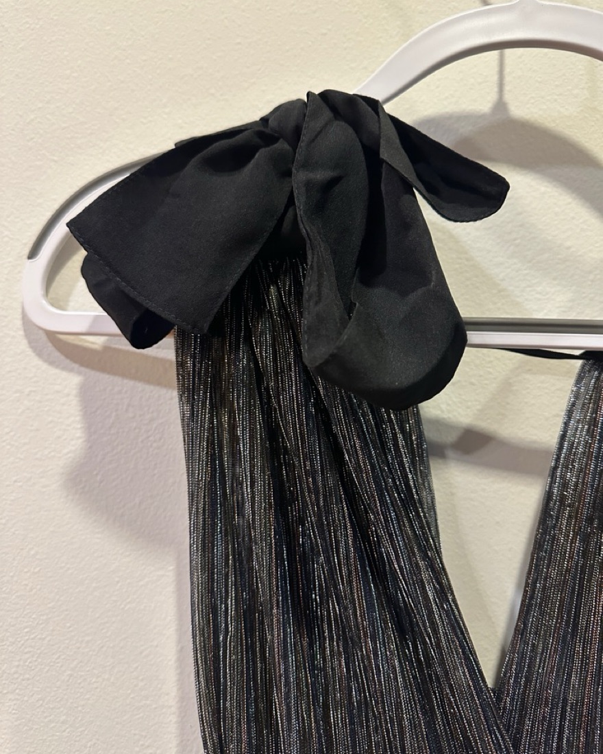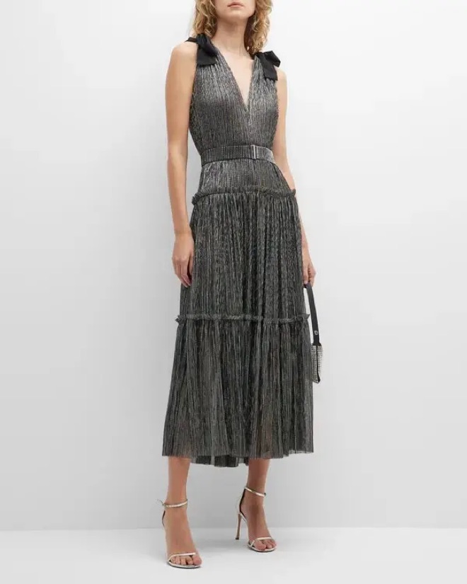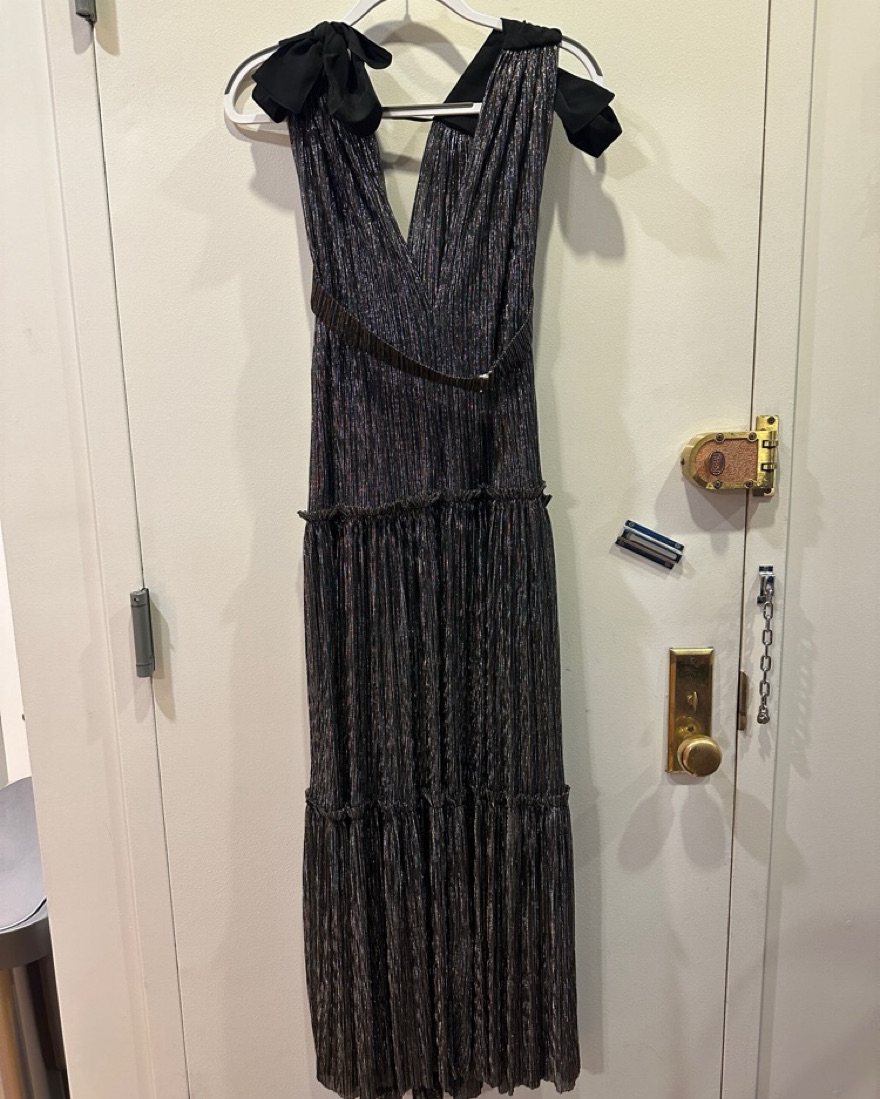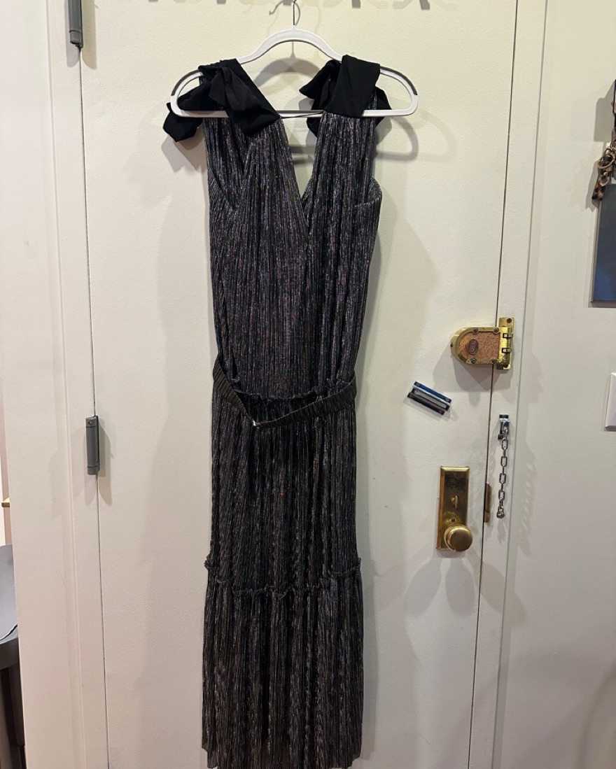 This Sabina Musayev dress has only been worn twice and is in perfect condition! Its the perfect statement dress. Has a closure in the front, and super cute bow tie accents on the shiukders. It has a back cutout and metallic details throughout the fabric. Comes with a detachable belt.