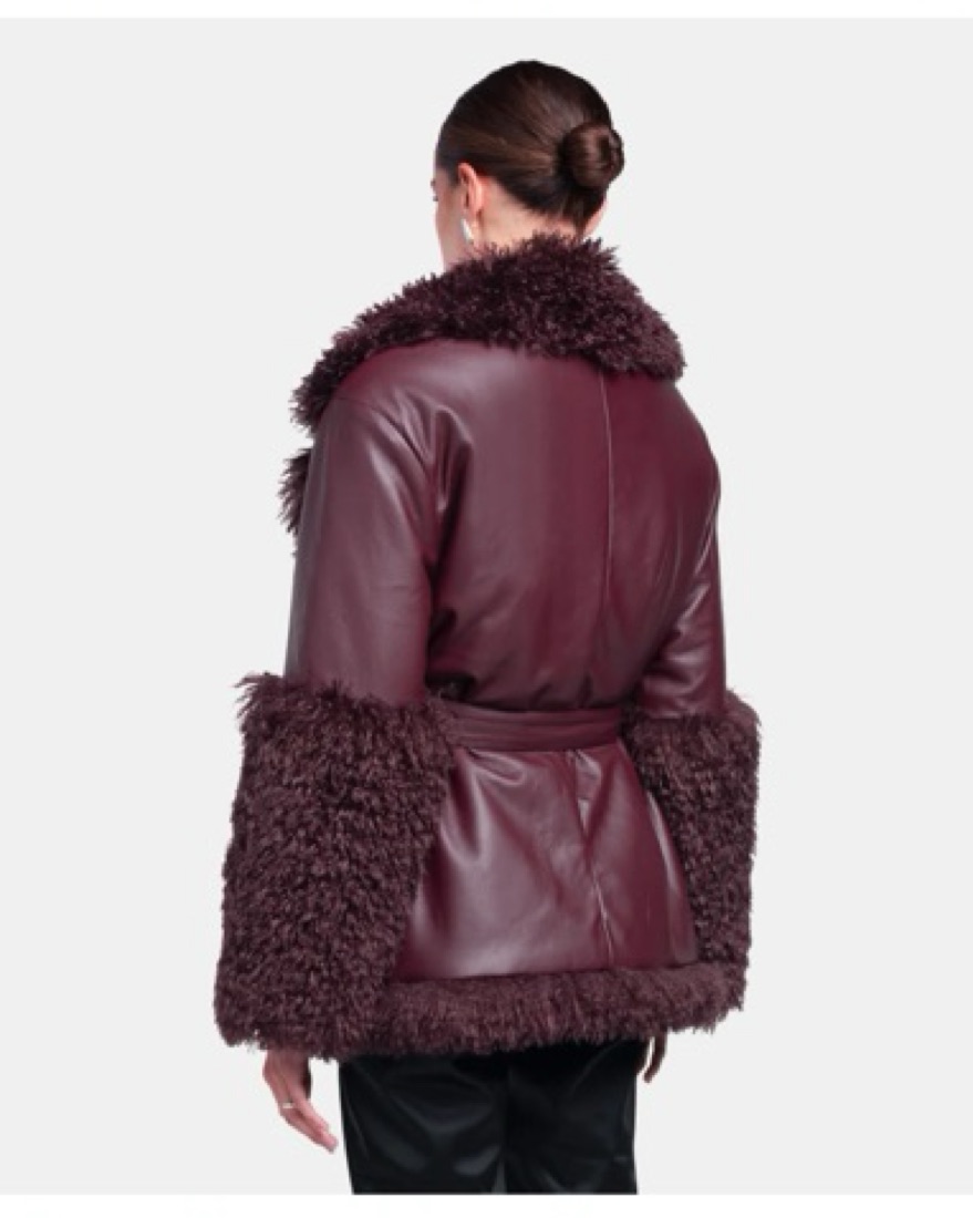 The THORA Jacket is a luxurious burgundy masterpiece crafted from the softest PU leather, enriched with sumptuous faux fur in a rich bordeaux color. This statement piece not only keeps you warm but also elevates your style game. Perfect for winter activities tags: fur coat, statement coat, burgundy