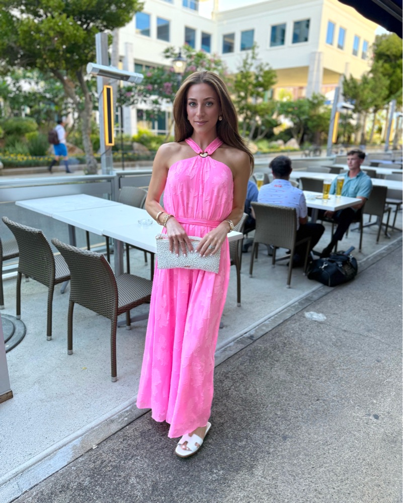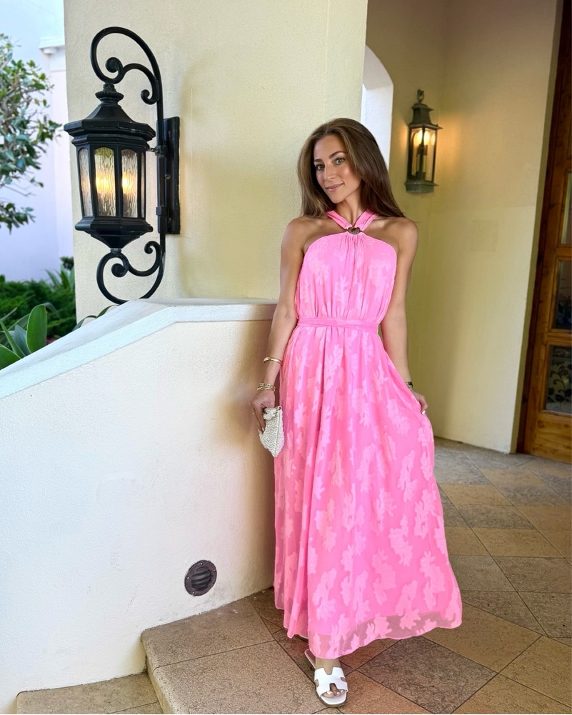 Swing fit, halter maxi dress with gold shell hardware and a separate sash.