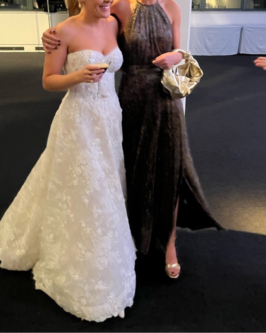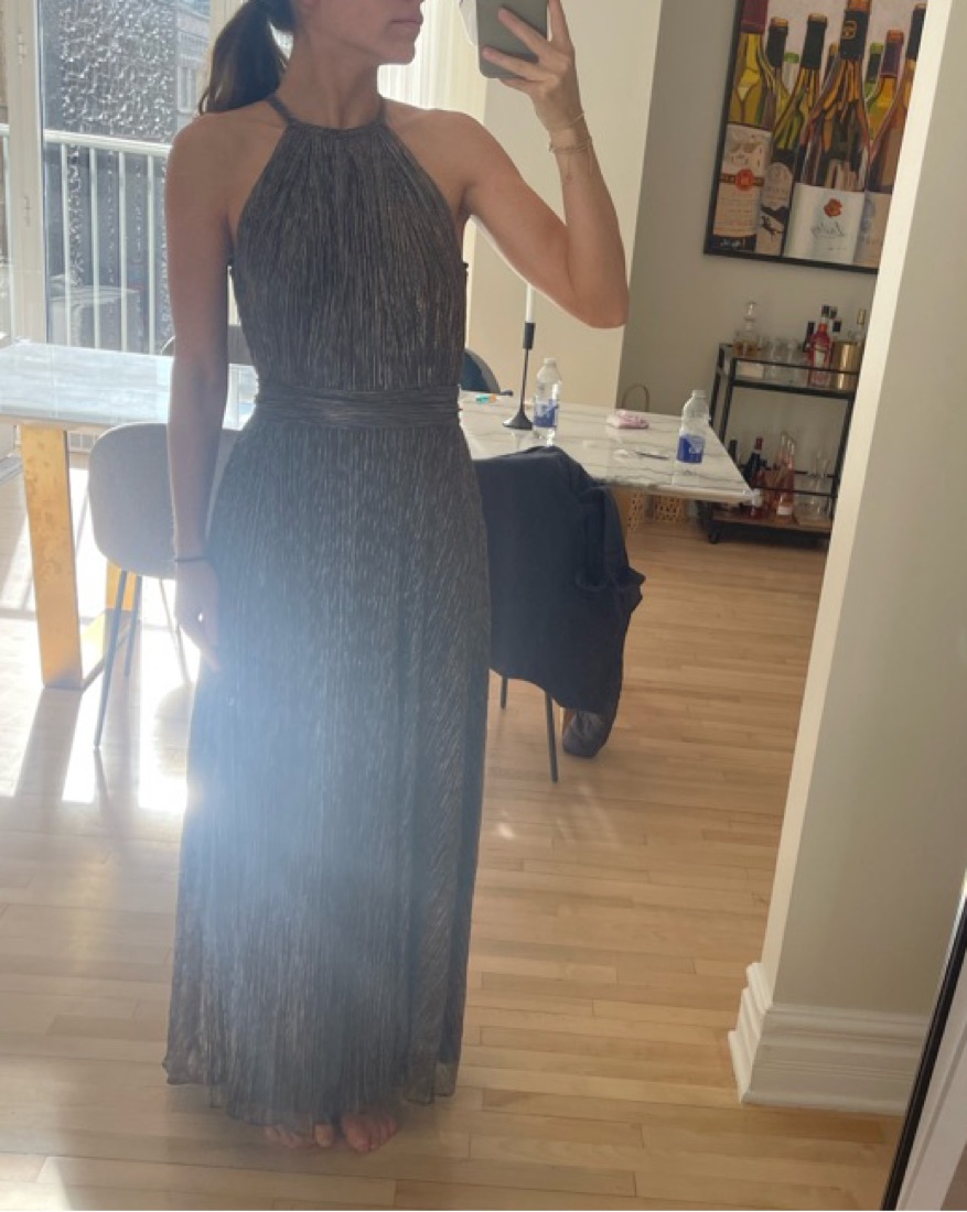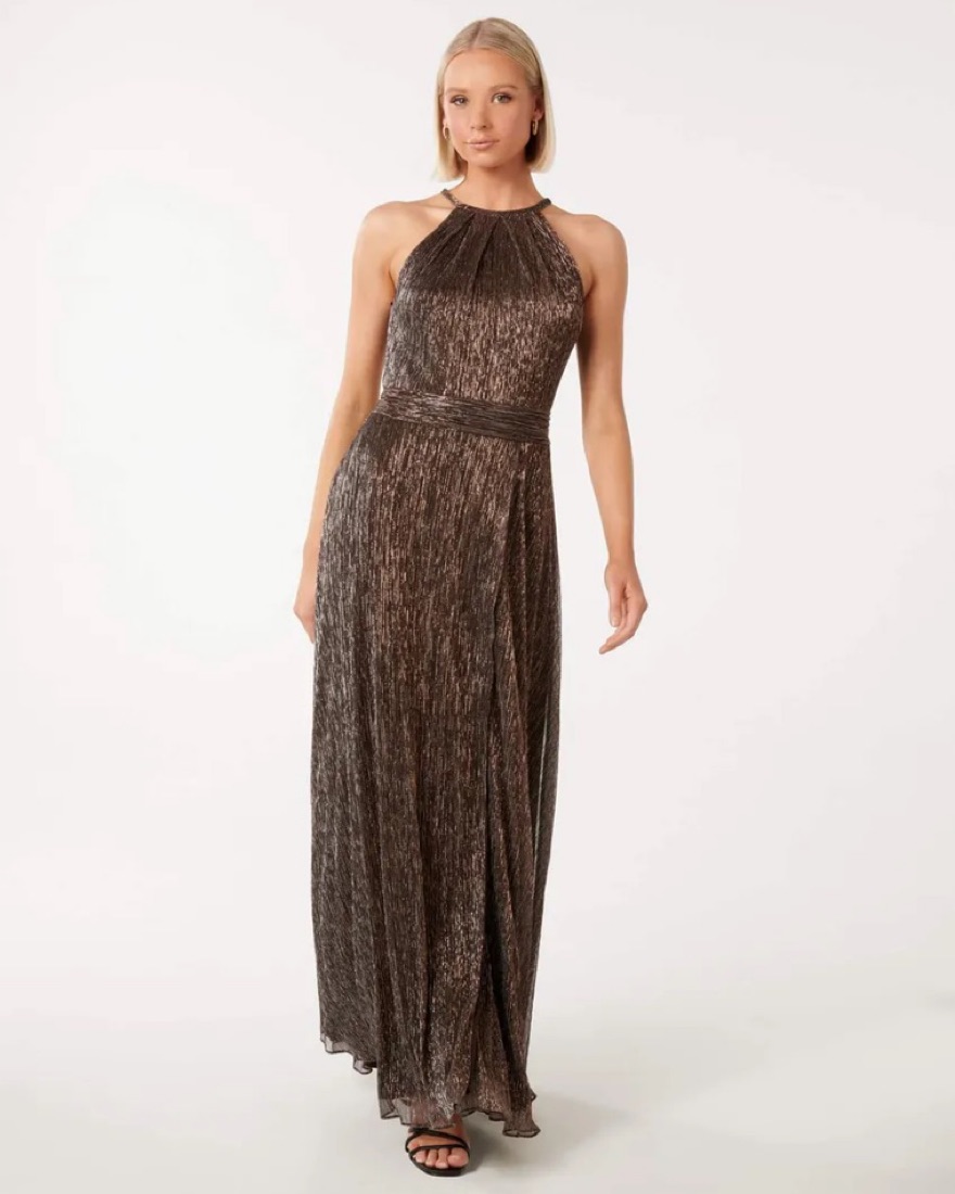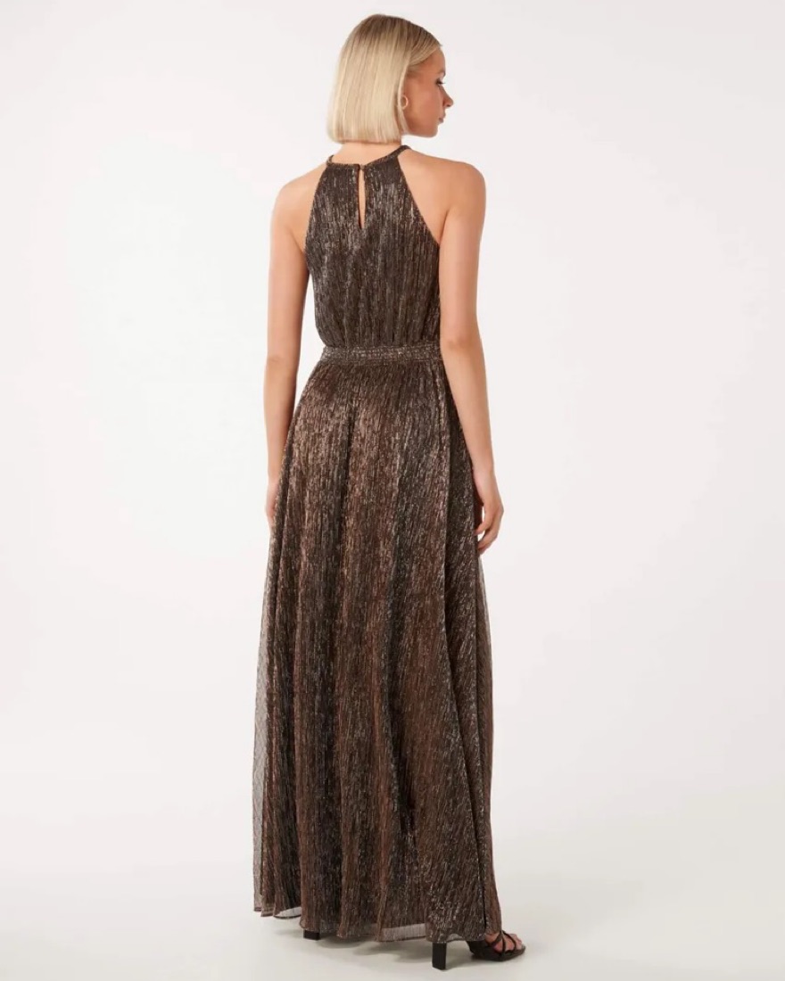 A breezy, shimmery dress perfect for any occasion with a waistband for clinched effect and halter neckline. Worn once to a wedding! Super comfortable! Length: 133.3cm