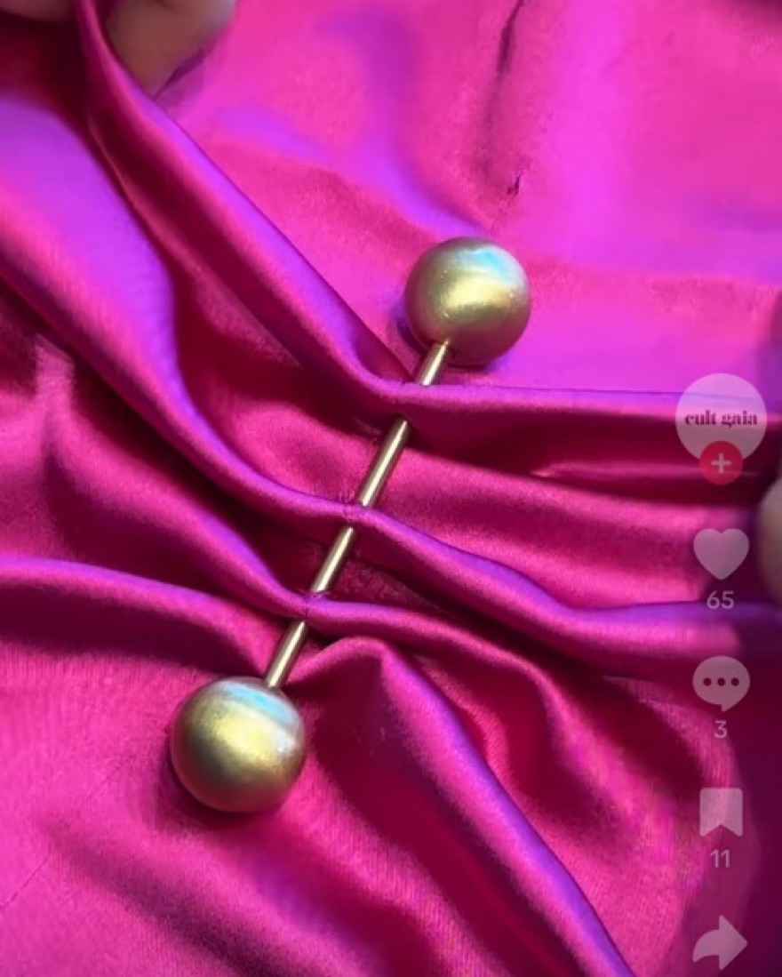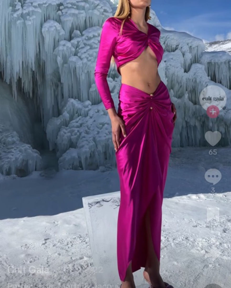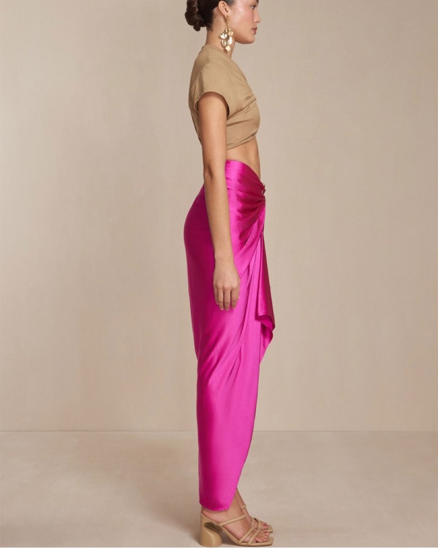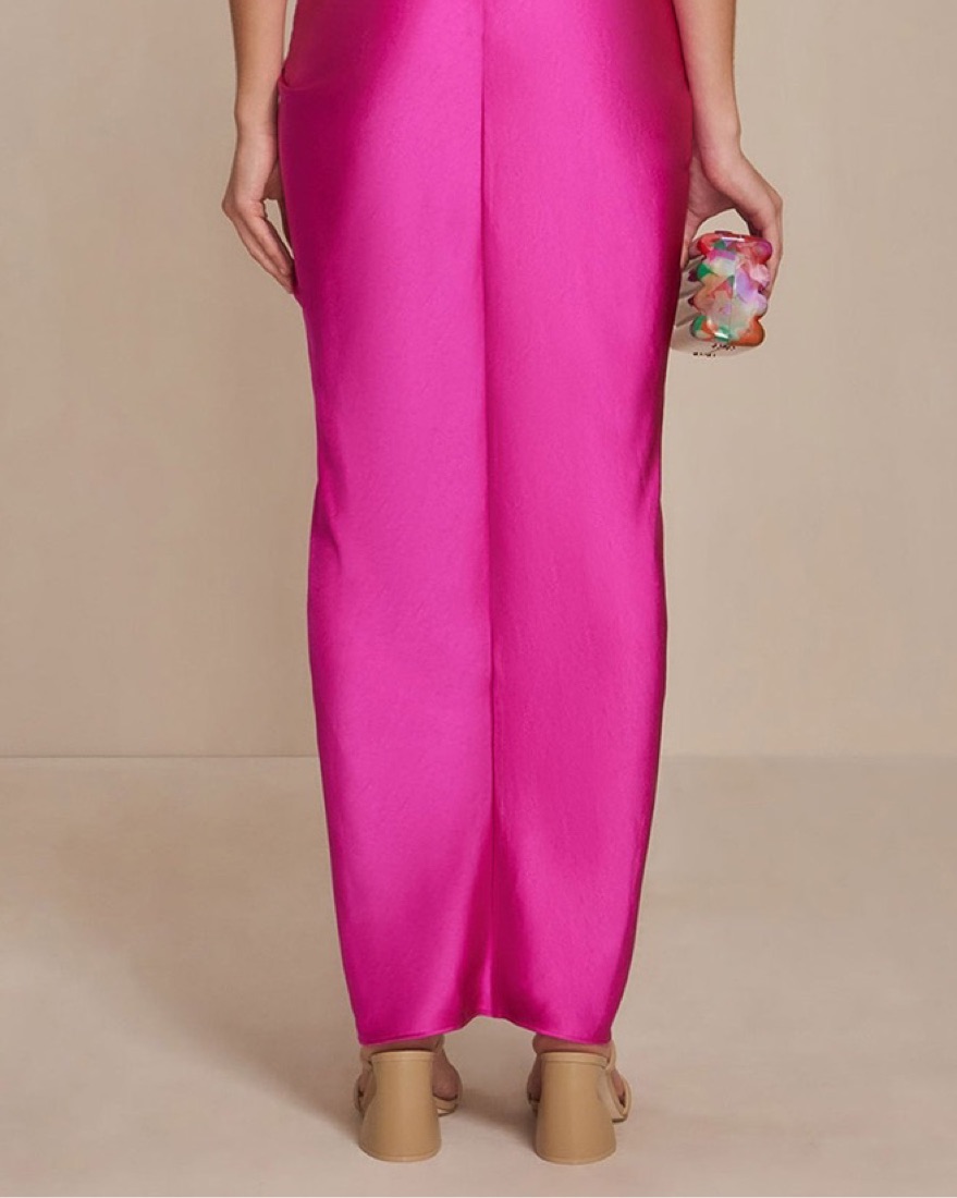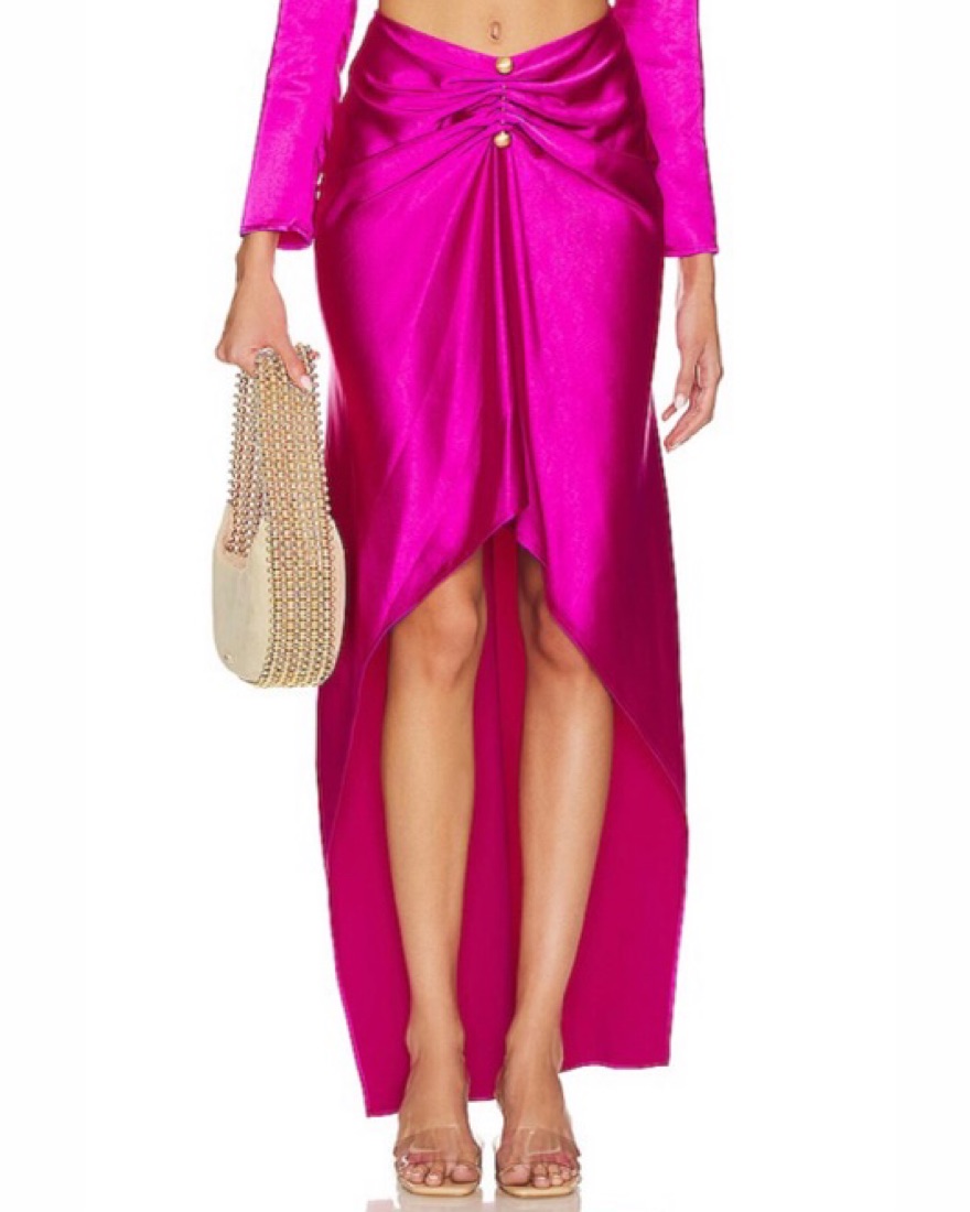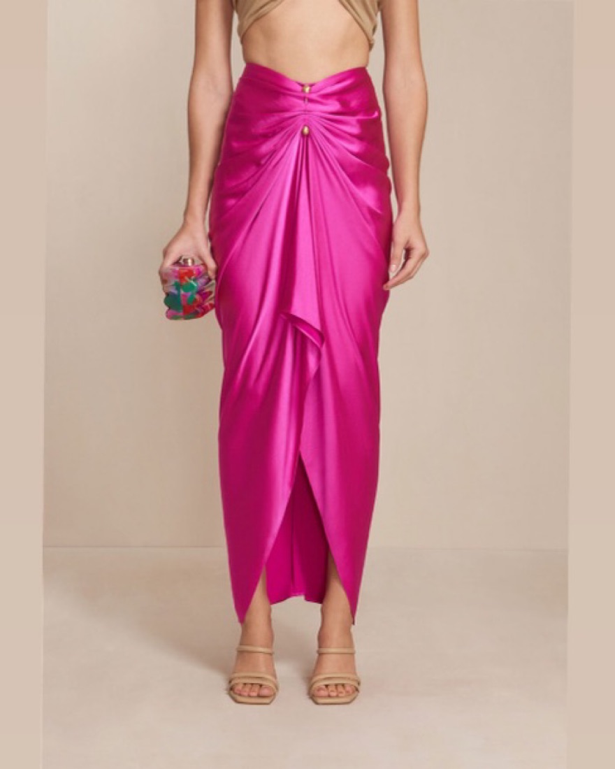 Hot pink silk high low maxi skirt with gold detail in front. Revolve model (image with white background) is wearing a size small